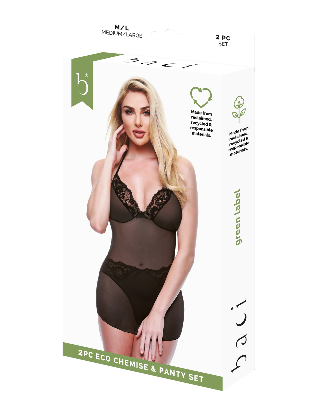 Con Baci, el lujo ecológico se une a un encanto irresistible en la nueva colección Green Label. Este impresionante conjunto de camisas y bragas está confeccionado con materiales sostenibles y reciclados que no comprometen el estilo ni la comodidad. La camisa corta, en un elegante negro medianoche, presenta una malla suave y transparente que roza tus curvas sin esfuerzo, mientras que los delicados detalles de encaje agregan un toque de sofisticación. La braga a juego ofrece un fit favorecedor, diseñado para complementar perfectamente la camisa para un look coordinado y seductor. Con su construcción ecológica y su diseño seductor, este conjunto está destinado a ser tu favorito tanto por su belleza como por su sostenibilidad. Disponible en tamaño S/M, M/L/, Queen.