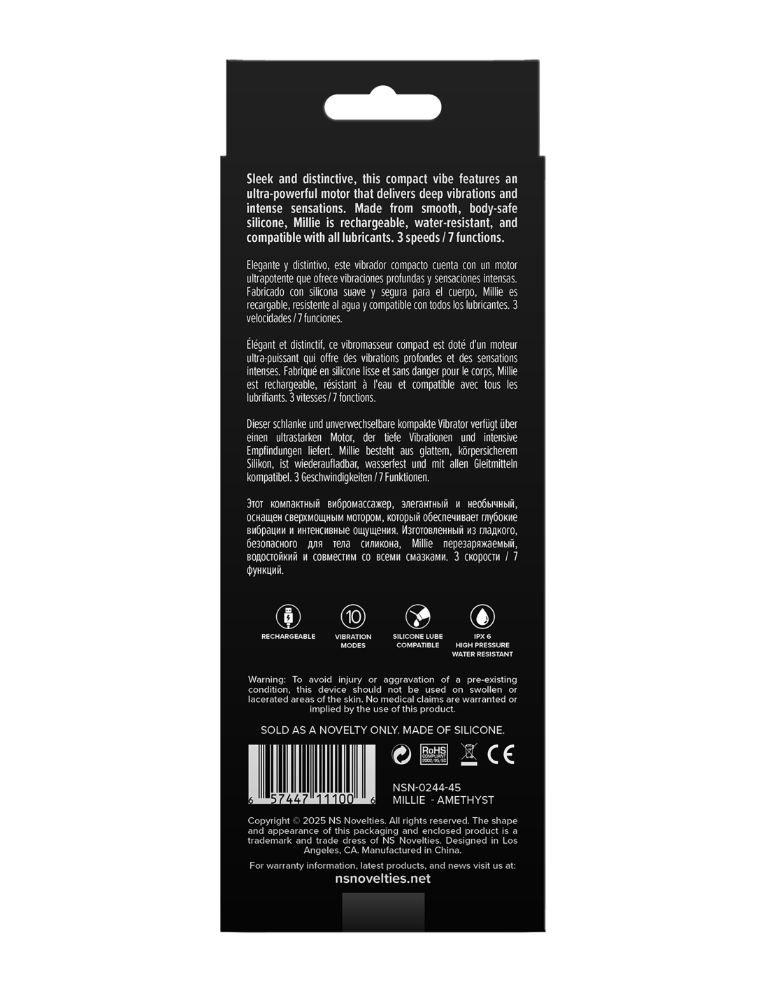 Elegante y distintivo, este vibrador compacto cuenta con un motor ultrapotente que ofrece vibraciones profundas y sensaciones intensas. Hecho de silicona suave y segura para el cuerpo, Millie es recargable, resistente al agua y compatible con todos los lubricantes.