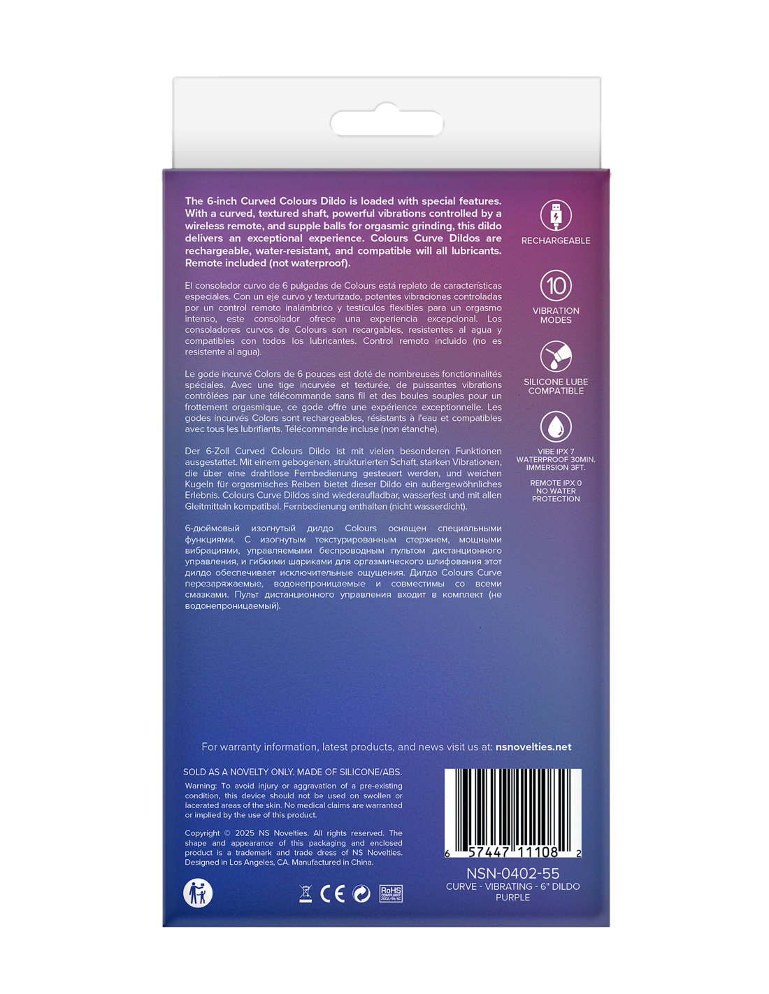 El consolador de colores curvos de 6 pulgadas está cargado de características especiales. Con una shaft curva y texturizada, potentes vibraciones controladas por un mando a distancia inalámbrico y bolas flexibles para un molienda orgásmica, este consolador ofrece una experiencia excepcional. Los consoladores Colours Curve son recargables, resistentes al agua y compatibles con todos los lubricantes. Control remoto incluido (no resistente al agua).