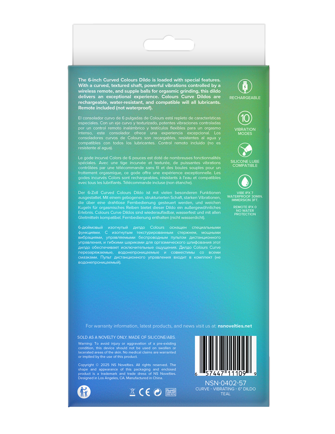 El consolador de colores curvos de 6 pulgadas está cargado de características especiales. Con una shaft curva y texturizada, potentes vibraciones controladas por un mando a distancia inalámbrico y bolas flexibles para un molienda orgásmica, este consolador ofrece una experiencia excepcional. Los consoladores Colours Curve son recargables, resistentes al agua y compatibles con todos los lubricantes. Control remoto incluido (no resistente al agua).