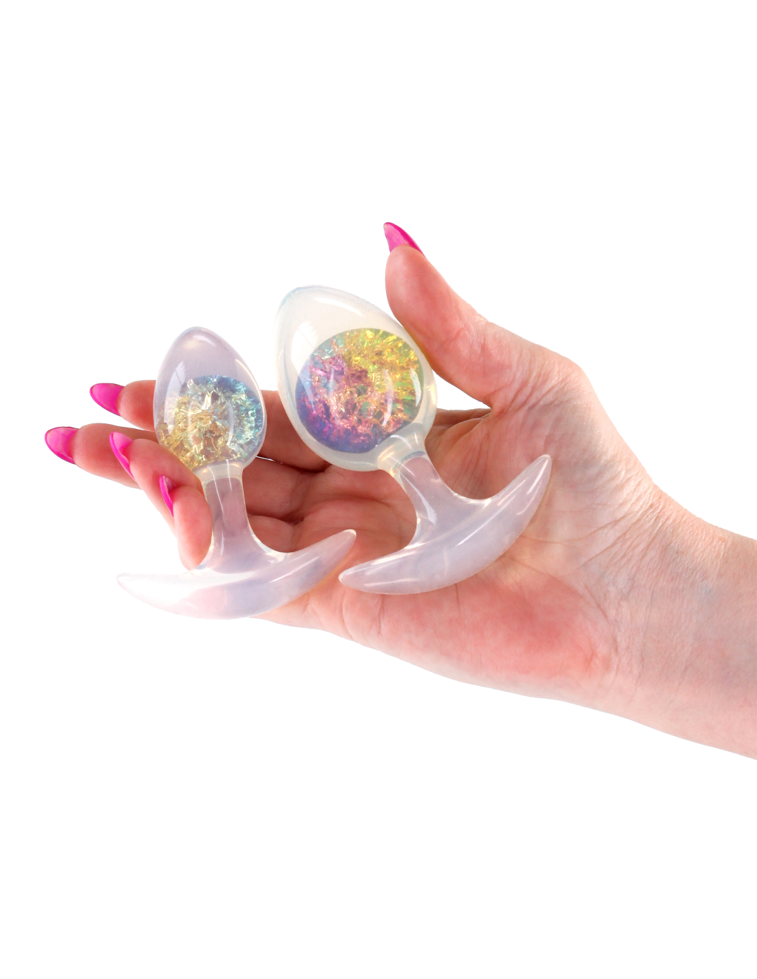 Despega hacia el placer con Cosmic Glams. Hecho de silicona líquida segura para el cuerpo, cada enchufe presenta una canica de vidrio interna brillante y vívida en una variedad de colores de luz de estrellas. Disponible en tamaños individuales y adecuado con todos los lubricantes. También disponible como kit de entrenamiento de 2 piezas.