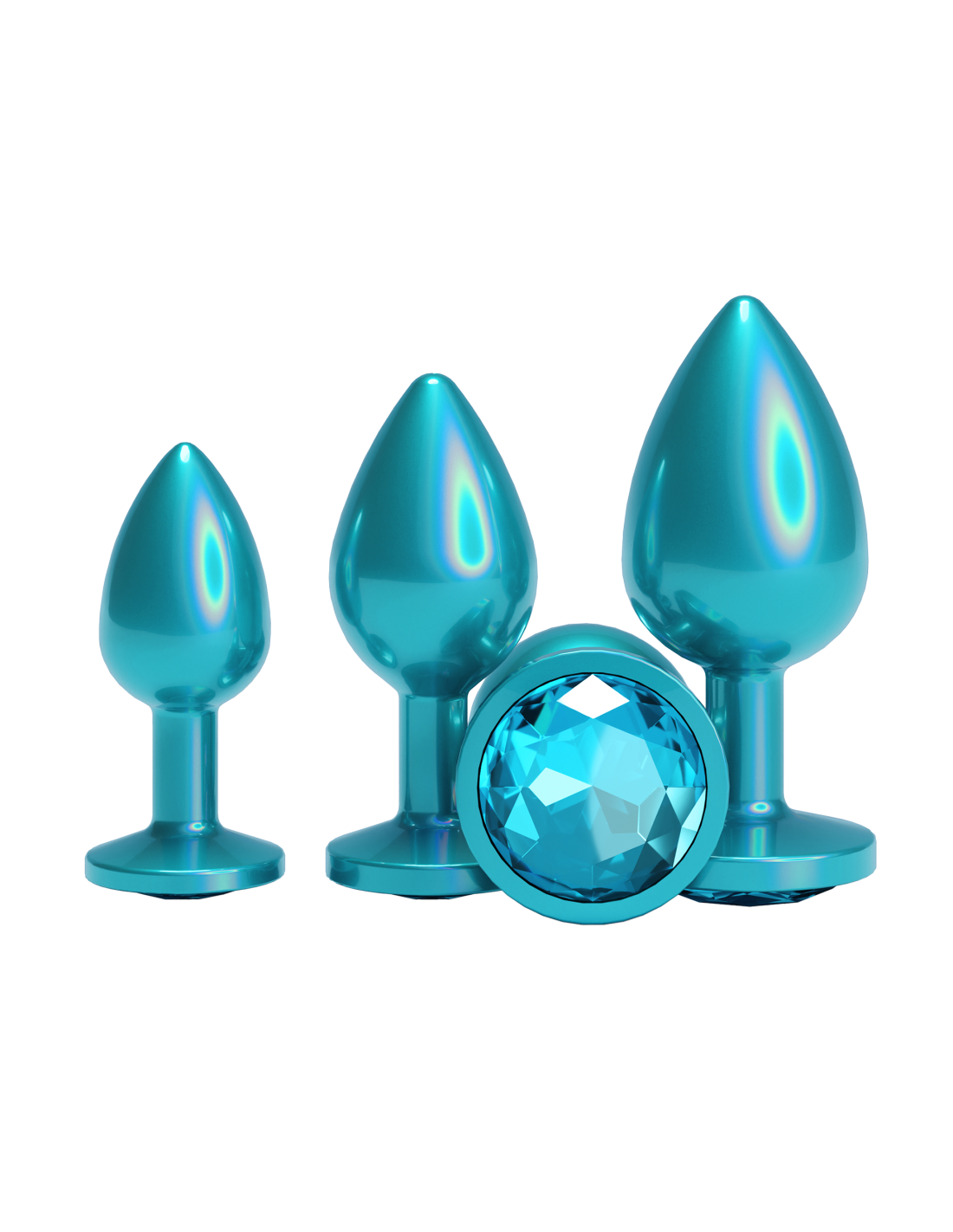 Este deslumbrante kit de entrenamiento incluye tres tapones cromados de color verde azulado en tamaños graduados, con forma para una penetración sin esfuerzo. Ideales para entrenar solo o en pareja, son seguros para el cuerpo y están disponibles en una variedad de colores, formas y tamaños. Adecuado con todos los lubricantes.
