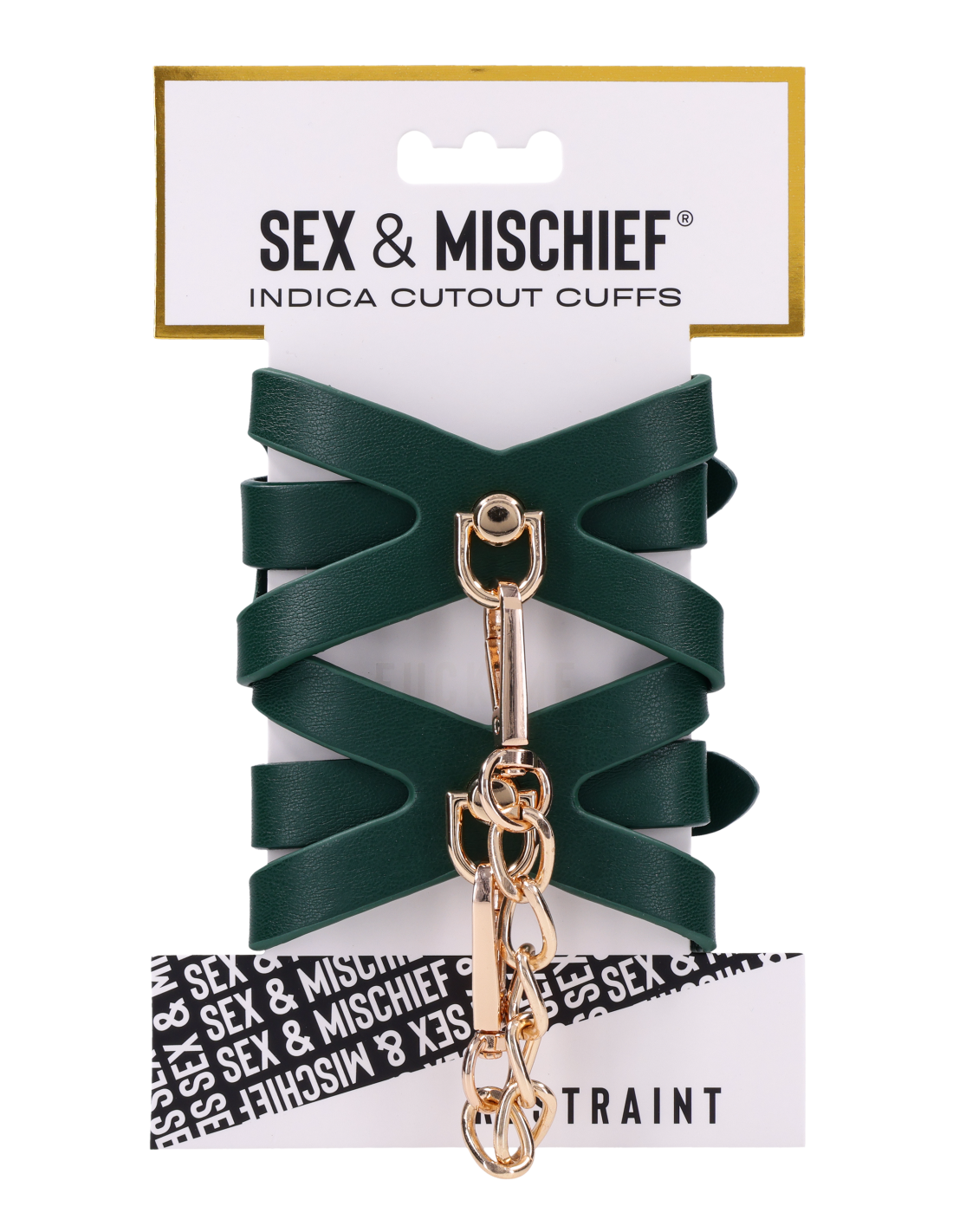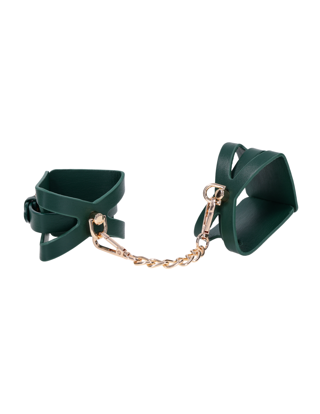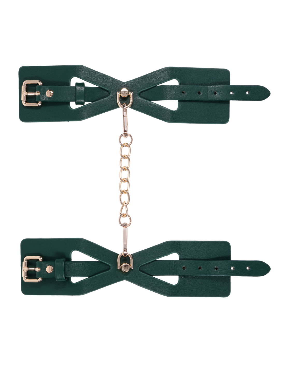Get wrapped up in something irresistible. These emerald green cuffs feature dramatic cutout detailing to reveal more skin and spark more intrigue. Lined for softness and designed for visual seduction, they’re as comfortable as they are commanding. Use them to bind wrists together or attach to other Indica items for a coordinated scene. The gold chain and hardware add just the right touch of luxury to every surrender.