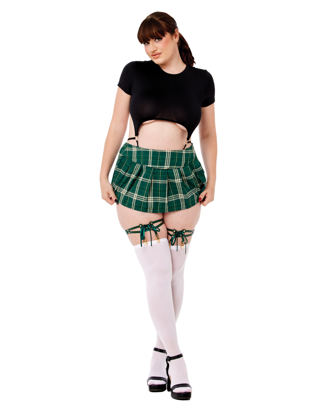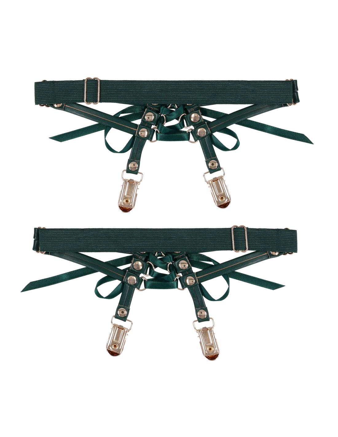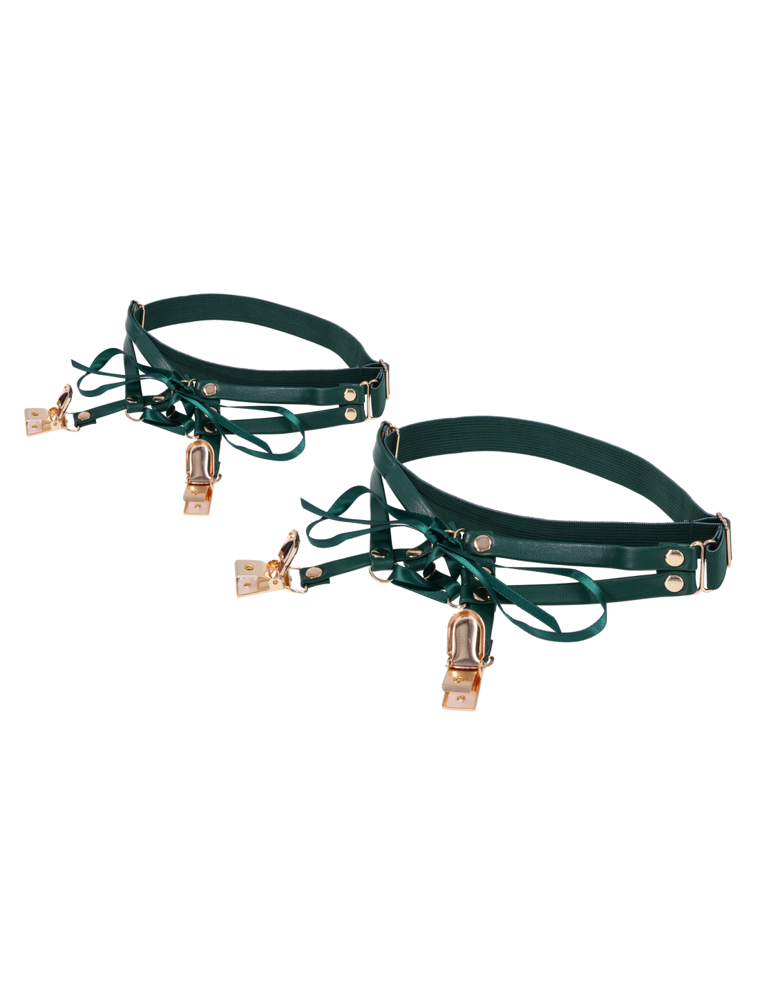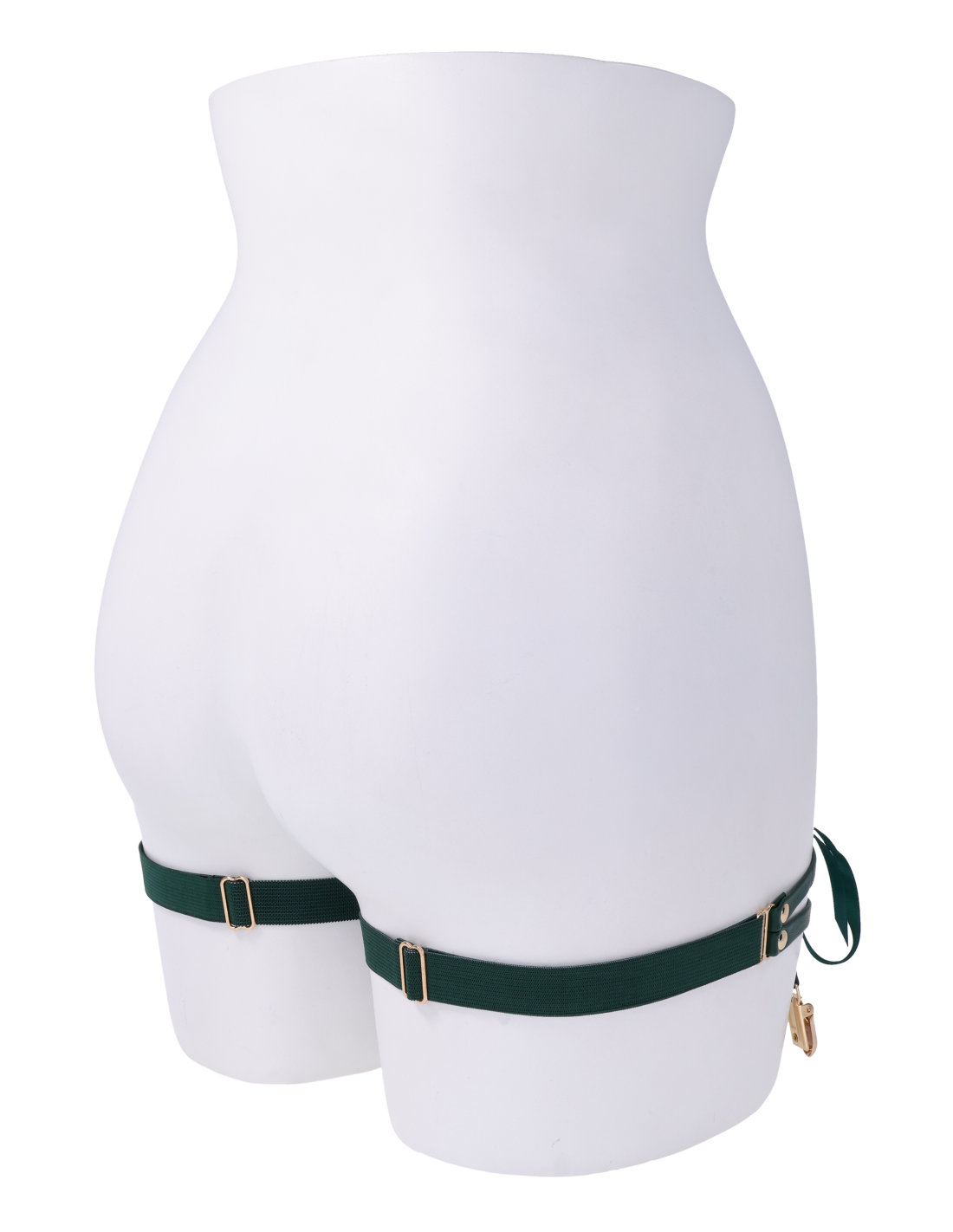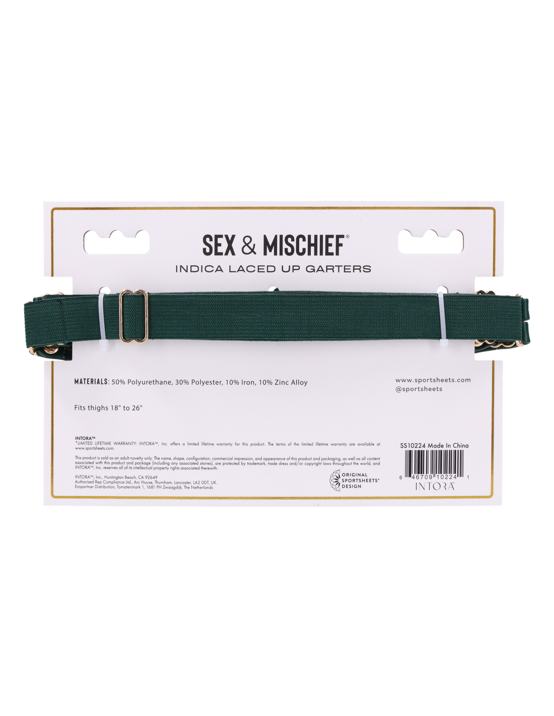 Add a hint of bondage to your lingerie. The Indica Laced Up Garters wrap your thighs in emerald faux leather and tie closed with silky green satin laces for a corset-inspired fit. Adjustable from 18 to 26 inch (45,7 to 66 cm), these garters hug the body just right, enhancing curves, stocking security, and seductive confidence. Whether worn under clothing or as part of a scene, they’re guaranteed to turn heads.