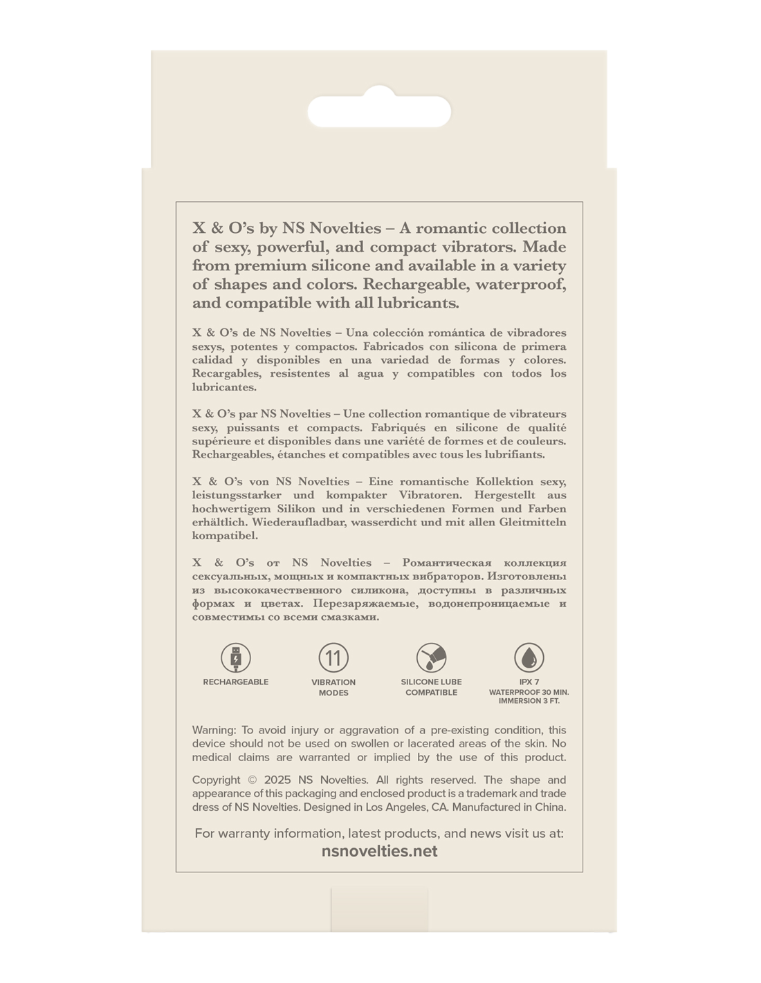 X & O's by NS Novelties: a romantic collection of sexy, powerful and compact vibrators. Made from premium silicone and available in a variety of shapes and colours. Rechargeable, waterproof, compabible with all lubricants.
