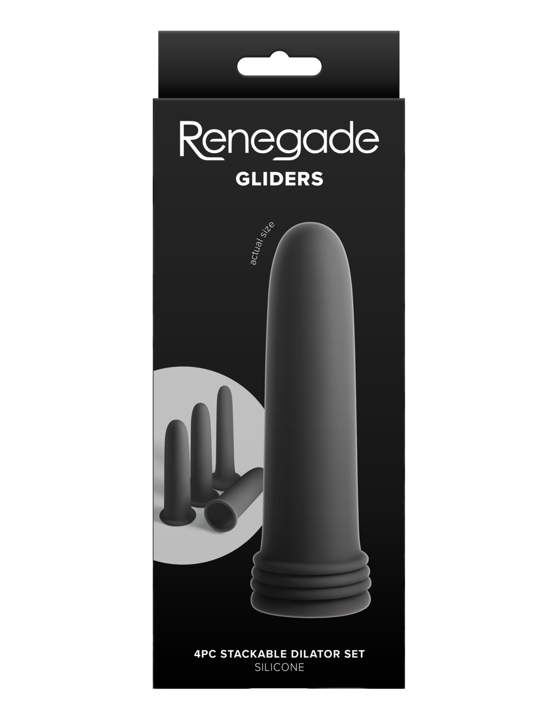 Renegade Gliders is a four-piece dilator set designed to support sexual wellness and comfort. The small base pairs with three plush, stackable sleeves to gently increase thickness at your own pace. Made of body-safe silicone and compatible with all lubricants.