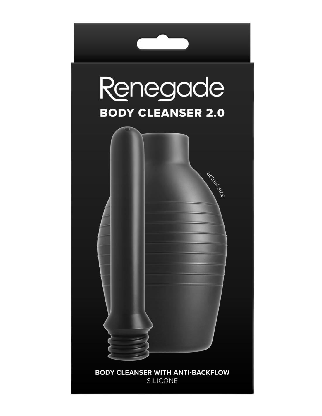 Renegade's Body Cleanser 2.0 is an intimate hygiene device featuring an anti-backflow design for improved cleanliness and safety. Includes a squeezable bulb and straight nozzle made of body-safe silicone. Easy to use, easy to clean, and compatible with all lubricants.