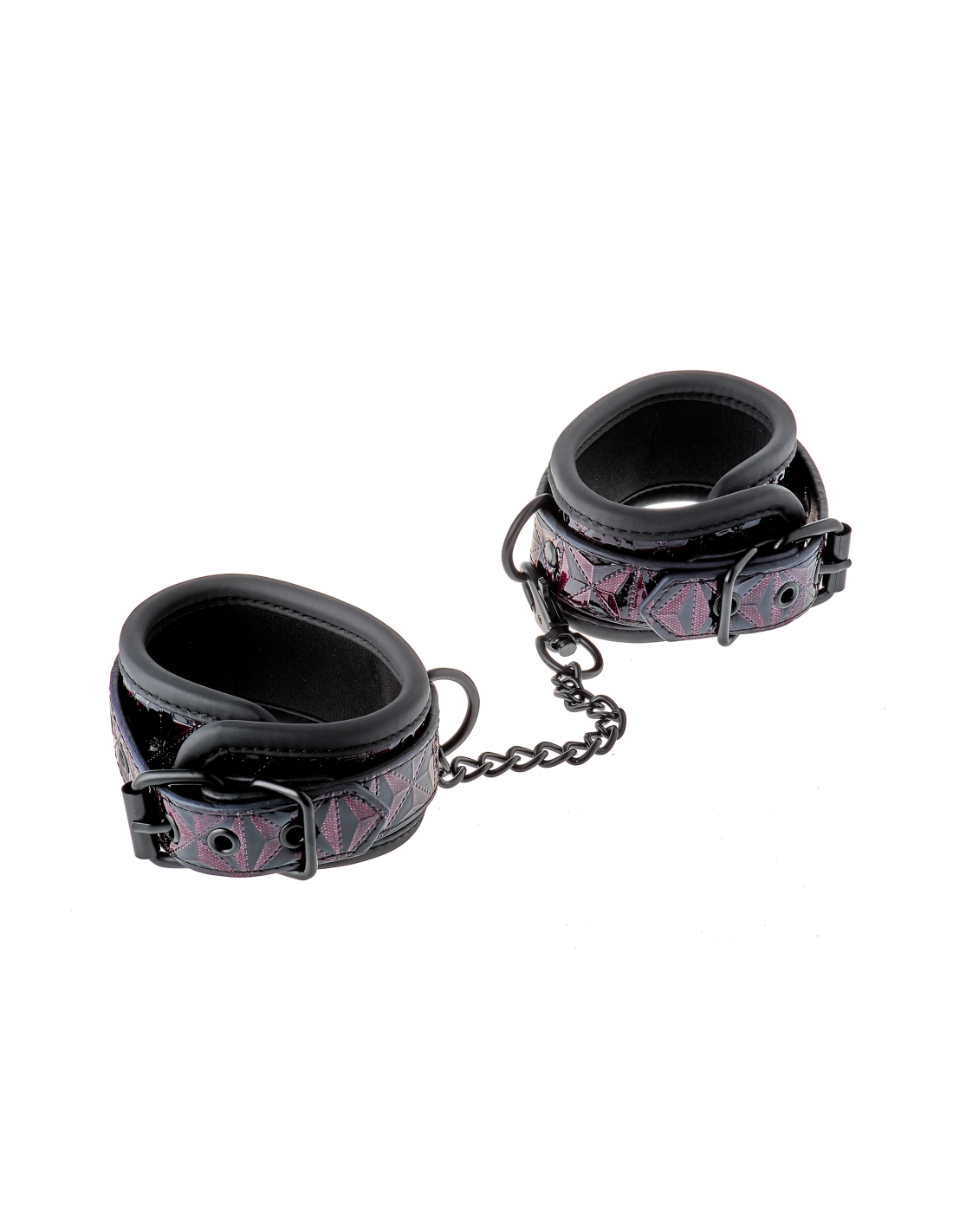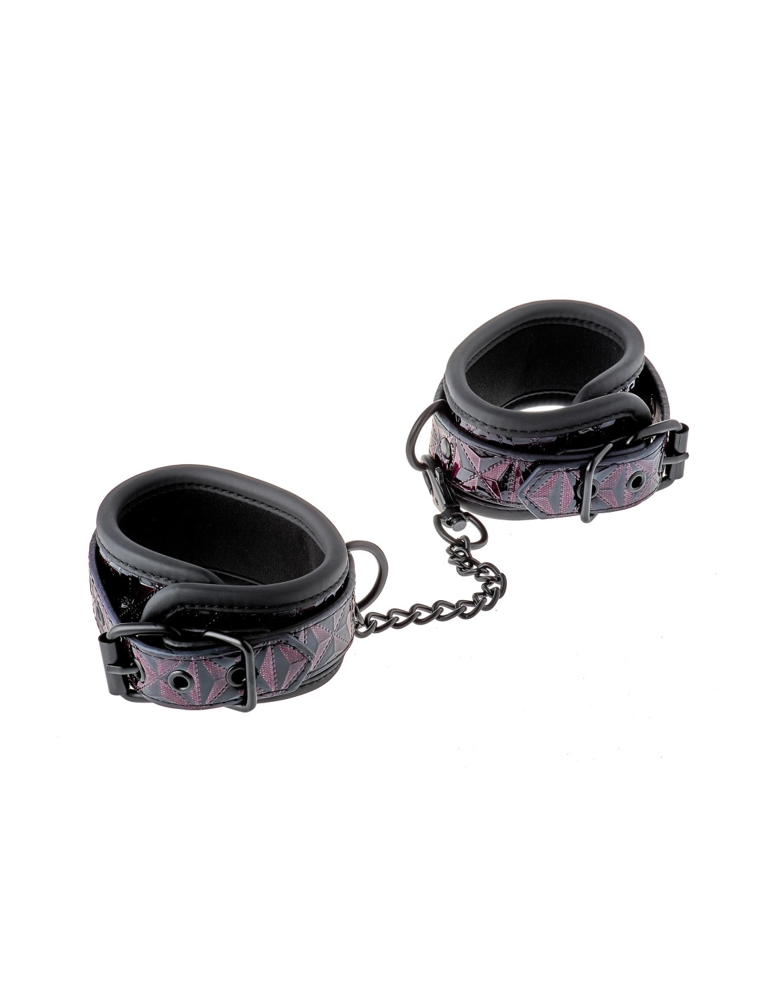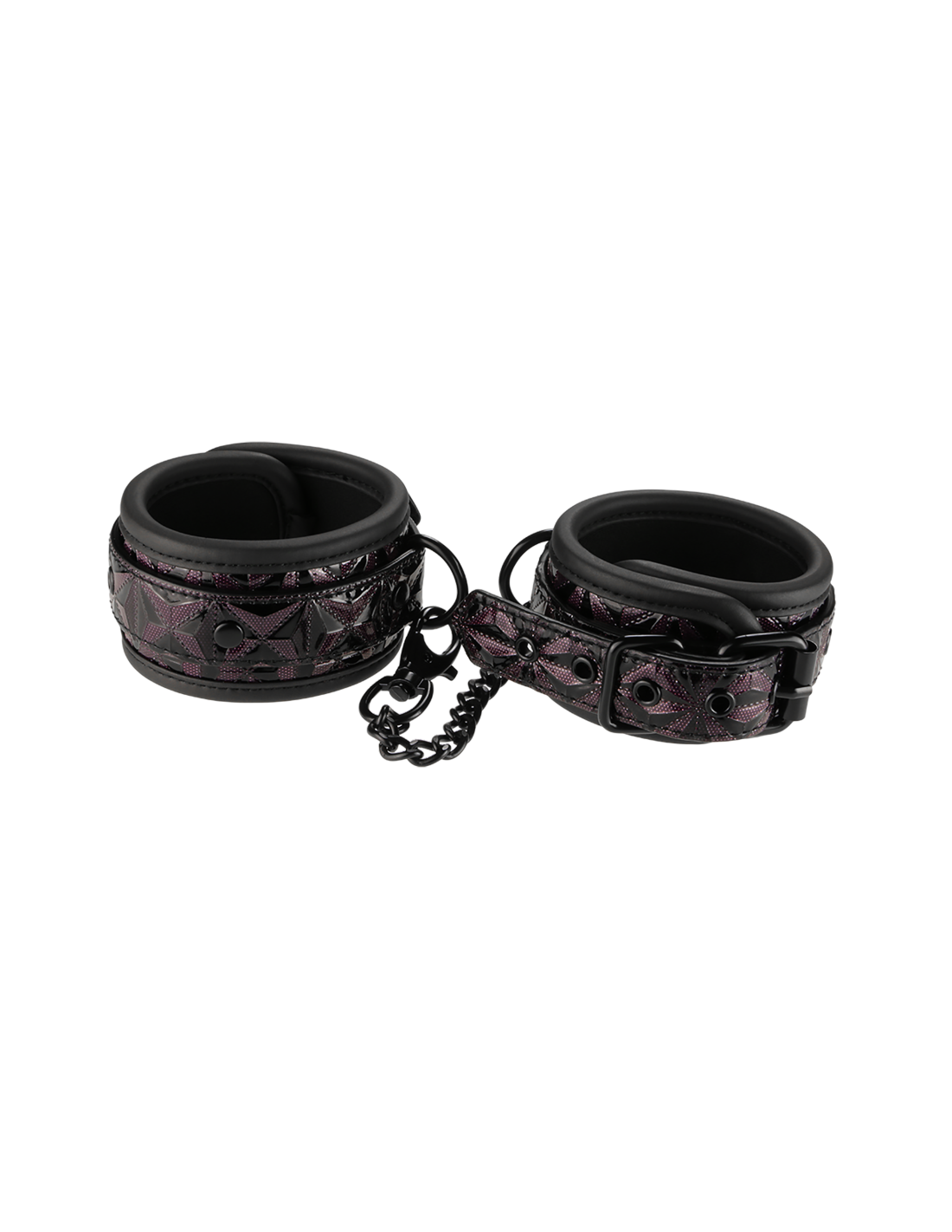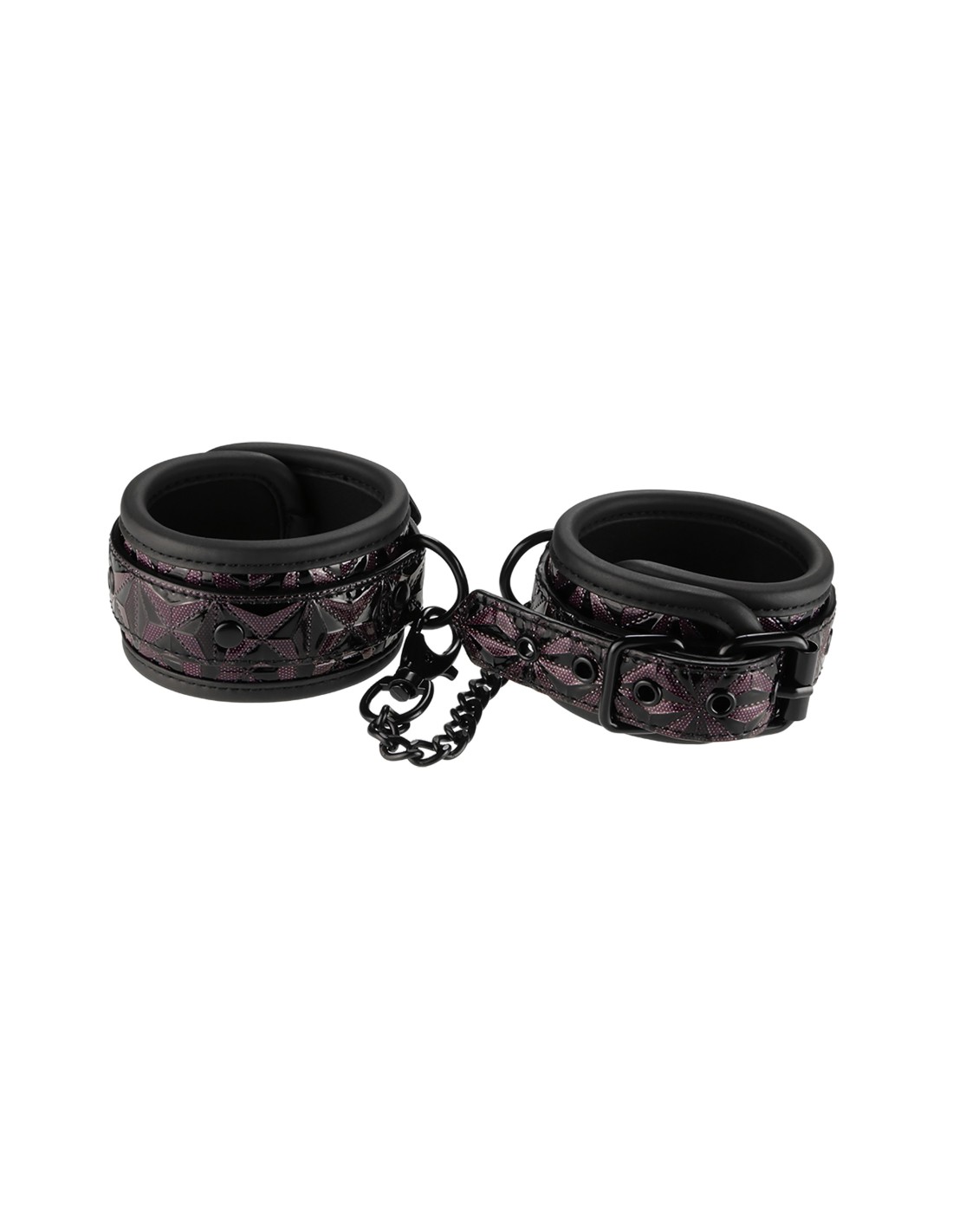 Un par de elegantes tobilleras hechas de material con apariencia de cuero con un elegante y brillante diseño en relieve en negro y morado. Tienen todos los accesorios negros sin níquel y están forrados con un material de neopreno suave pero duradero para un juego sexy y cómodo. Los puños de los tobillos son totalmente ajustables con las sencillas hebillas estilo cinturón. Una cadena de 12 cm de largo mantiene los puños unidos. La cadena se puede quitar por un lado mediante un mosquetón. Es posible colocar más cadenas, ganchos de cuerda o pesos adicionales.