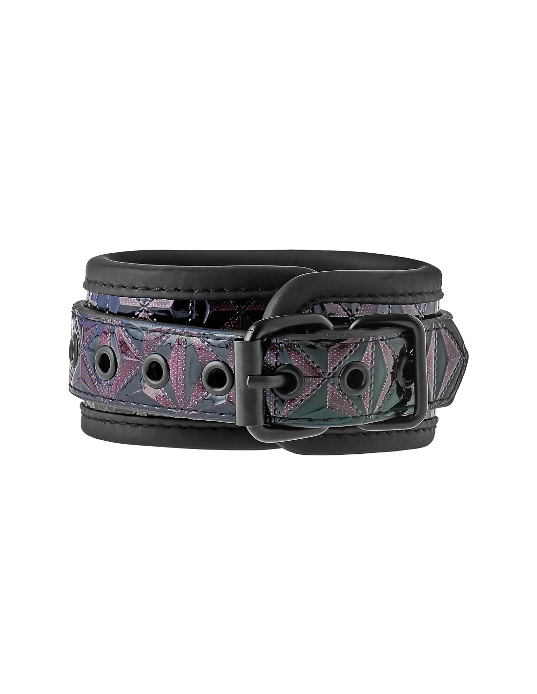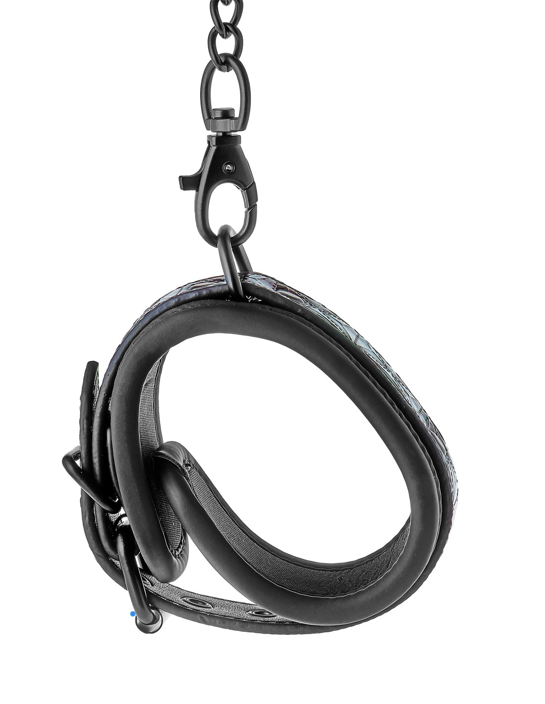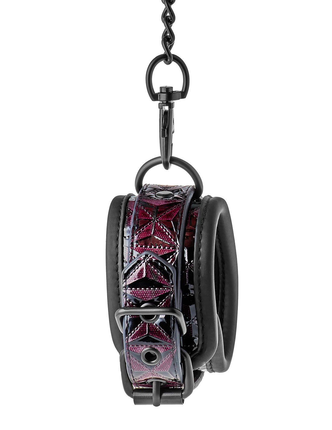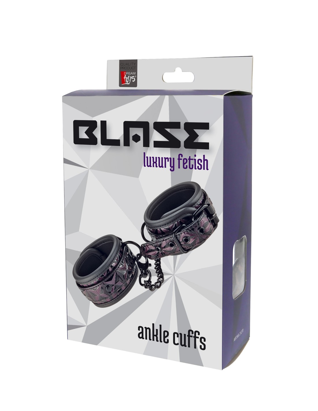 Un par de elegantes tobilleras hechas de material con apariencia de cuero con un elegante y brillante diseño en relieve en negro y morado. Tienen todos los accesorios negros sin níquel y están forrados con un material de neopreno suave pero duradero para un juego sexy y cómodo. Los puños de los tobillos son totalmente ajustables con las sencillas hebillas estilo cinturón. Una cadena de 12 cm de largo mantiene los puños unidos. La cadena se puede quitar por un lado mediante un mosquetón. Es posible colocar más cadenas, ganchos de cuerda o pesos adicionales.