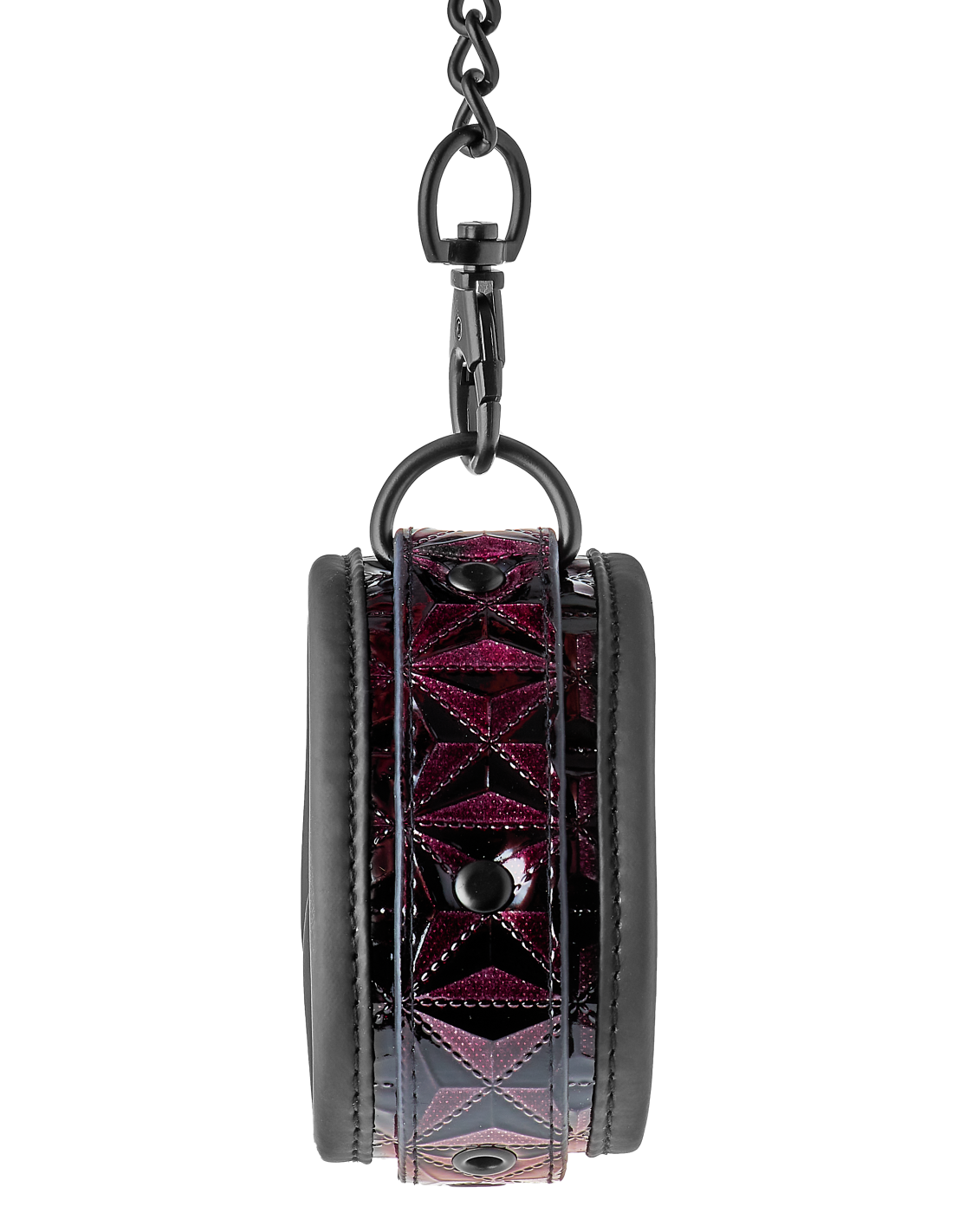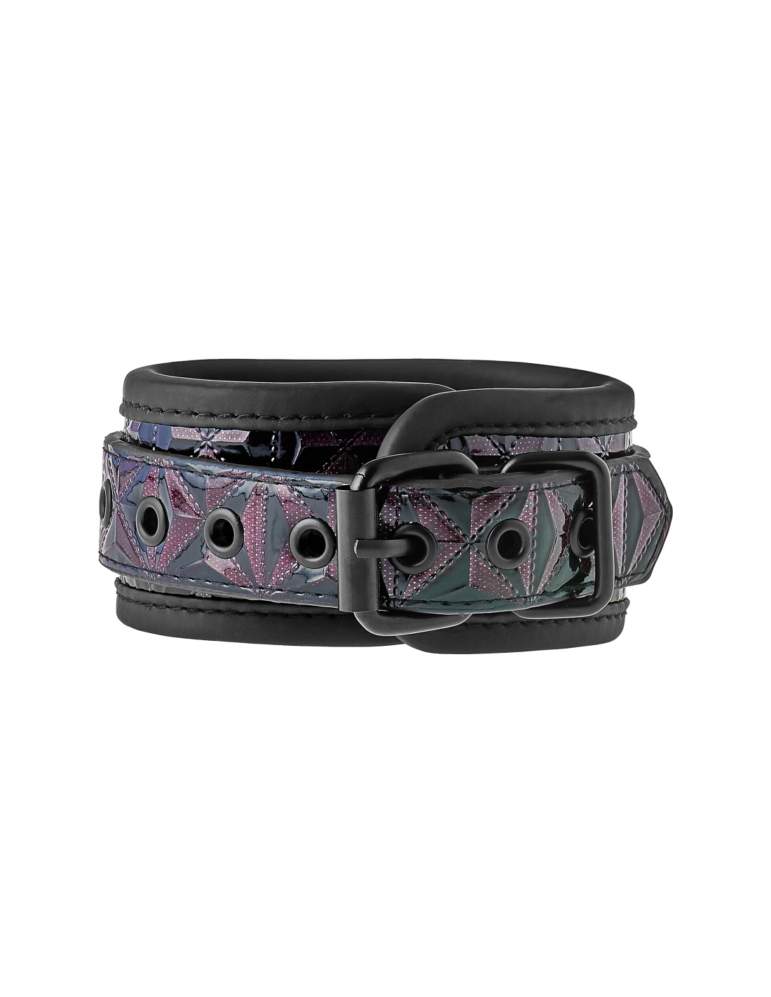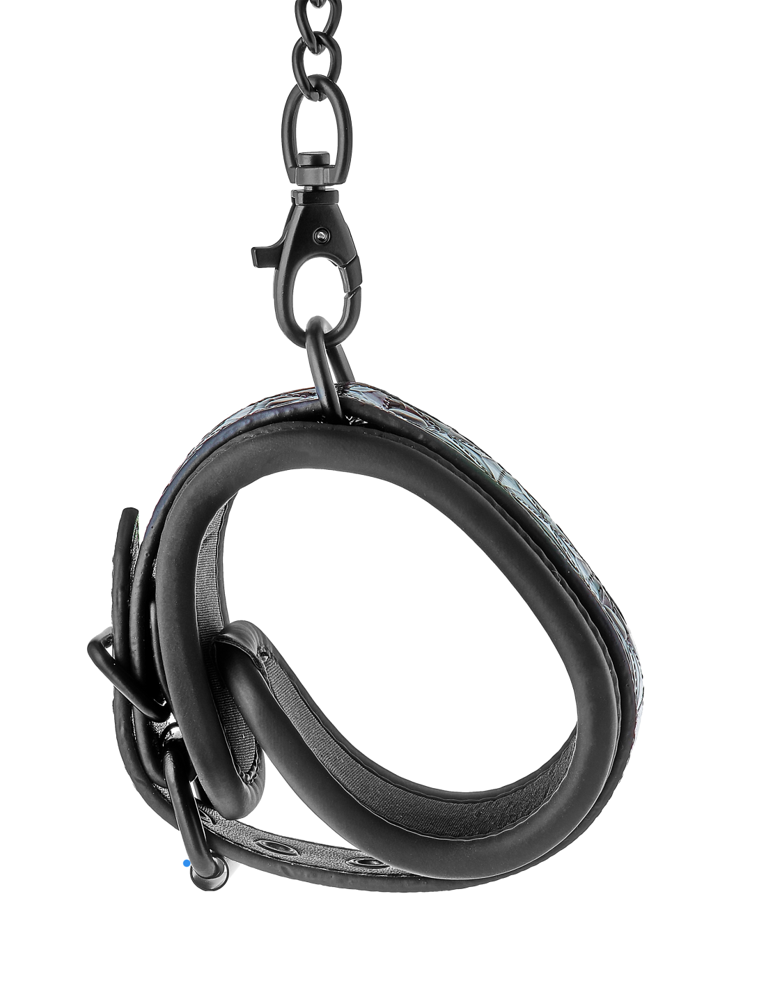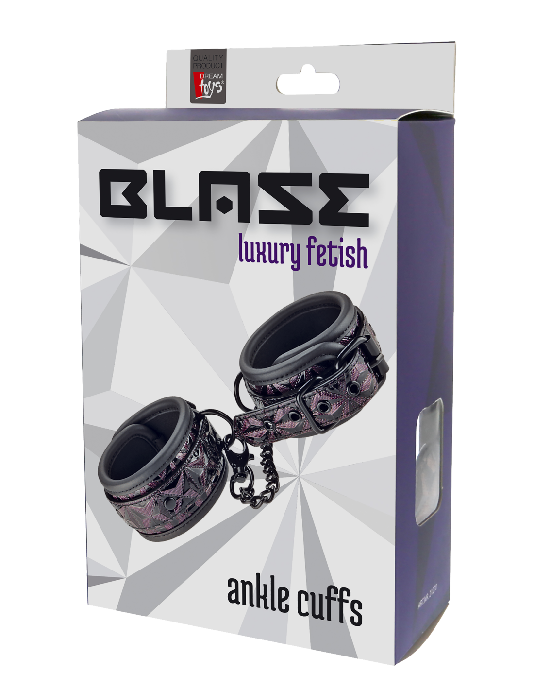 Un par de elegantes tobilleras hechas de material con apariencia de cuero con un elegante y brillante diseño en relieve en negro y morado. Tienen todos los accesorios negros sin níquel y están forrados con un material de neopreno suave pero duradero para un juego sexy y cómodo. Los puños de los tobillos son totalmente ajustables con las sencillas hebillas estilo cinturón. Una cadena de 12 cm de largo mantiene los puños unidos. La cadena se puede quitar por un lado mediante un mosquetón. Es posible colocar más cadenas, ganchos de cuerda o pesos adicionales.