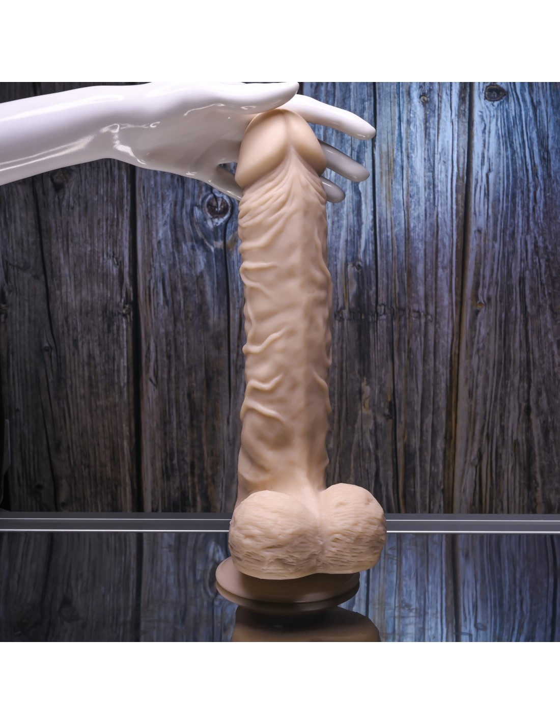 Este consolador de forma realista con venas y texturas realistas está hecho de un material de doble capa que se mueve como la piel real. El shaft es flexible y articulable con una varilla metálica interior.