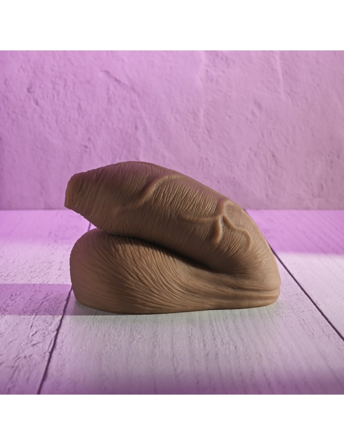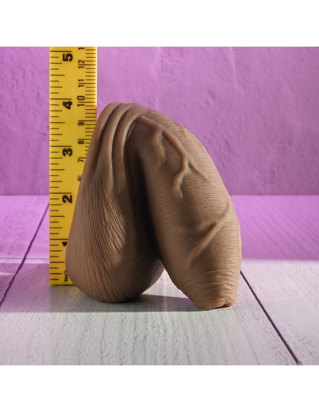 Este empacador realista presenta un pene no circuncidado realista y bolas con venas y arrugas realistas, diseñado como un peso satisfactorio para meterlo de forma segura en prendas ajustadas.