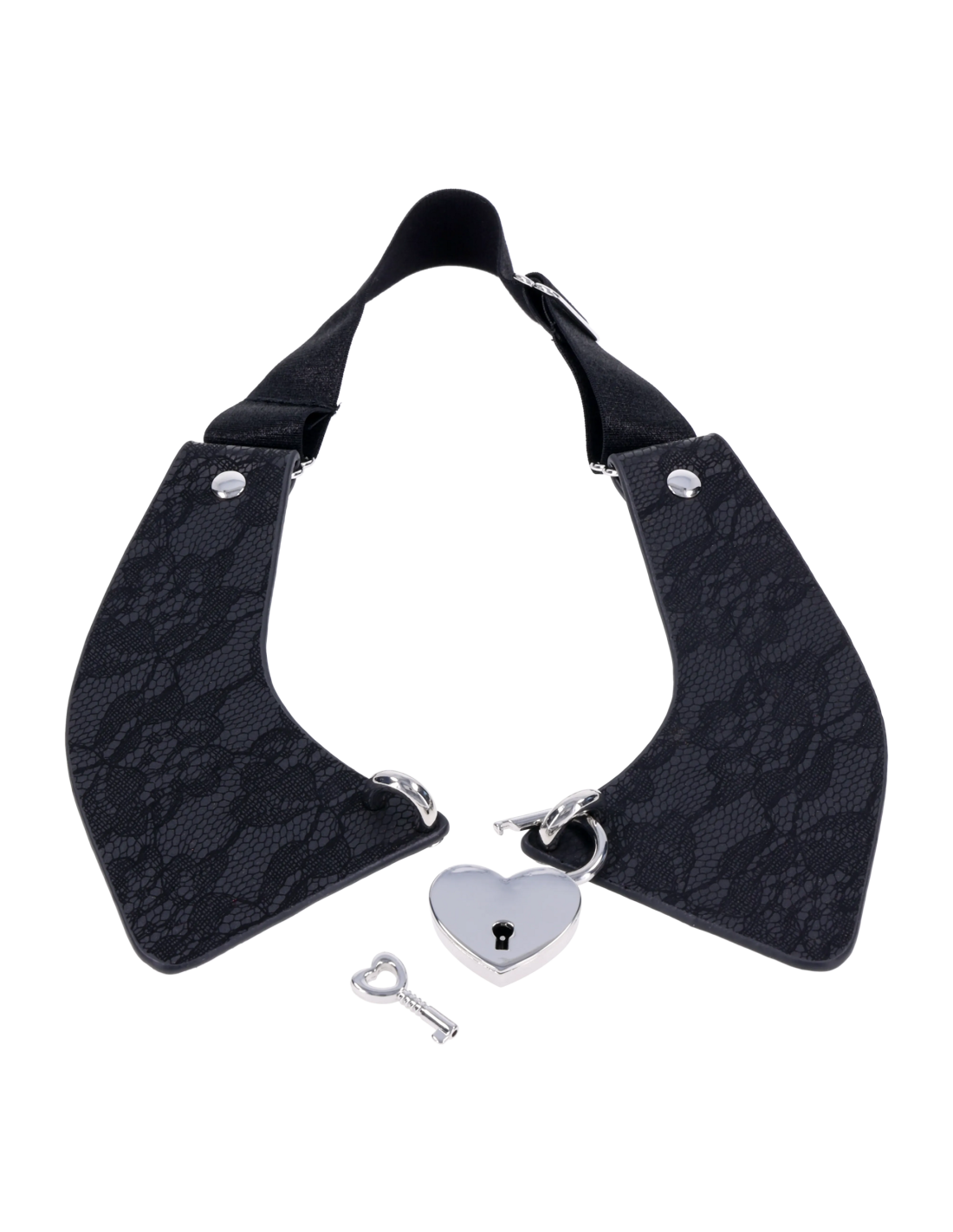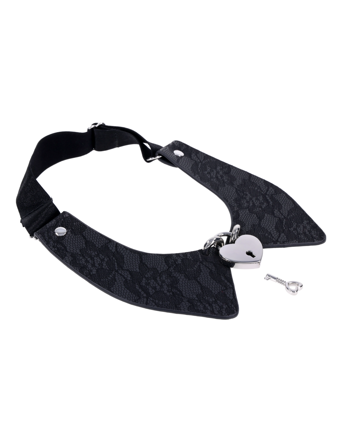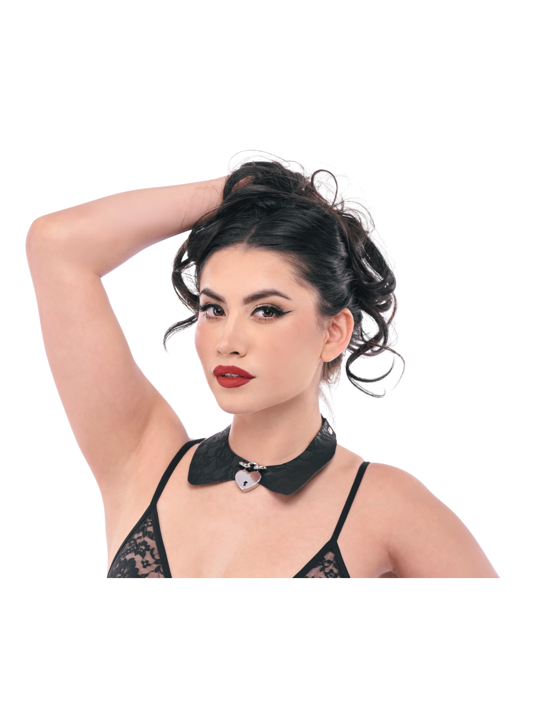 Un símbolo de devoción con un toque de vanguardia. El cuello de día de encaje con ligereza combina elegancia y sumisión en un diseño tan elegante como sensual. Confeccionado en lujosa piel sintética grabada con encaje, este collar cuenta con un cierre de corazón plateado pulido en la parte delantera, que asegura el cuello en su lugar y agrega una pieza llamativa a tu look. El estilo de tirantes de sujetador ajustable en la parte posterior garantiza un fit cómodo y personalizado, lo que lo hace perfect para usar durante todo el día. Ya sea que se use como un accesorio de moda o un símbolo discreto de tu dinámica, el collar de día de encaje con ligereza te invita a abrazar tus deseos con confianza.