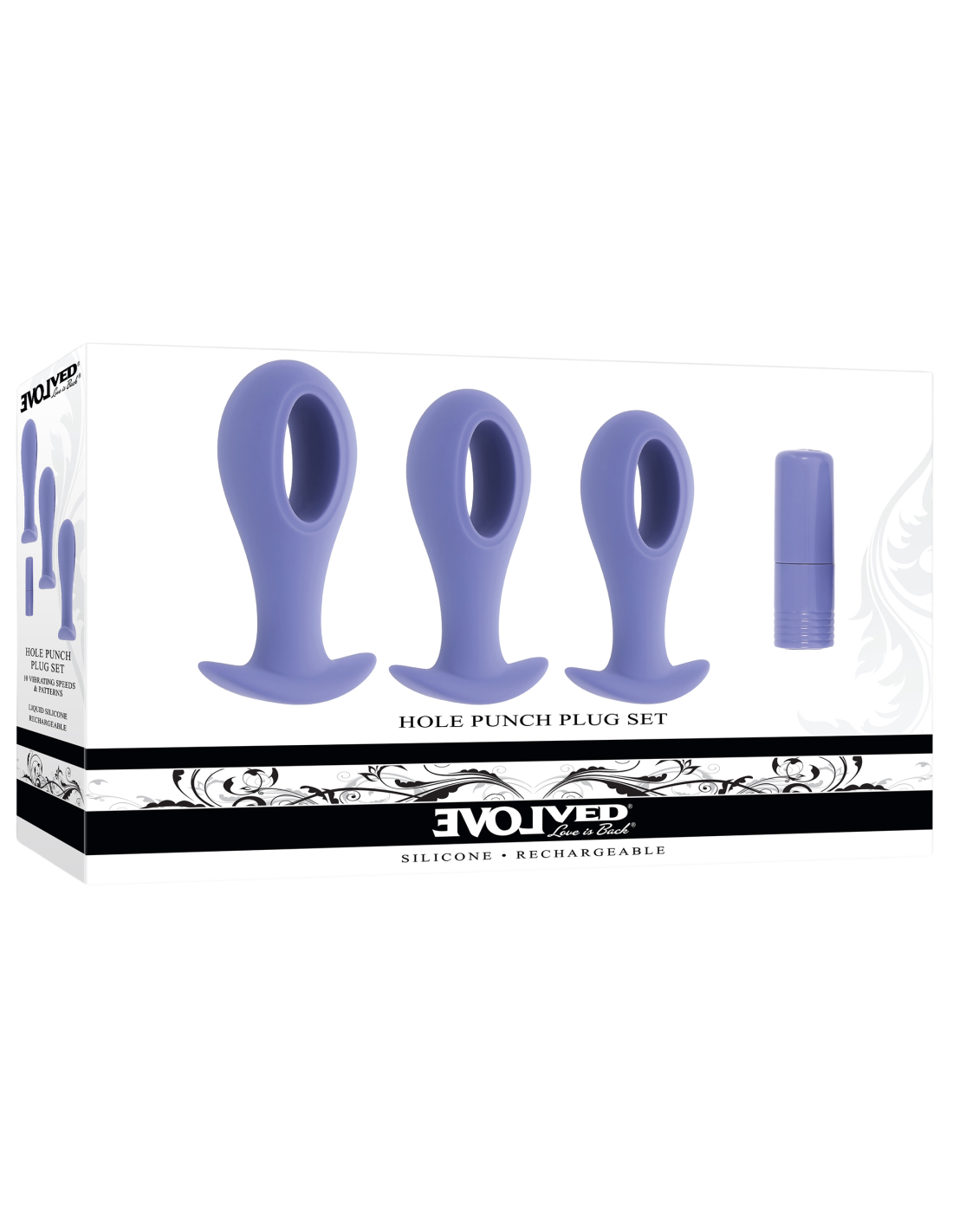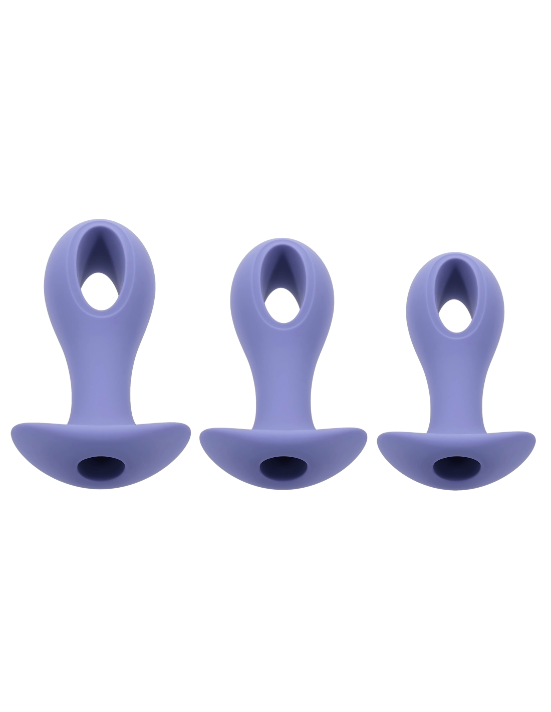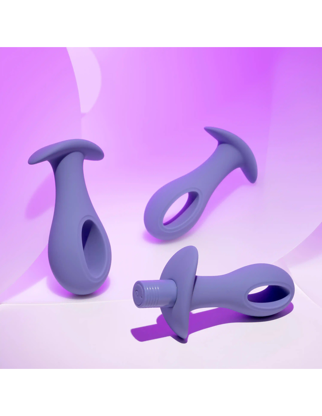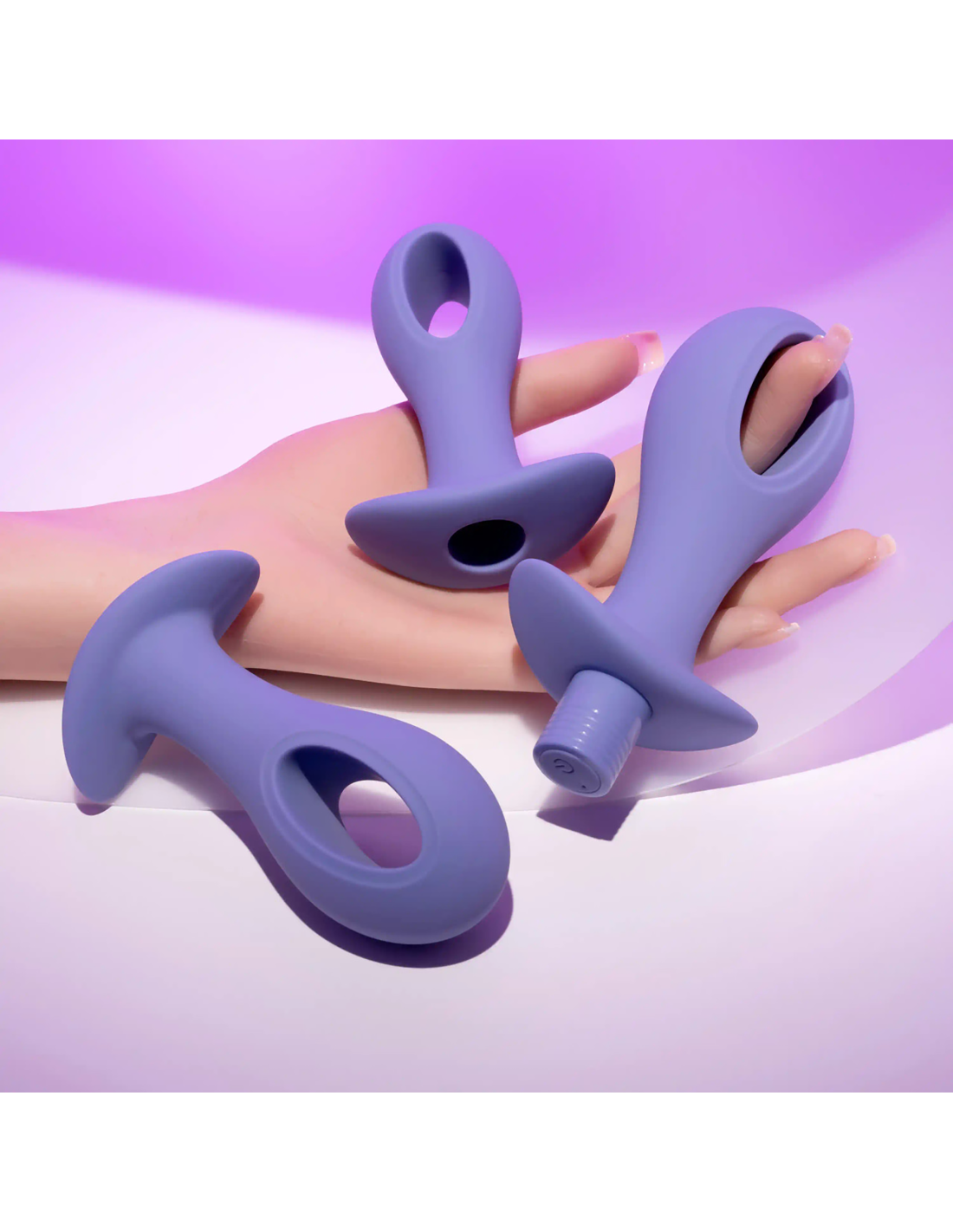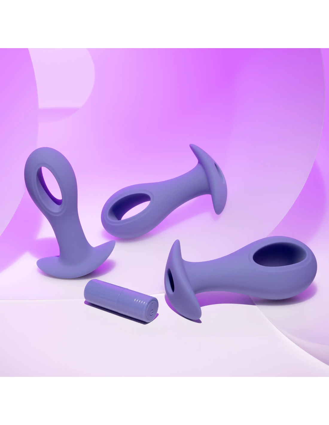 Estos tapones de silicona de centro hueco de forma ovalada son flexibles en la cabeza y el vástago para facilitar la entrada con su diseño único de "perforación". Impulsado por una robusta bala vibradora que se mete en cada base sin problemas, elija entre 3 tamaños, cada uno anclado por una amplia base de seguridad.
