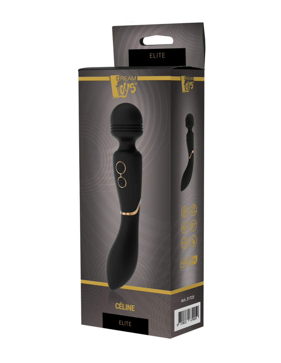 El estimulador de varita Céline de la colección Elite de Dream Toys es una varita negra con elegantes detalles en color dorado, un mango resistente, una cabeza redondeada y un cuello ligeramente flexible. Céline tiene 2 potentes motores, uno en el cabezal y otro en la base, cada uno de los cuales ofrece 7 patrones de vibración y 3 velocidades. Los dos motores funcionan por separado. El vibrador de varita Céline es recargable con el cable USB incluido. Está hecho de silicona suave de calidad alimentaria y ABS, resistente al agua IPX7 y seguro para el cuerpo, sin ftalatos ni látex. La operación se puede realizar con 2 botones: el botón superior para encender/apagar el vibrador y operar las vibraciones en el cabezal, el botón inferior para cambiar los programas de vibración del motor inferior.