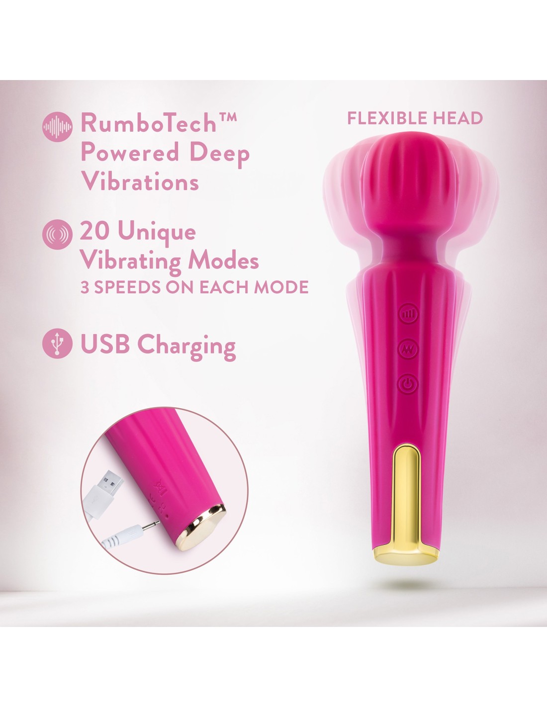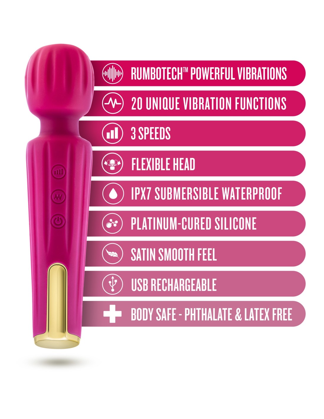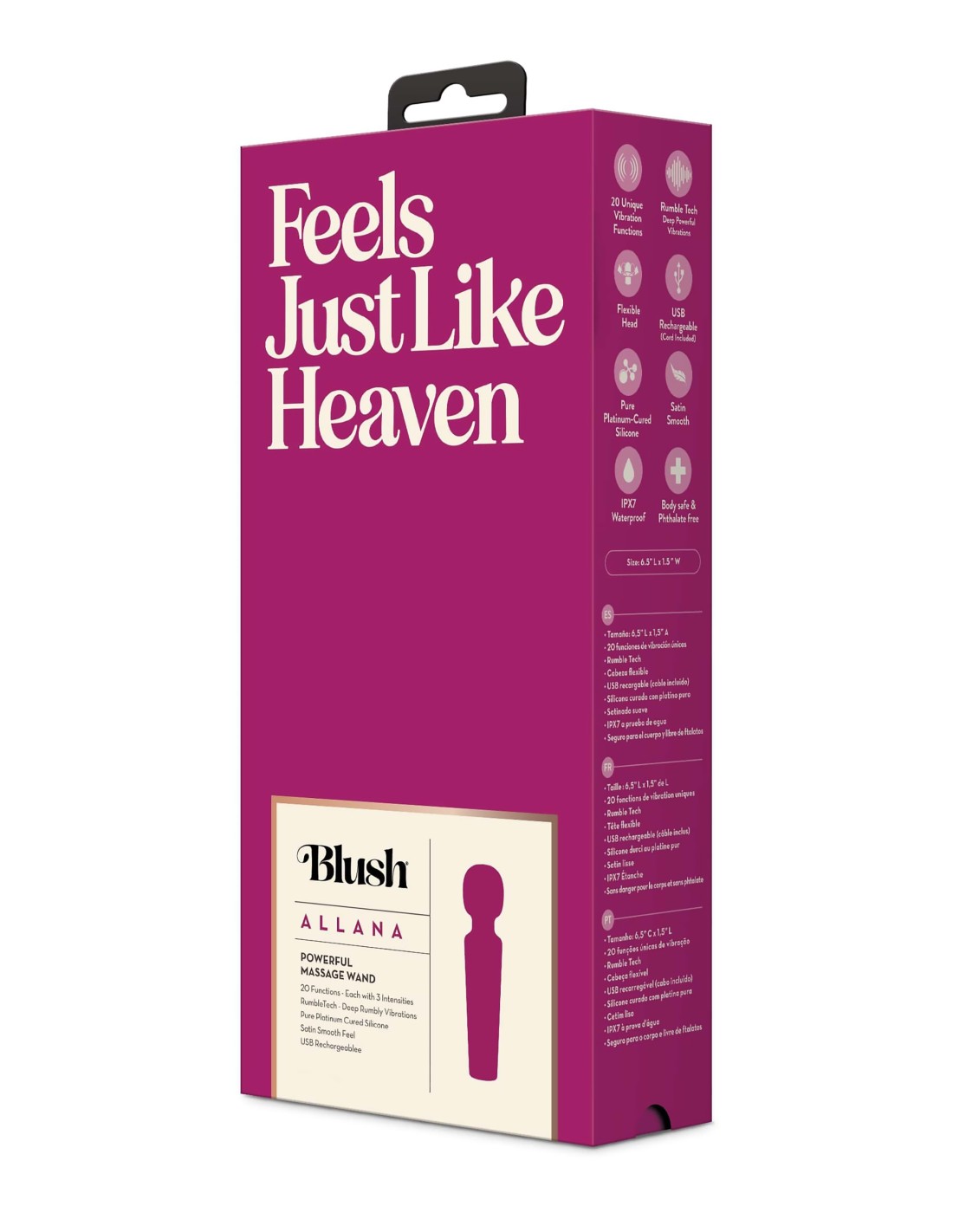 Blush Allana es una poderosa vibra de varita con una cabeza flexible que está lista para deleitar. Allana cuenta con 20 funciones de vibración profunda y rumbosa y 3 velocidades de vibración utilizando el potente motor RumboTech™ que te permitirá explorar una amplia gama de opciones, todas centradas en ti. Allana se siente deliciosa contra la piel y es perfect para masajear. ¡Esta varita recargable USB también es resistente al agua para divertirse en el baño y la ducha! Allana está hecho de silicona lisa satinada curada con platino y plástico ABS. Allana es seguro para el cuerpo, sin ftalatos, sin fragancia y fácil de limpiar.