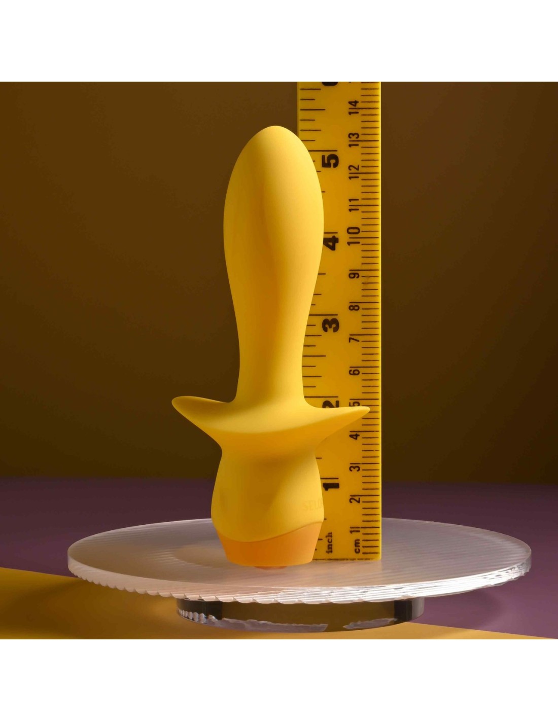 Este tapón vibratorio brillante y audaz cuenta con un shaft bulboso y flexible que se estrecha hasta una punta de fácil entrada. Su base de seguridad ancha y texturizada termina con un botón de control de gemas en forma de corazón.