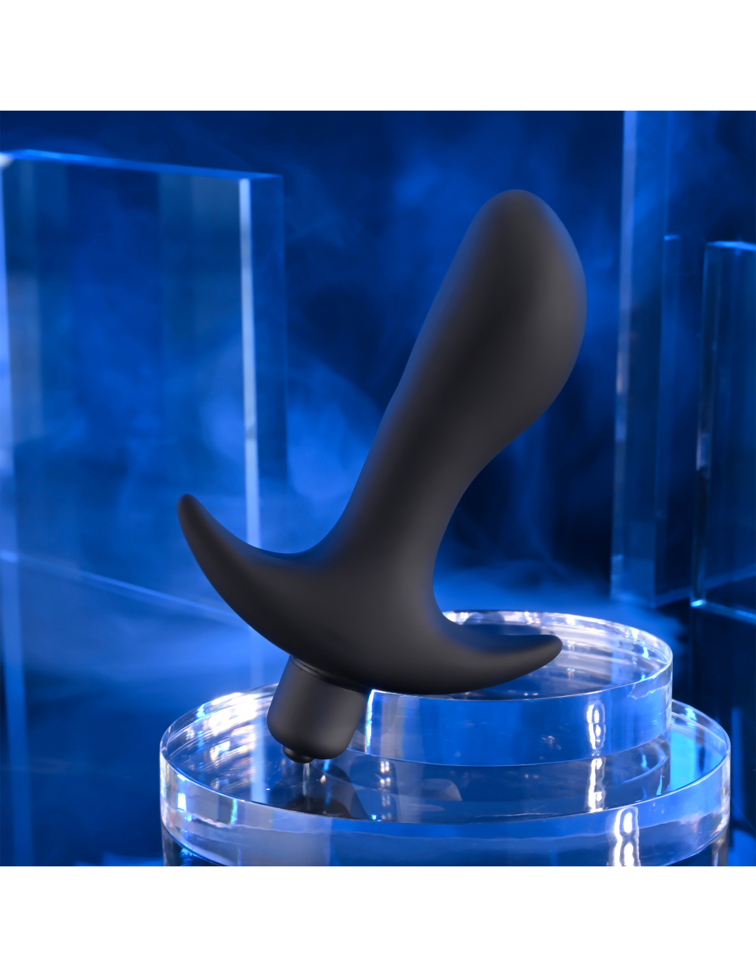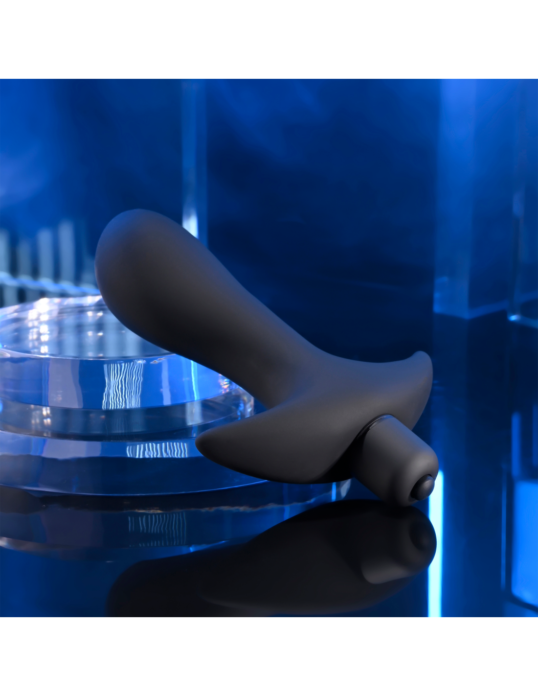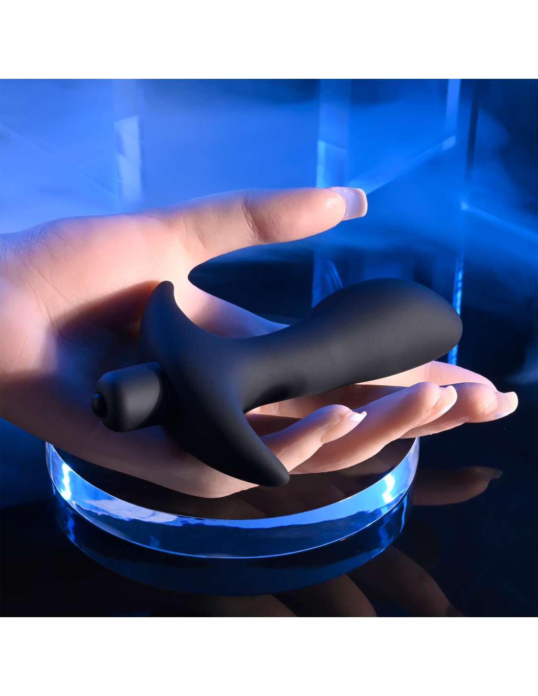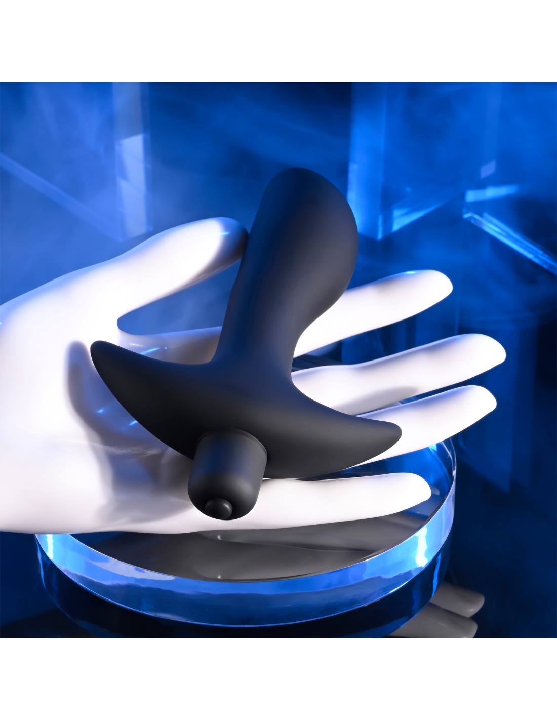 Con una punta asimétrica en forma de pulgar y una base de seguridad acampanada, este tapón de silicona vibratorio está bellamente diseñado para la estimulación interna de la zona erógena.
