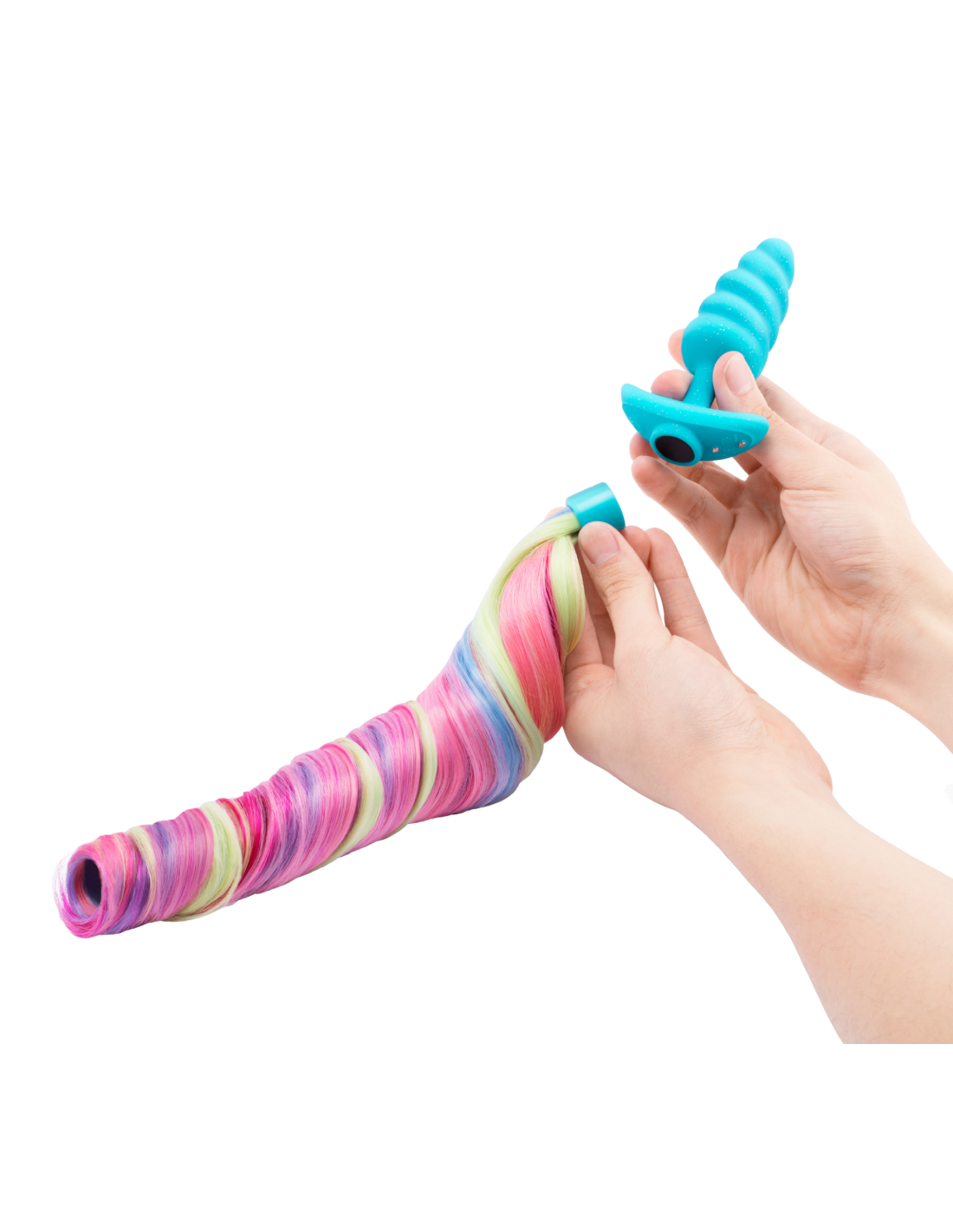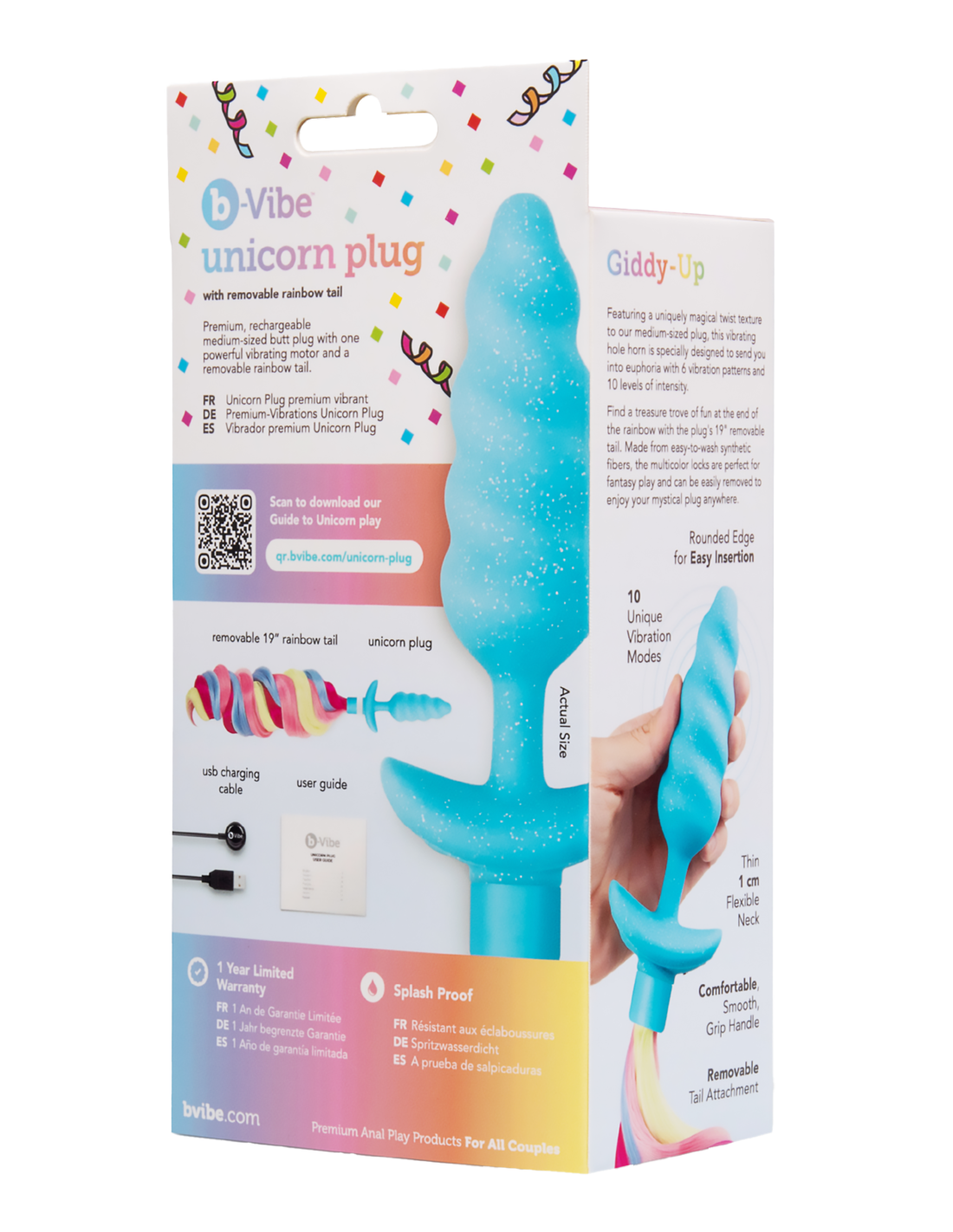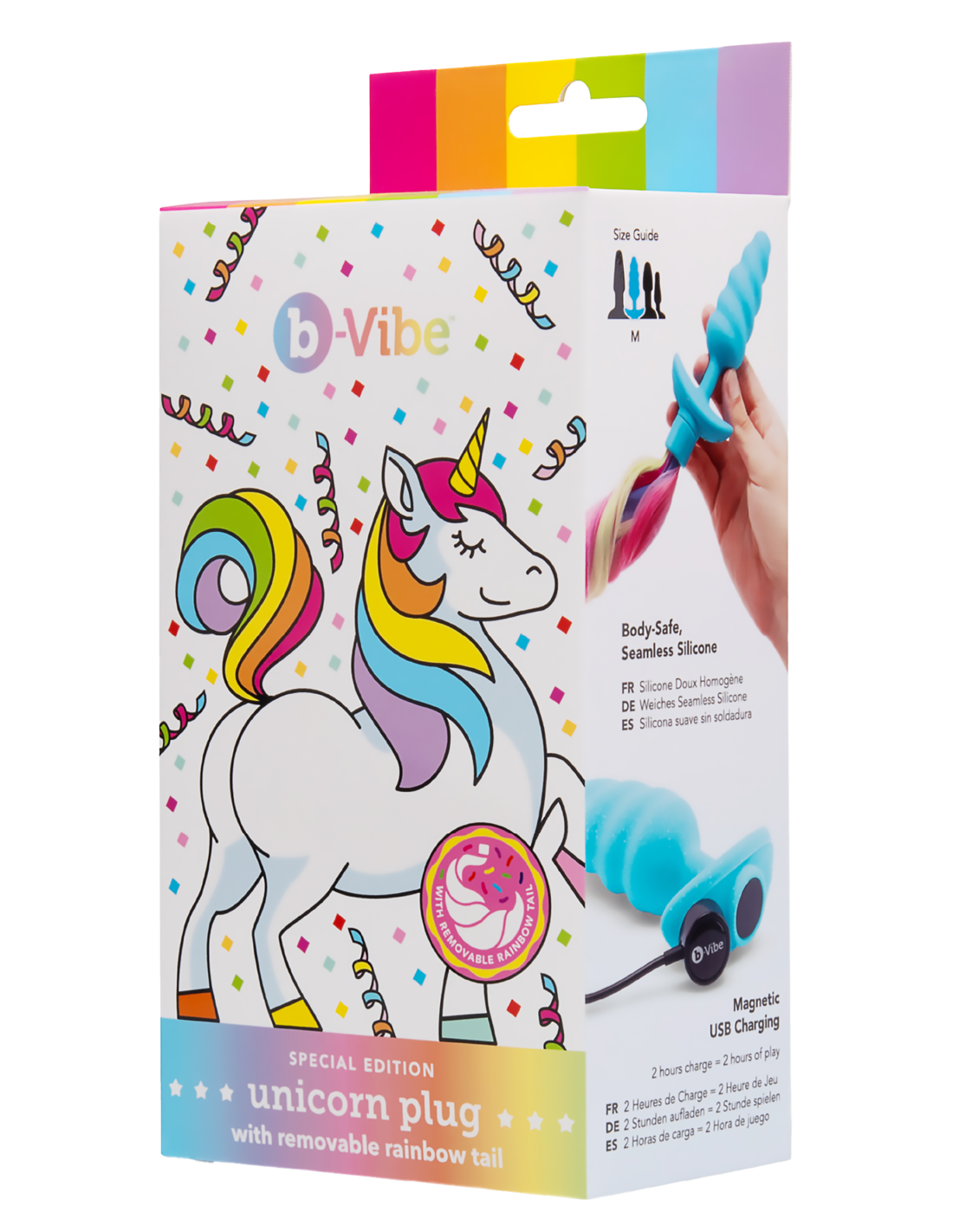 ¡El tapón anal vibrador de cola de unicornio de edición limitada de b-Vibe combinará la magia con el placer y te ayudará a revel en tu trasero o cuando juegues con tus amigos unicornios!