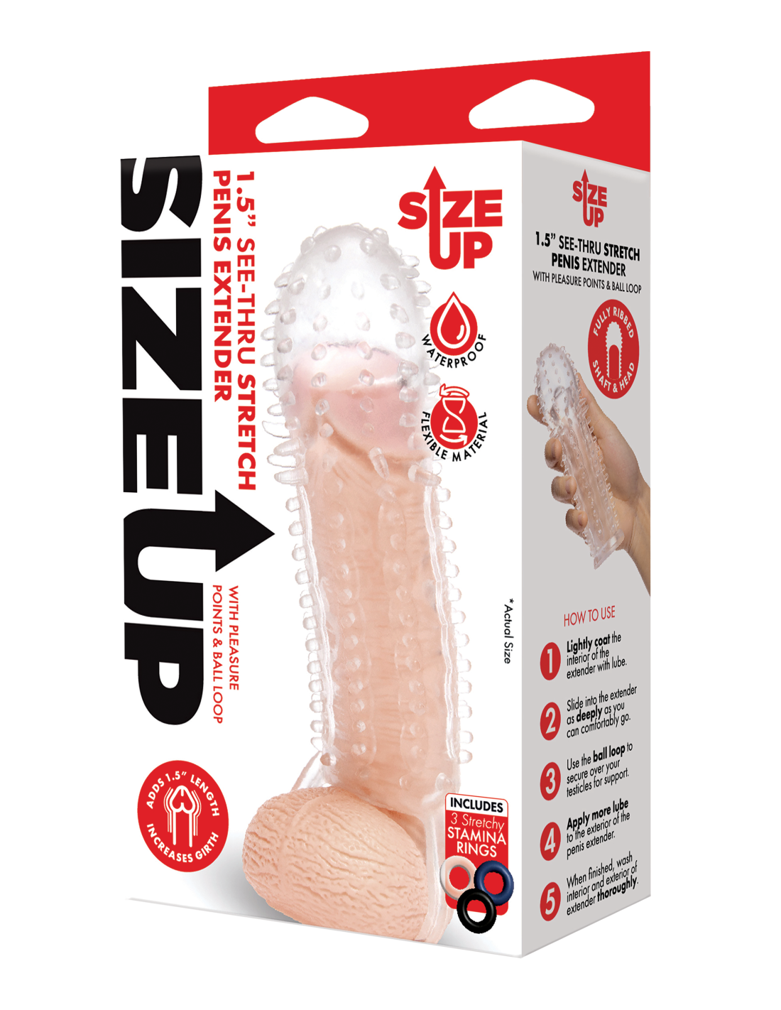 Add extra length and girth with the 3” See-Thru Penis Extender from Size Up. The realistic shape, details and textured surface create the ultimate experience in pleasure and play, giving you and your partner the experience of your life. The transparent design provides visual stimulation and the ball loop ensures firm control over your enhanced package. Use the three included rings to increase your stamina and enhance your pleasure.