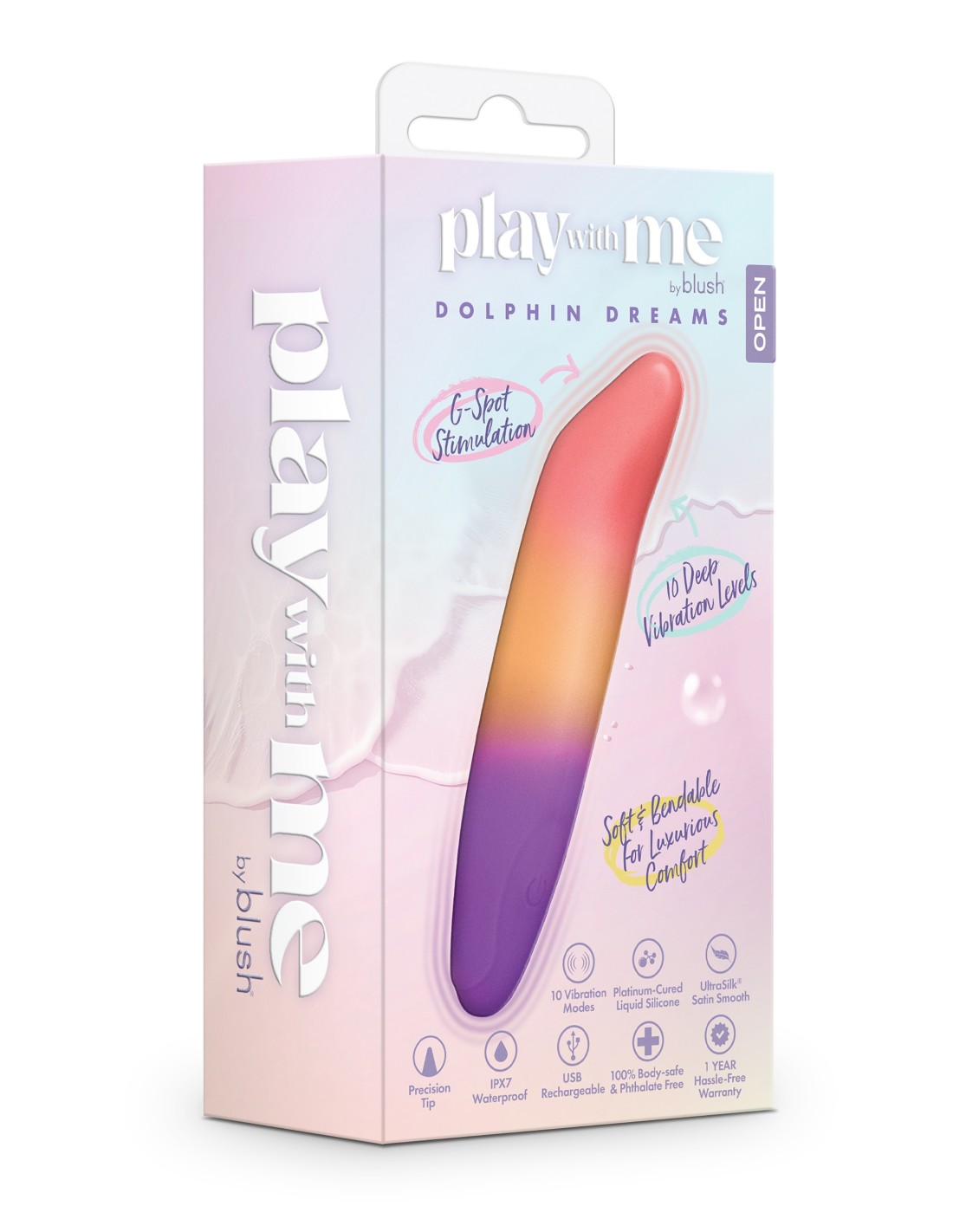 Surrender to gentle yet powerful waves of pleasure with Dolphin Dreams, a petite powerhouse that turns every touch into sensual indulgence. Designed for playful pleasure, this adorable, pocket-sized vibrator reveals 10 deep yet quiet vibration modes, with a precision tip for targeted sensations, guiding you to moments of pure bliss. Whether it’s slow, seductive foreplay, pinpoint clitoral stimulation, or sensual nipple pleasure, Dolphin Kisses delivers focused vibrations exactly where you crave them most. Explore a range of sensations, from gentle pulses to deep, resonant thrills, to discover your ultimate pleasure points. Crafted from Blush’s Purio® platinum-cured liquid silicone, the vibrator’s lusciously soft and bendable design ensures sweet and customizable pleasure. Its IPX7 waterproof rating ensures adventurous play, and USB charging adds convenience. Feel the playful caress of Dolphin Dreams and let every touch carry you away on a 'sea of intimate sensation'.