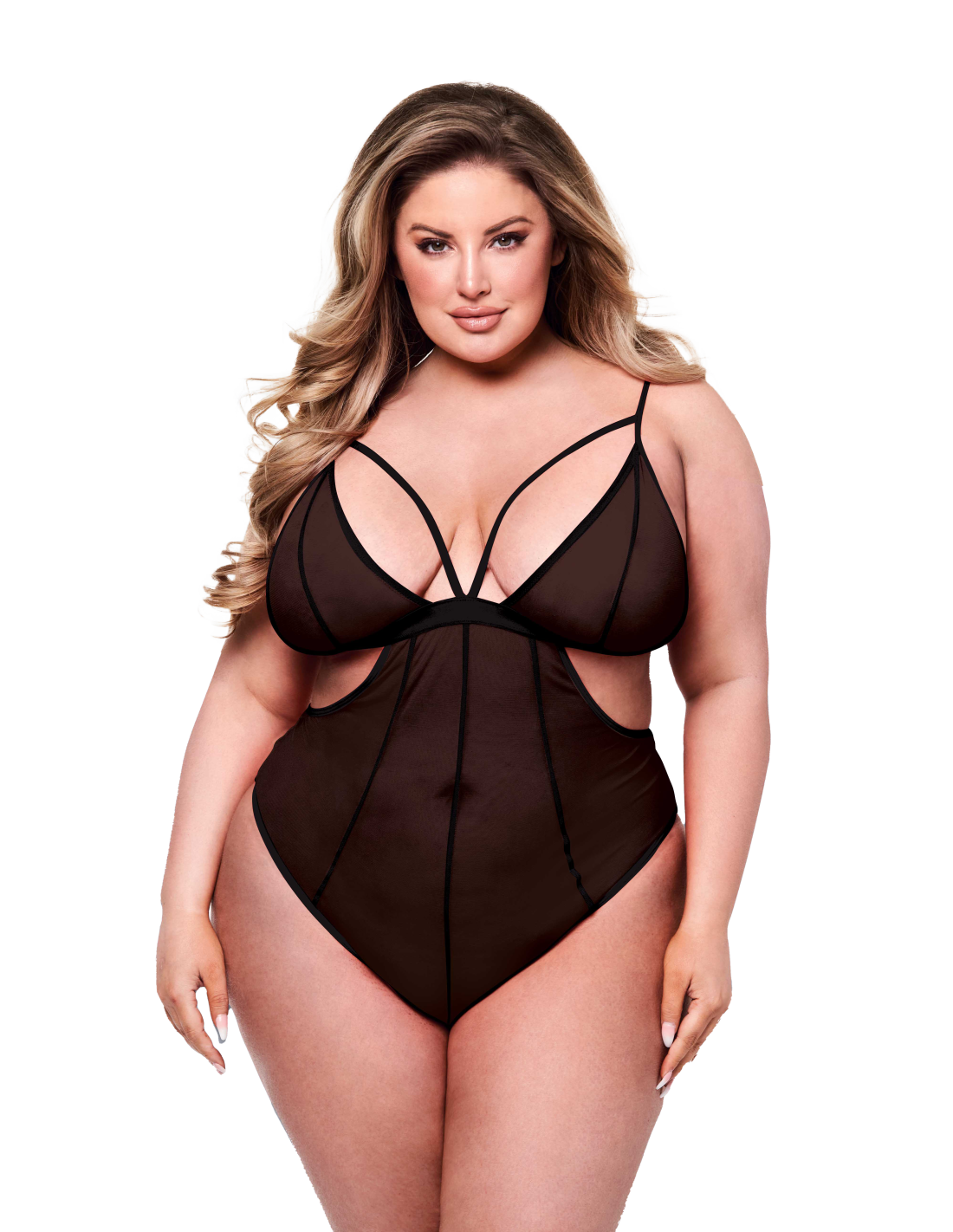 Si te encanta el aspecto de un conjunto de dos piezas, pero te encanta la sensación de un osito de peluche, ¡Baci tiene el look para ti! Este peluche de malla transparente, en un elegante negro medianoche, está diseñado con un popular estilo monokini. Las copas estilo bralette cuentan con tirantes curvos, con la apariencia de huesos en el torso y recortes en los lados, mientras que la espalda está abierta en un estilo de dos piezas, con la parte inferior sin entrepierna una característica divertida se mire como se mire. !