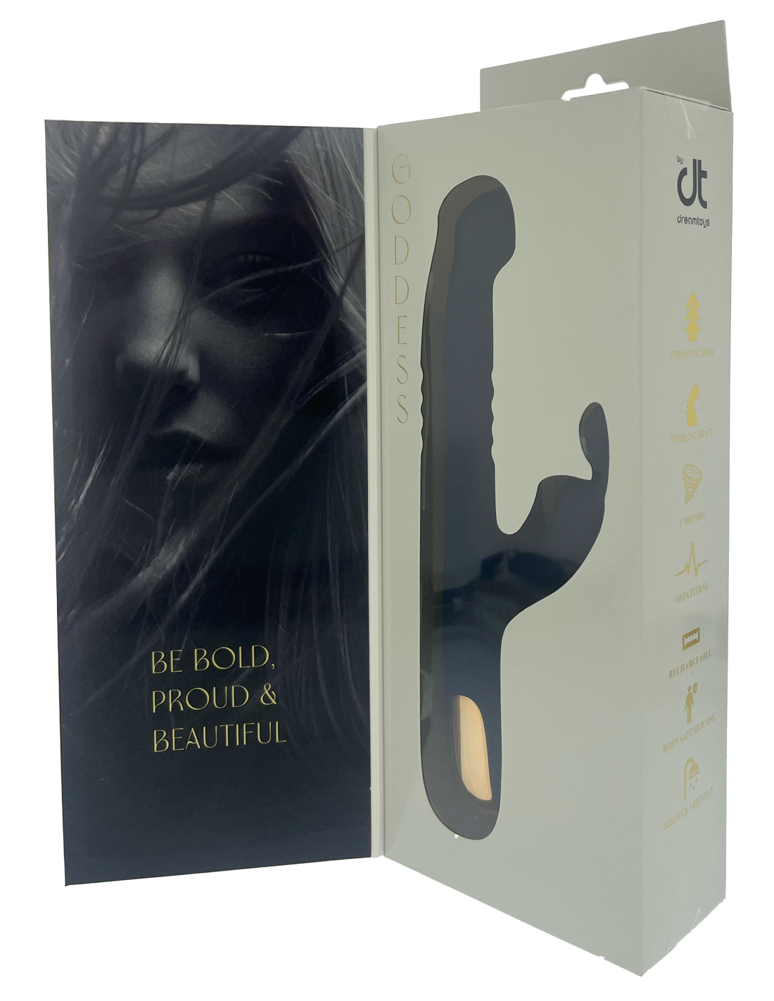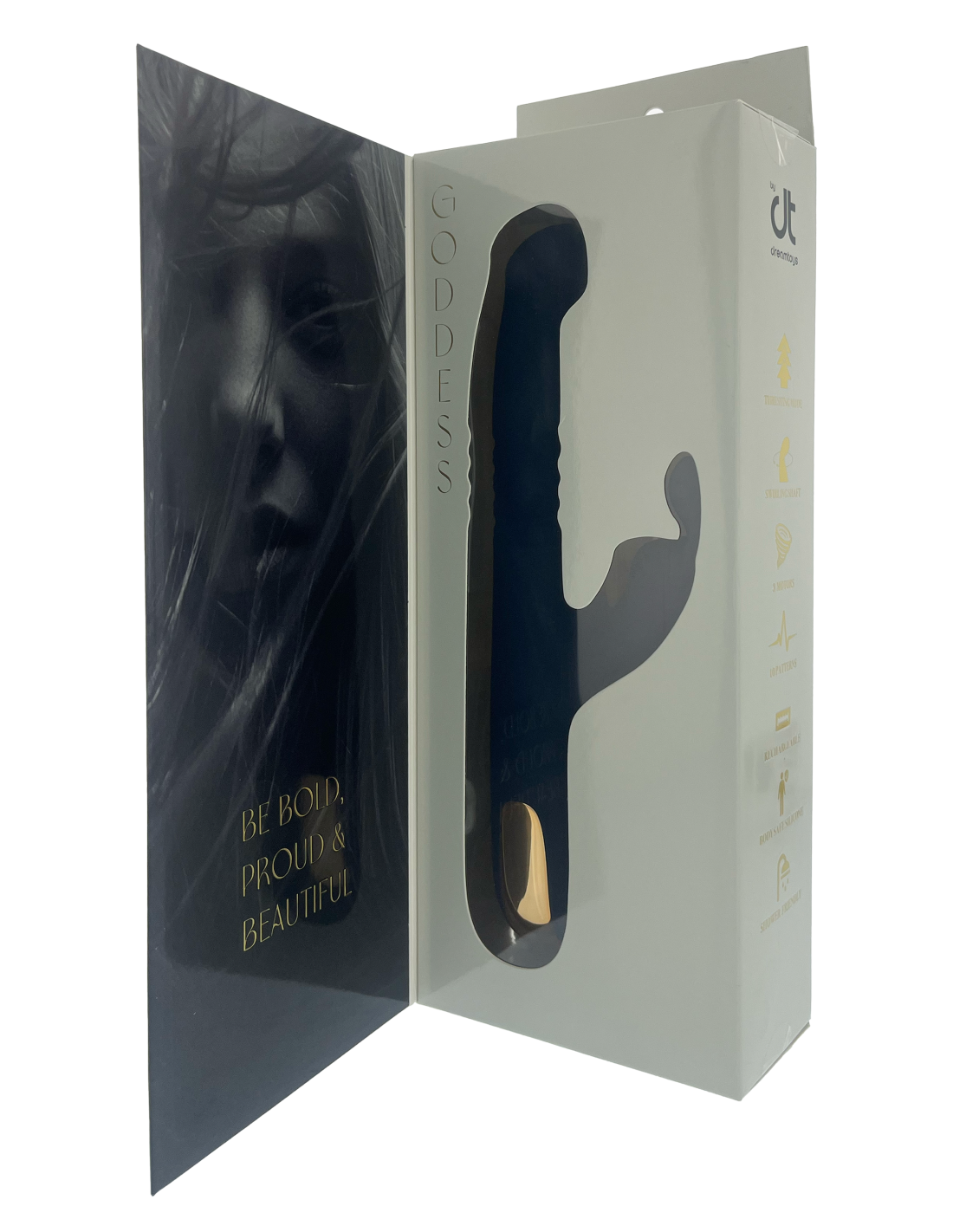 Duo vibrator Phaedra with up-and-down swirling body function. In the same style as the other Goddess Collection toys, Phaedra is made of dark blue silicone with gold coloured details. The Goddess Collection vibe has 10 swirling vibrations in the main body and 7 vibration rhythms and 3 speeds in the clitoris stimulator. For ease of use there are separate buttons for control of the functions in the main body and those in the clitoral stimulator. This vibe is shower friendly, made of bodysafe materials and rechargeable with the included magnetic USB cable.