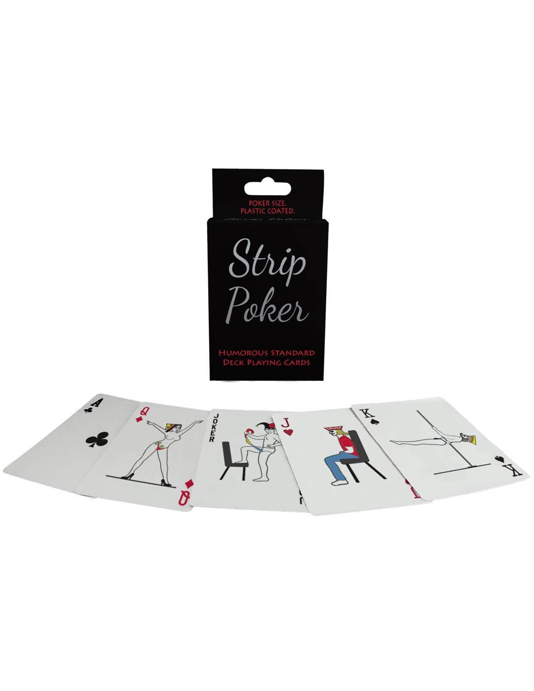 A humorous set of stripper-themed poker cards. Great for playing strip poker, and other adult card games. Jokers are playful strippers, the Kings are male strippers, Queens are female strippers, and Jacks are patrons touching themselves.