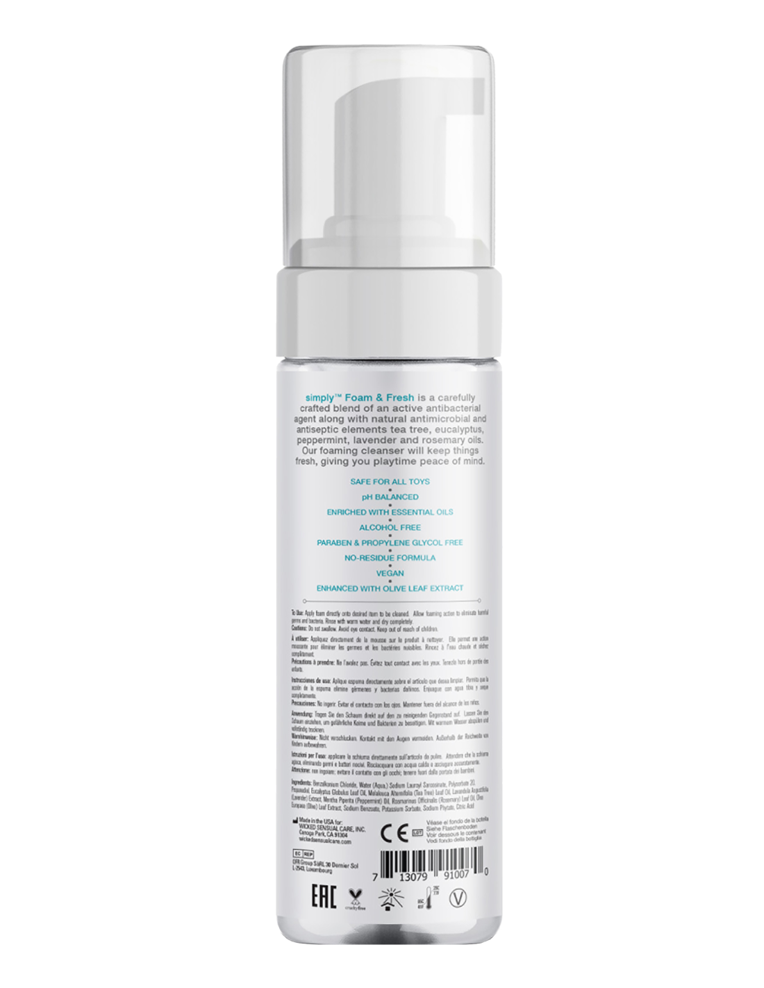 Simply™ Foam and Fresh es una mezcla cuidadosamente elaborada de un agente antibacteriano activo junto con elementos antimicrobianos y antisépticos naturales, aceites de árbol de té, eucalipto, menta, lavanda y romero. Nuestro limpiador en espuma mantendrá todo fresco y te brindará tranquilidad mientras juegas.