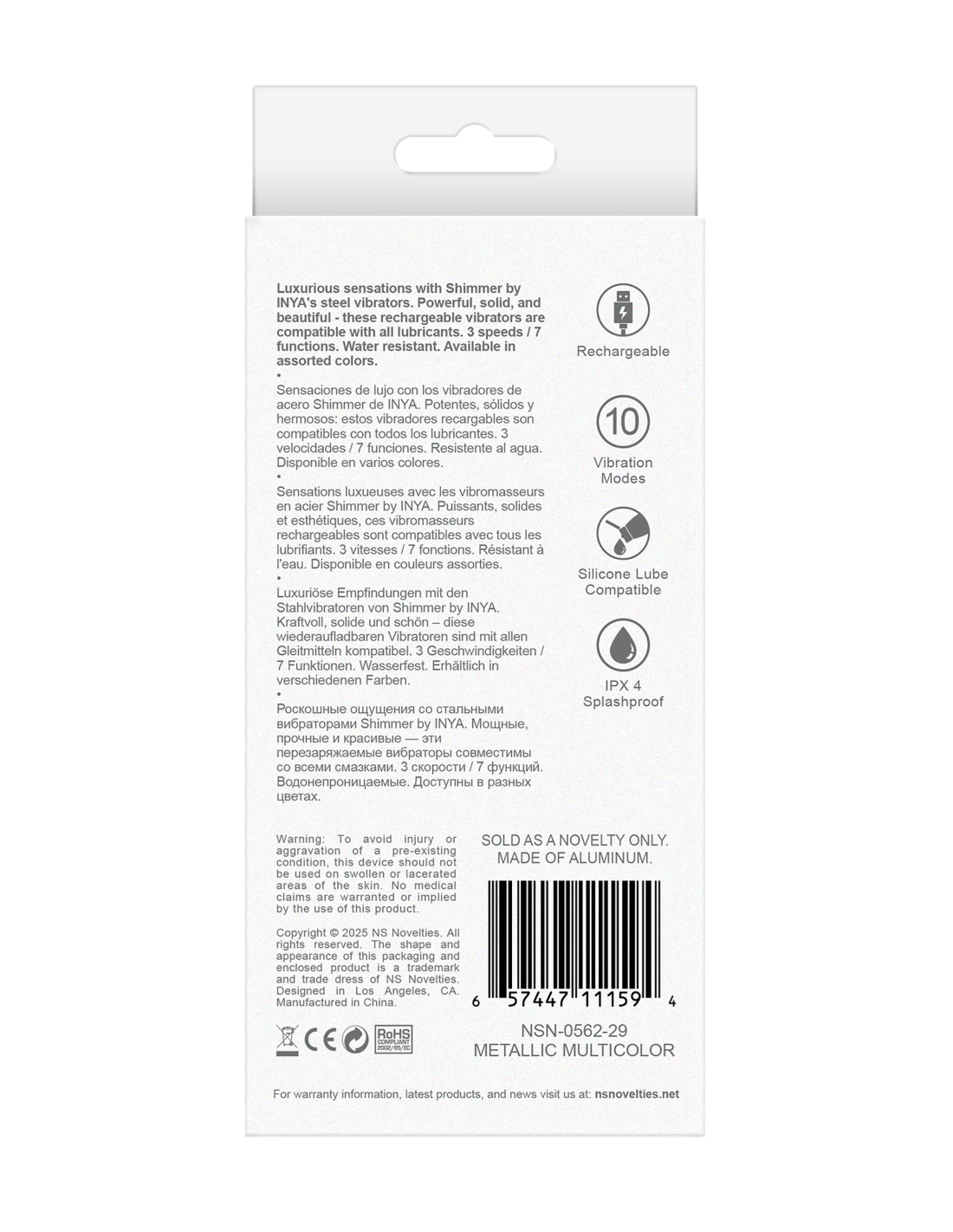 Luxurious sensations with Shimmer by INYA's steel vibrators. Powerful, solid, and beautiful - these rechargeable vibrators are compatible with all lubricants. 3 speeds / 7 functions. Water resistant.