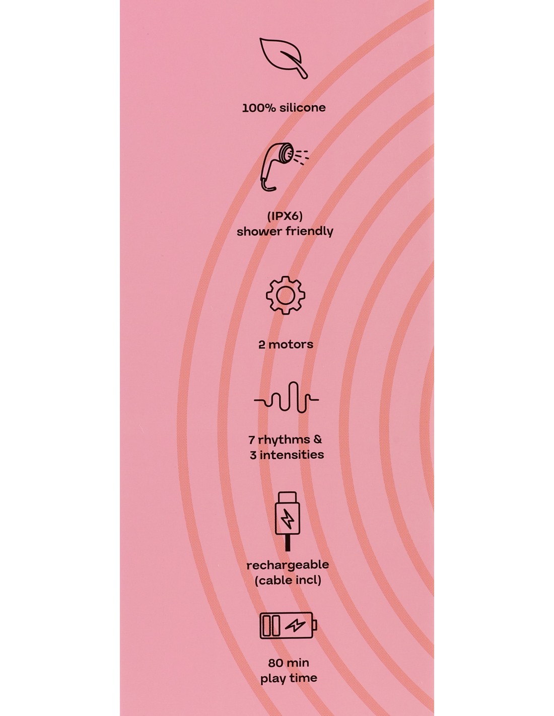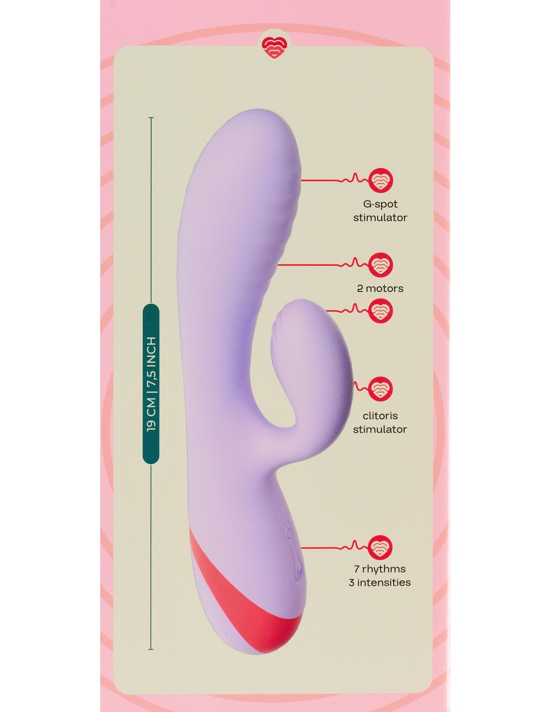 - Dual motors for internal and external stimulation 3 speeds + 7 vibration patterns