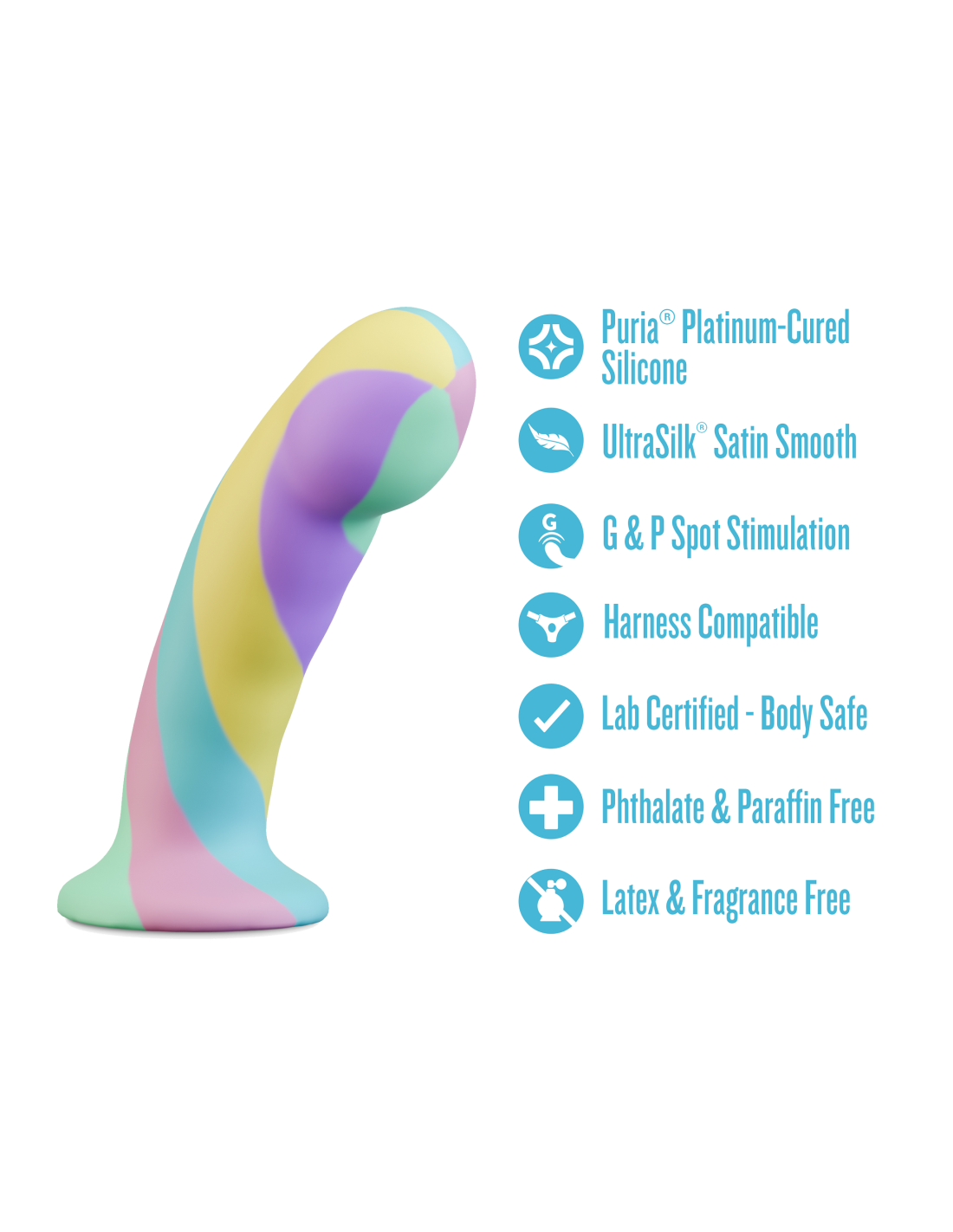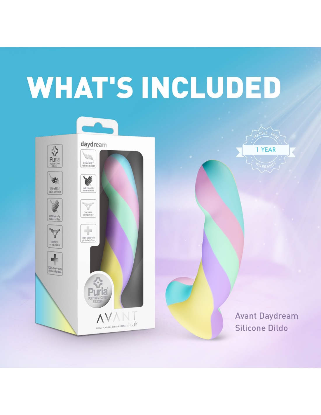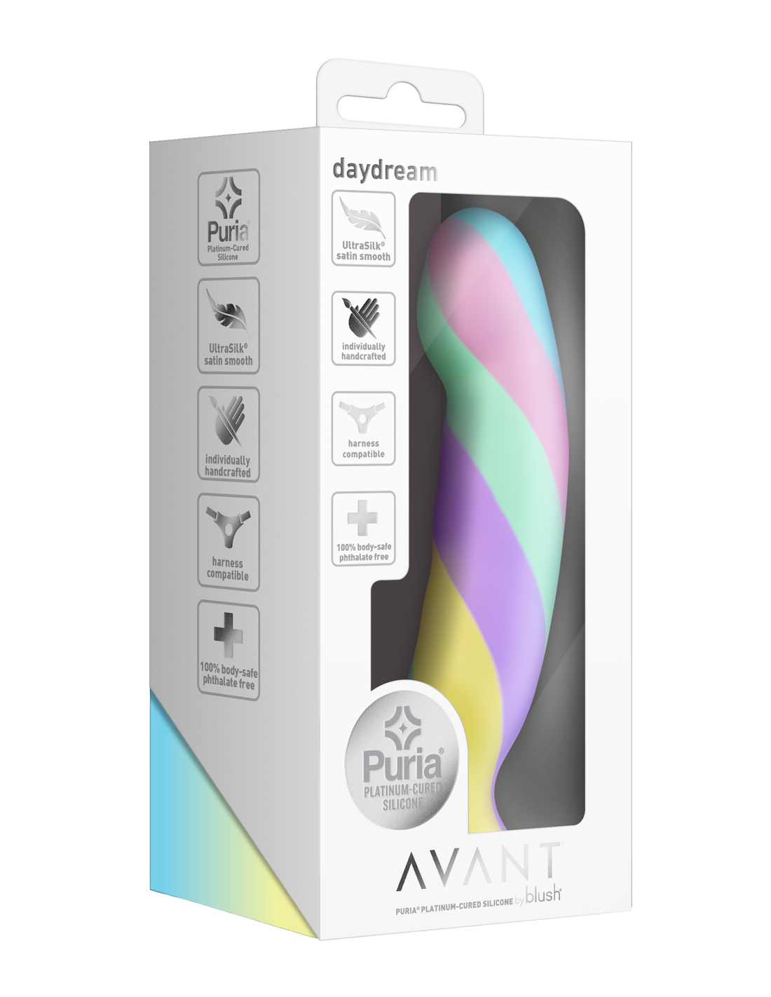 Modern, stylish, and beautiful—meet Avant Daydream. This piece is handcrafted for a truly artisanal feel, giving you a one-of-a-kind toy that reflects both quality and individuality. With soothing pastel hues that inspire relaxation, Daydream features a broad, smooth head expertly shaped to elevate both G-spot and P-spot pleasure with seamless precision. Its gently curved shaft offers comfort and control for a satisfying experience every time. Built for both solo and shared adventures, Daydream is fully harness compatible, opening the door to versatile partnered play and offering the freedom of hands-free exploration. Crafted from Puria®, our premium platinum-cured silicone, and wrapped in an UltraSilk® satin-smooth finish, it feels irresistibly soft against the skin while remaining non-porous, hypoallergenic, and easy to clean. Let Avant Daydream be your invitation to escape into blissful, dreamy delight.