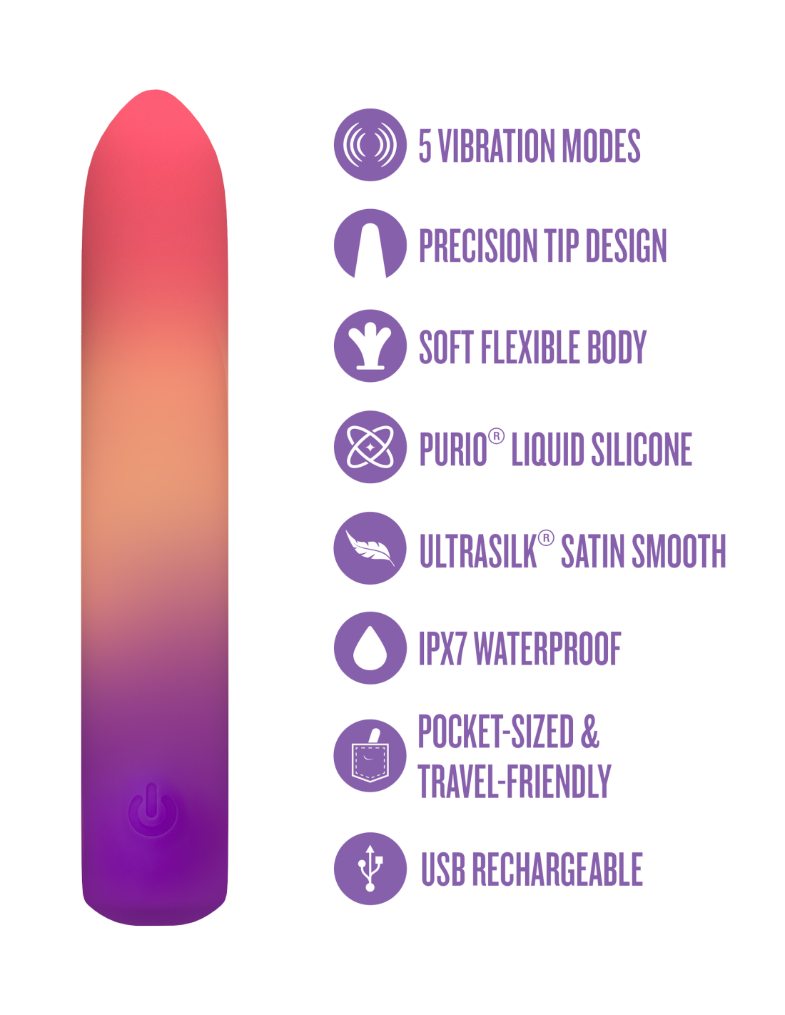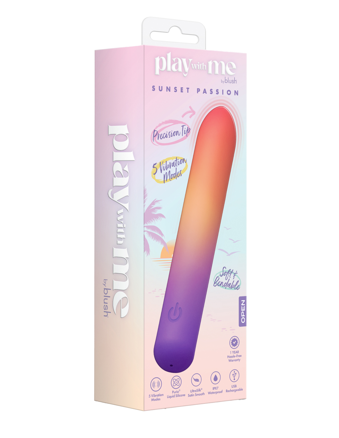 Embrace the radiant glow of twilight with Play With Me’s Sunset Passion, a sleek bullet vibrator designed to bring pure bliss to your intimate moments. With 5 deep and powerful vibration modes, Sunset Passion lets you customize every sensation. Whether it’s slow, seductive foreplay, pinpoint clitoral stimulation, or sensual nipple pleasure, Sunset Passion delivers focused vibrations exactly where you crave them most. Crafted from Purio® platinum-cured liquid silicone and wrapped in satin-smooth UltraSilk®, Sunset Passion feels velvety soft against your skin while staying flexible for comfort. Its IPX7 waterproof design invites you to explore bath or shower play, while the convenient USB charging ensures it’s always ready when you are. Whether indulging in solo exploration or with a partner, Sunset Passion transforms every touch into a moment of radiant delight, carrying you away in waves of pure indulgence.