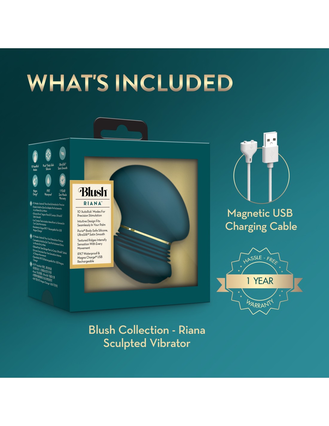 Illuminate your desires with Riana, from The Blush Collection. Designed for those who crave indulgent pleasure, this graceful clitoral stimulator moves in perfect harmony with your body to deliver deep, rhythmic stimulation. Powered by Blush’s exclusive AutoRub™ technology, Riana glides with sensual precision, mimicking the natural motion of touch. Ten vibration modes and soft, textured ridges heighten every sensation, inviting you to tease, explore, and surrender to your own rhythm. Riana rests naturally in your palm, allowing you to angle, press, or glide it exactly where it feels best. Crafted from Puria® 100% body-safe silicone and finished with our satin-smooth UltraSilk® coating, its velvety finish enhances every touch with effortless elegance. Riana is waterproof and Magna Charge® USB rechargeable, designed to fit effortlessly into your self-care routine and easy to use, clean, and store. Let your pleasure move in perfect rhythm.