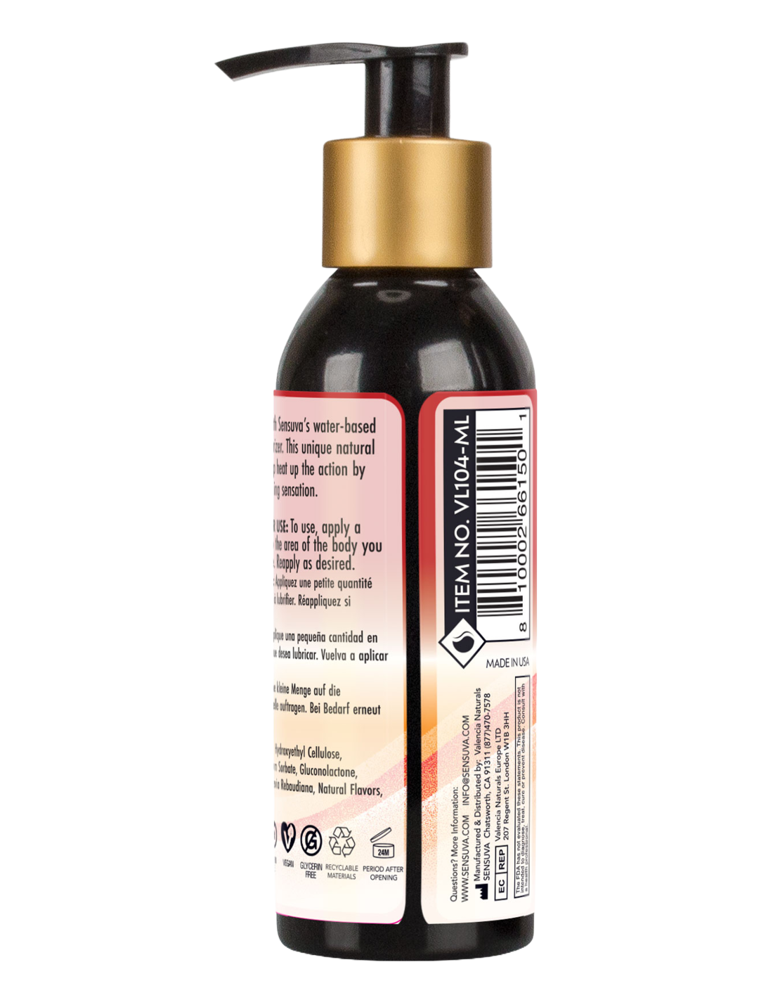 Feel the heat with Sensuva’s water-based personal moisturizer. This unique natural formula will help heat up the action by creating a warming sensation.Sensuva's personal lubricant for penile, anal and/or vaginal application is intended to moisturize and lubricate to enhance the ease and comfort of intimate sexual activity and supplement the body's natural lubrication. The product is compatible with natural latex polyisoprene and polyurethane condoms.