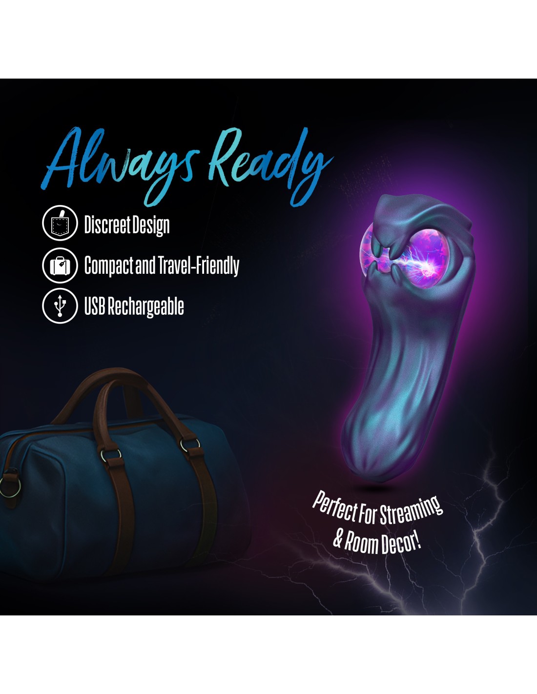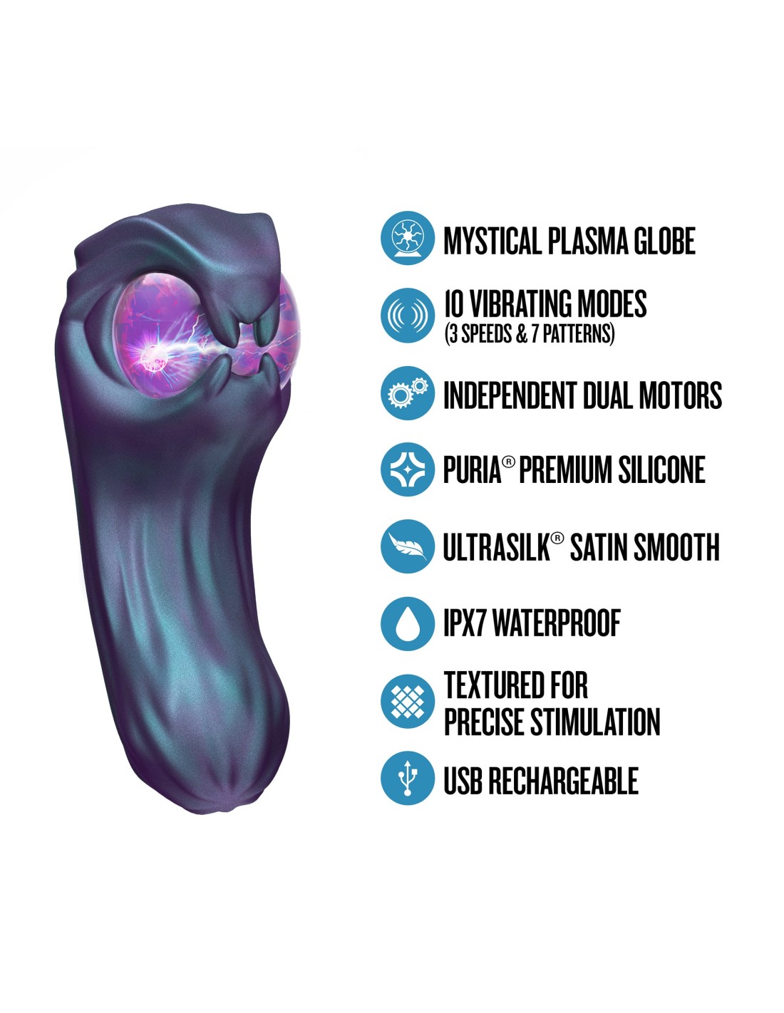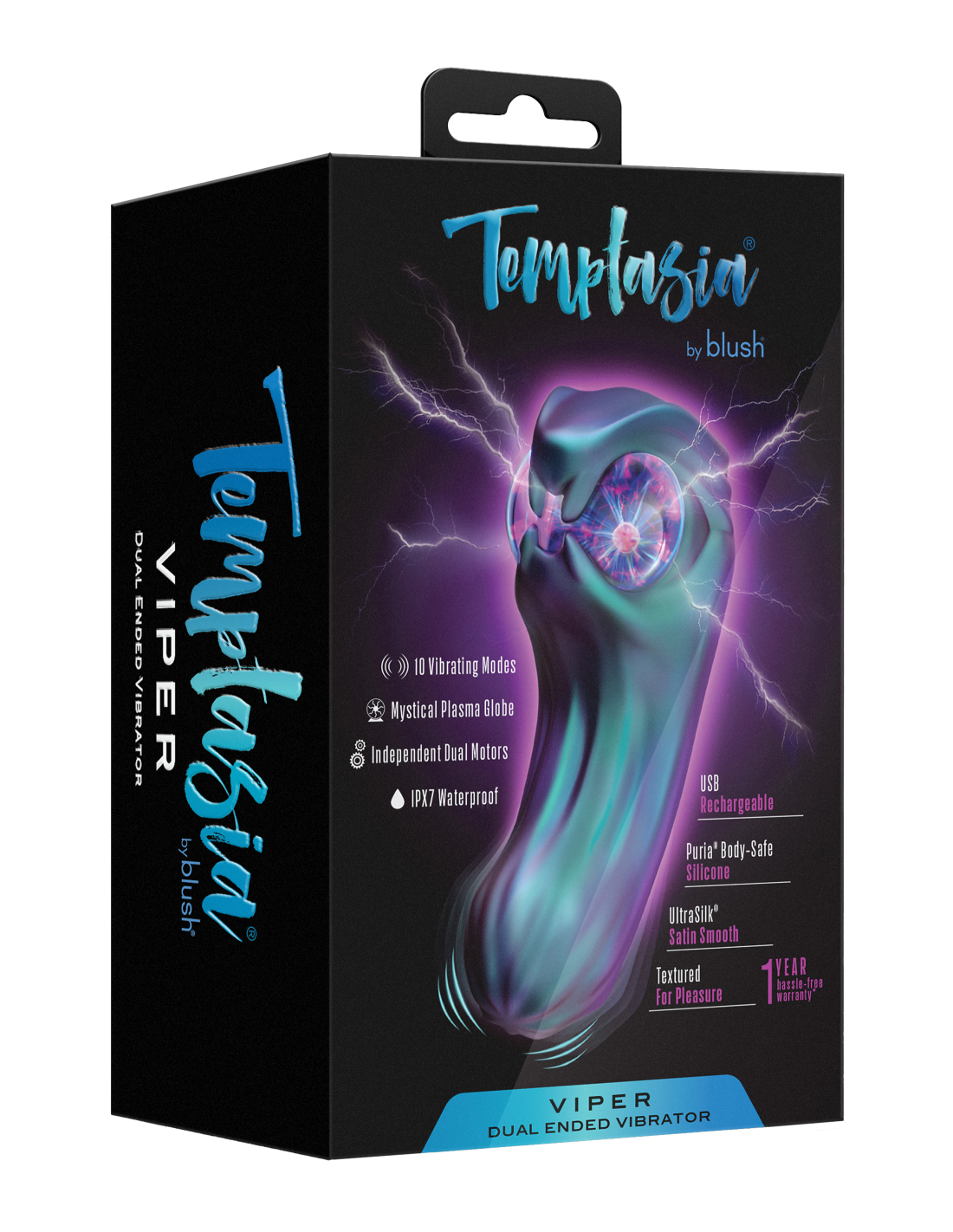 Temptasia’s Viper lures you into a spellbinding embrace with its mystical plasma globe, pulsing like lightning beneath your touch, glowing brighter as your arousal builds. Featuring 10 dual vibration modes (3 speeds & 7 patterns), Viper enhances every touch, awakening both internal and external pleasure. Its dual-ended design doubles the temptation, with each side uniquely sculpted to tease, grip, and awaken your deepest desires. Every curve and ridge is heightens sensation, while Blush’s UltraSilk® satin-smooth silicone glides luxuriously across your skin for an indulgent touch. Viper is waterproof and USB rechargeable, so it’s always ready when your desires awaken. Its radiant glow and sleek, daring design ignite passion the moment you touch it. Bold and irresistibly seductive, it captivates, excites, and drives you deeper into waves of electrifying pleasure.