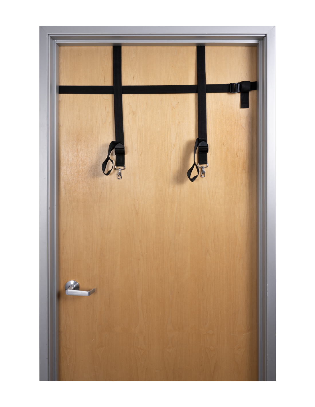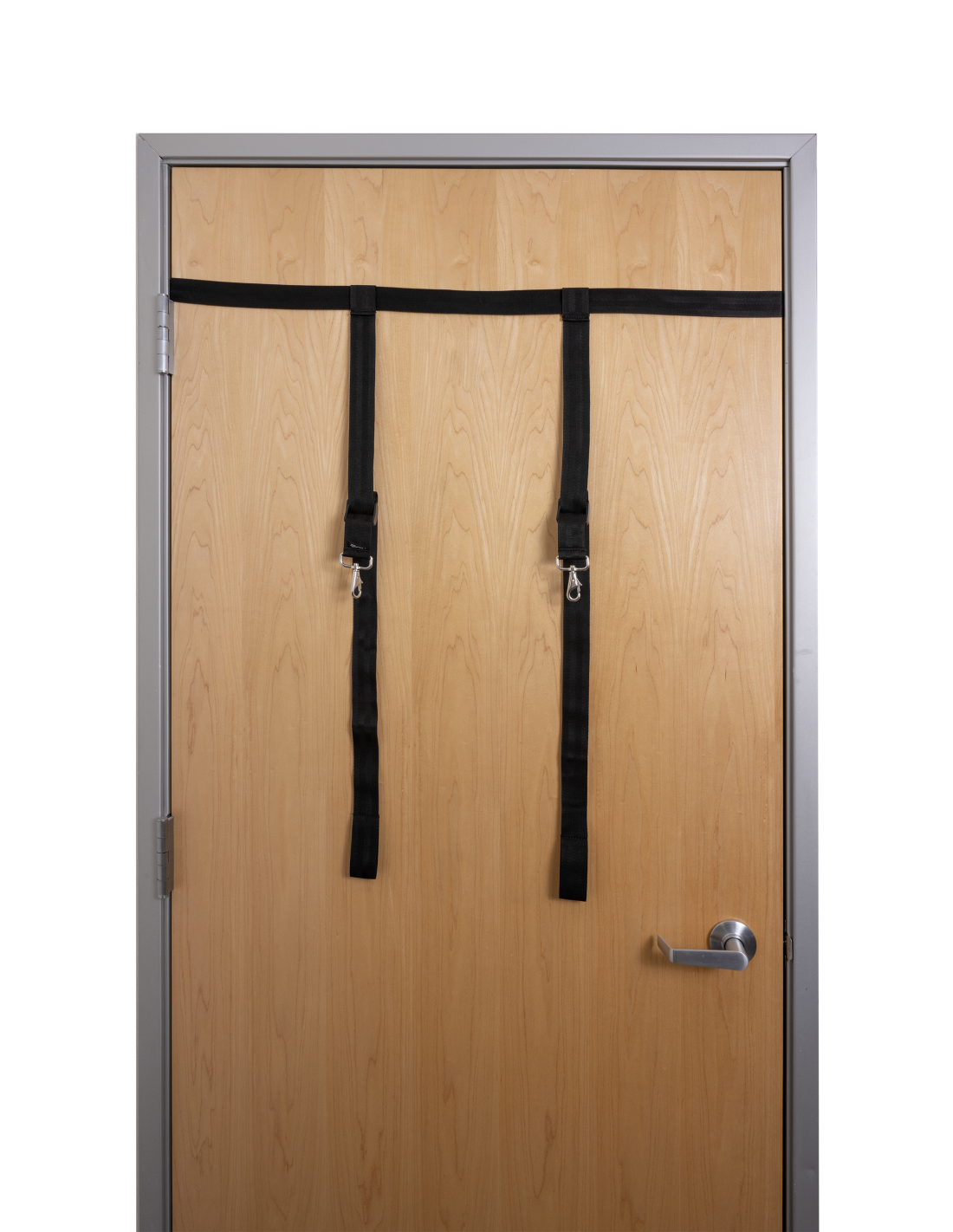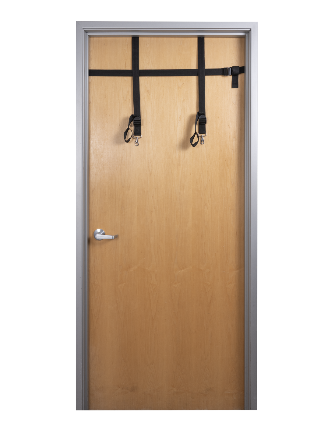 - Adjustable reinforced horizontal strap anchors securely around the door