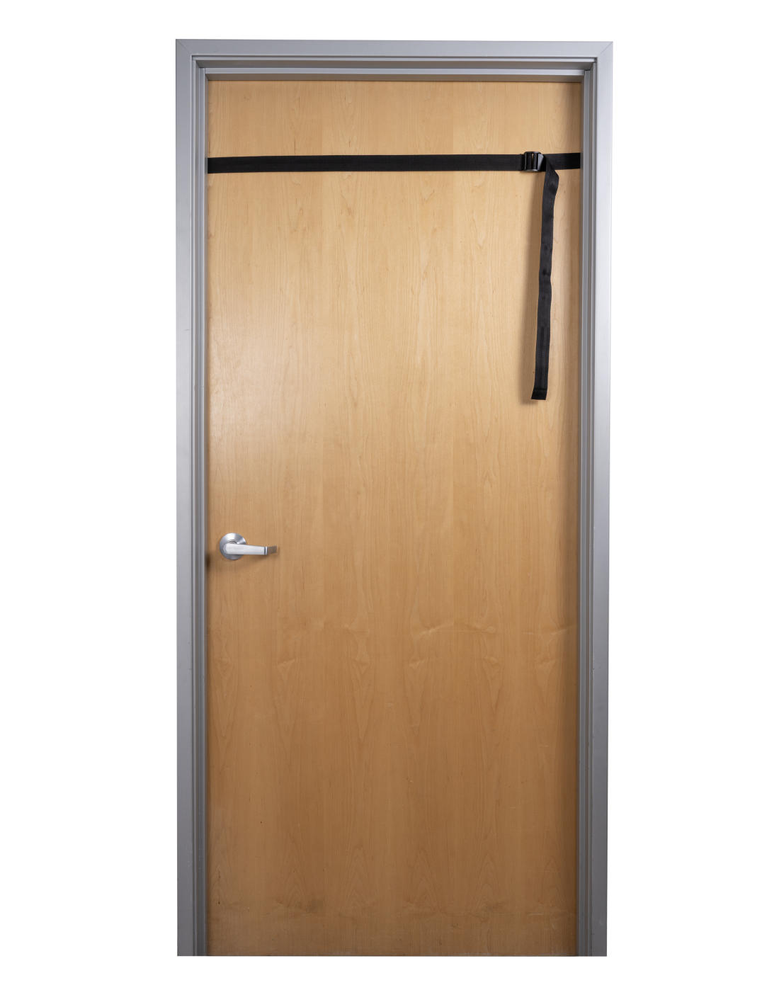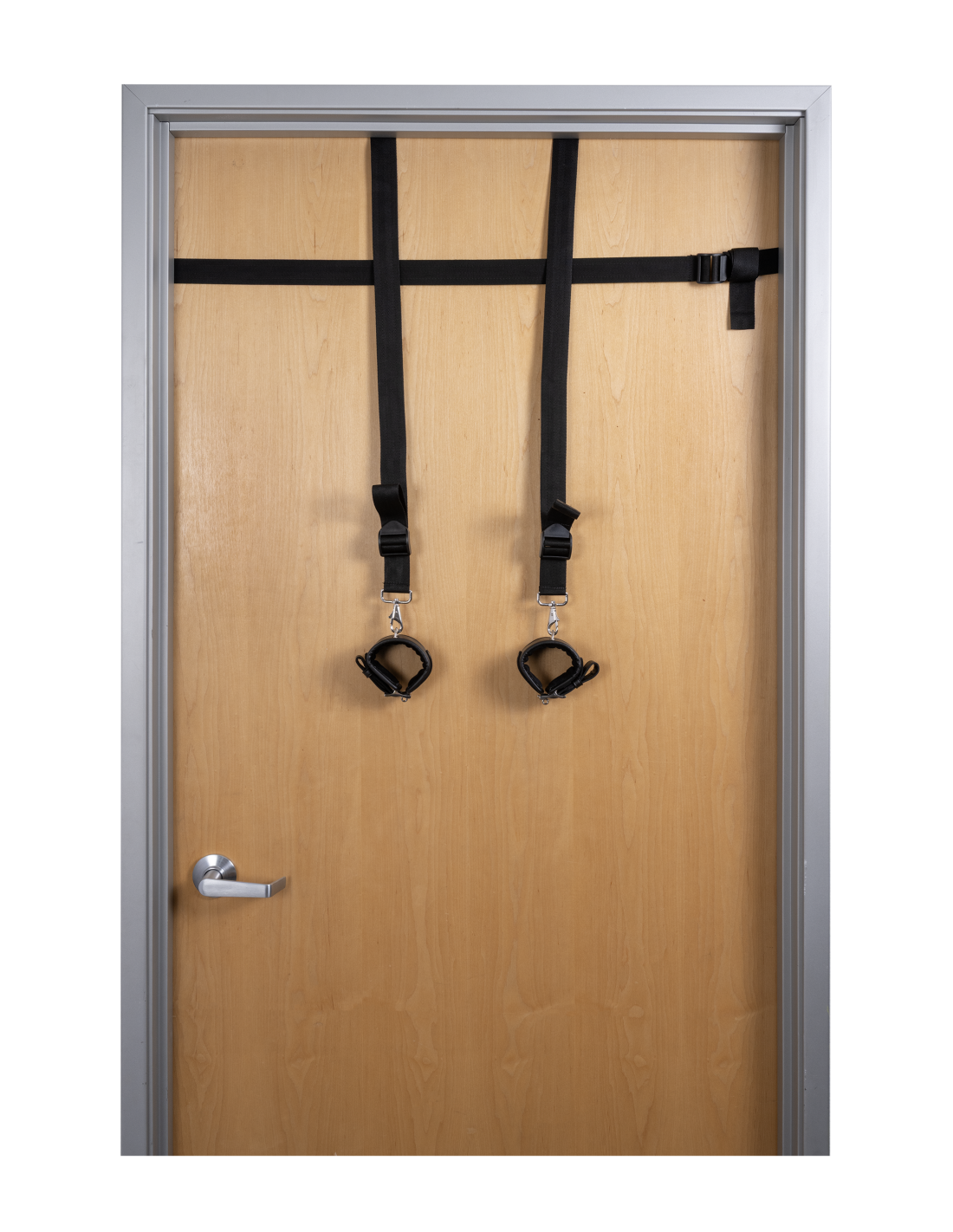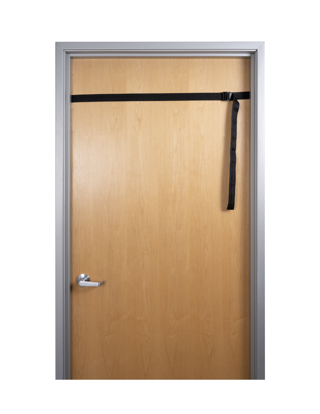 - Adjustable reinforced horizontal strap anchors securely around the door