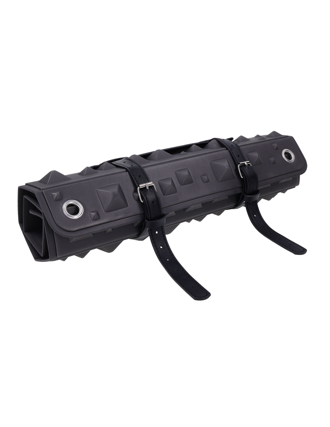 - Wipes clean and rolls up for easy storage in black faux leather buckled holster