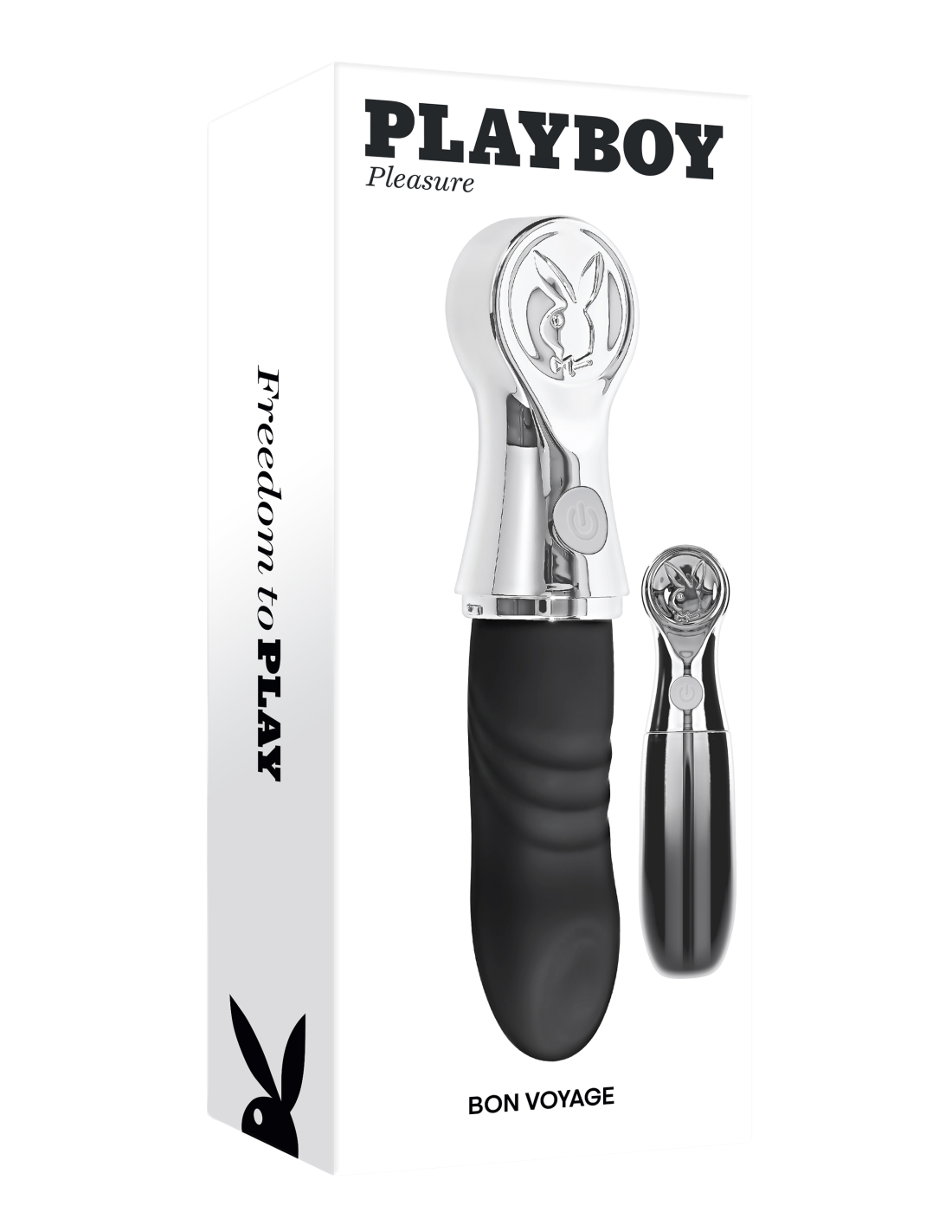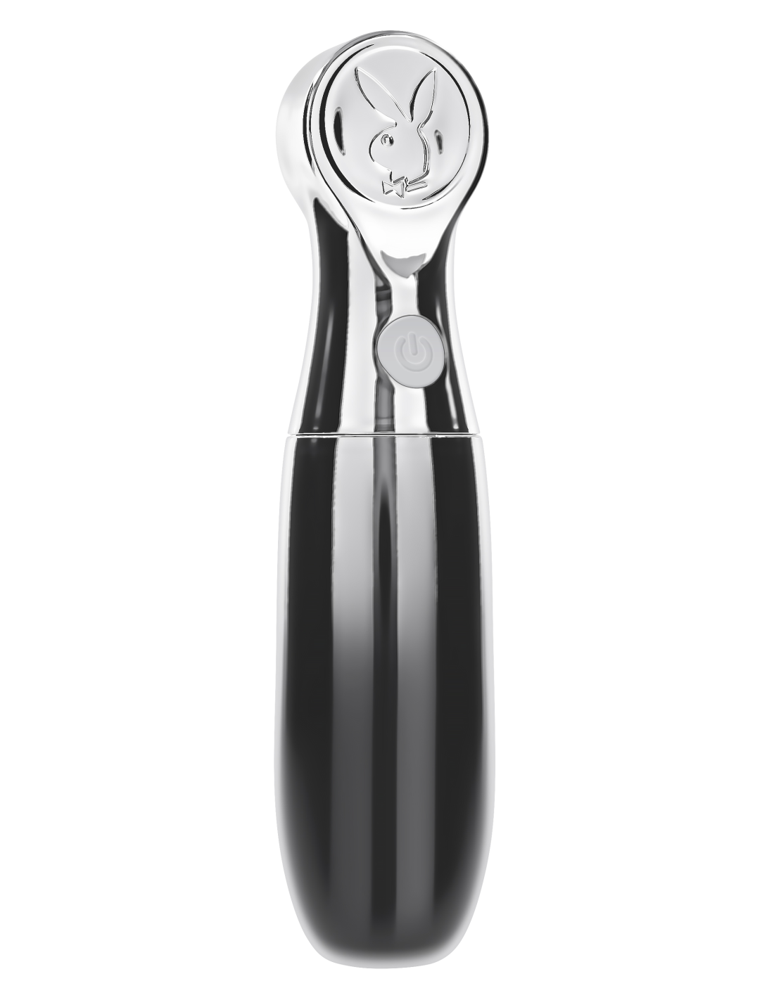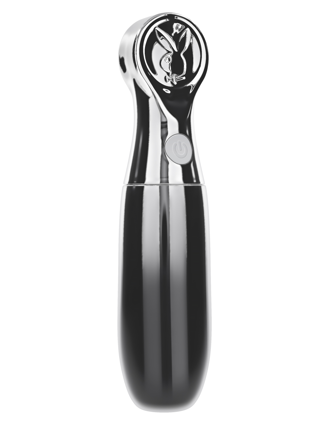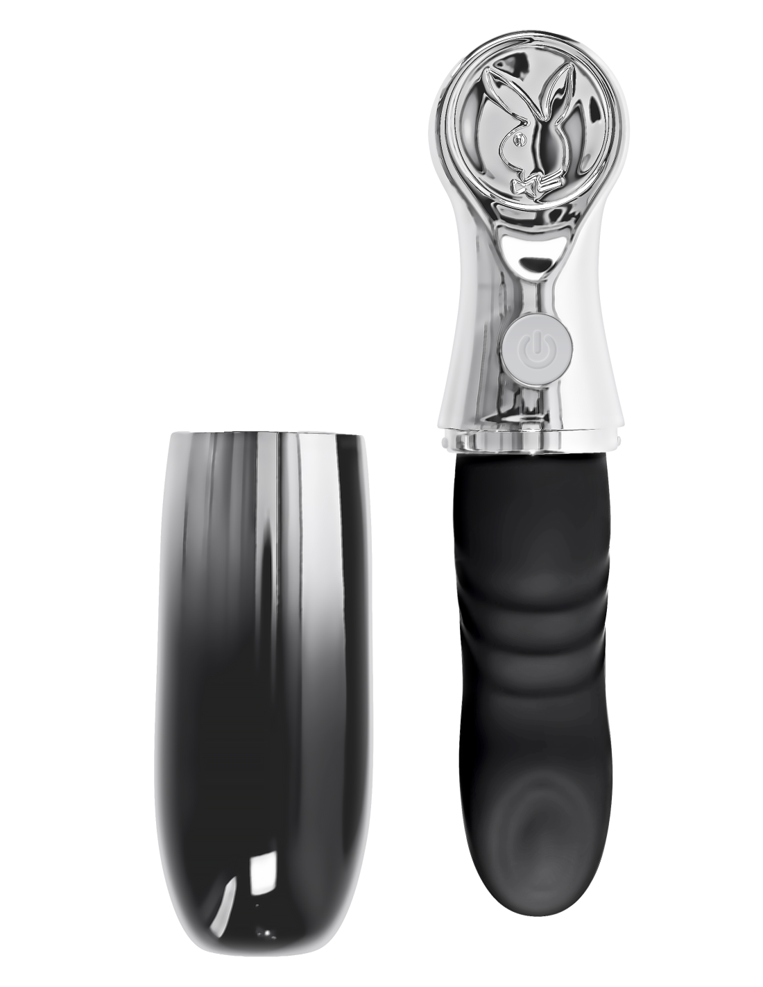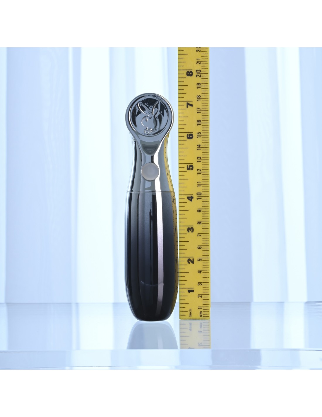 Bon Voyage! We’ve got your travel adventures covered with this powerful tapping toy you can pop into any purse, bag or carry-on luggage for pleasure on the go! The chunky shaft is ribbed for extra sensation and comes to a head with 7 speeds and rhythms of tapping in the beautifully angled tip. With its ombre chrome carrier that twists into place right underneath the ergonomic Playboy rabbit head, your toy is fully protected until you pull it out for play time whenever you like. Heading to the hot tub? Bon Voyage can join your water games as it’s completely submersible!