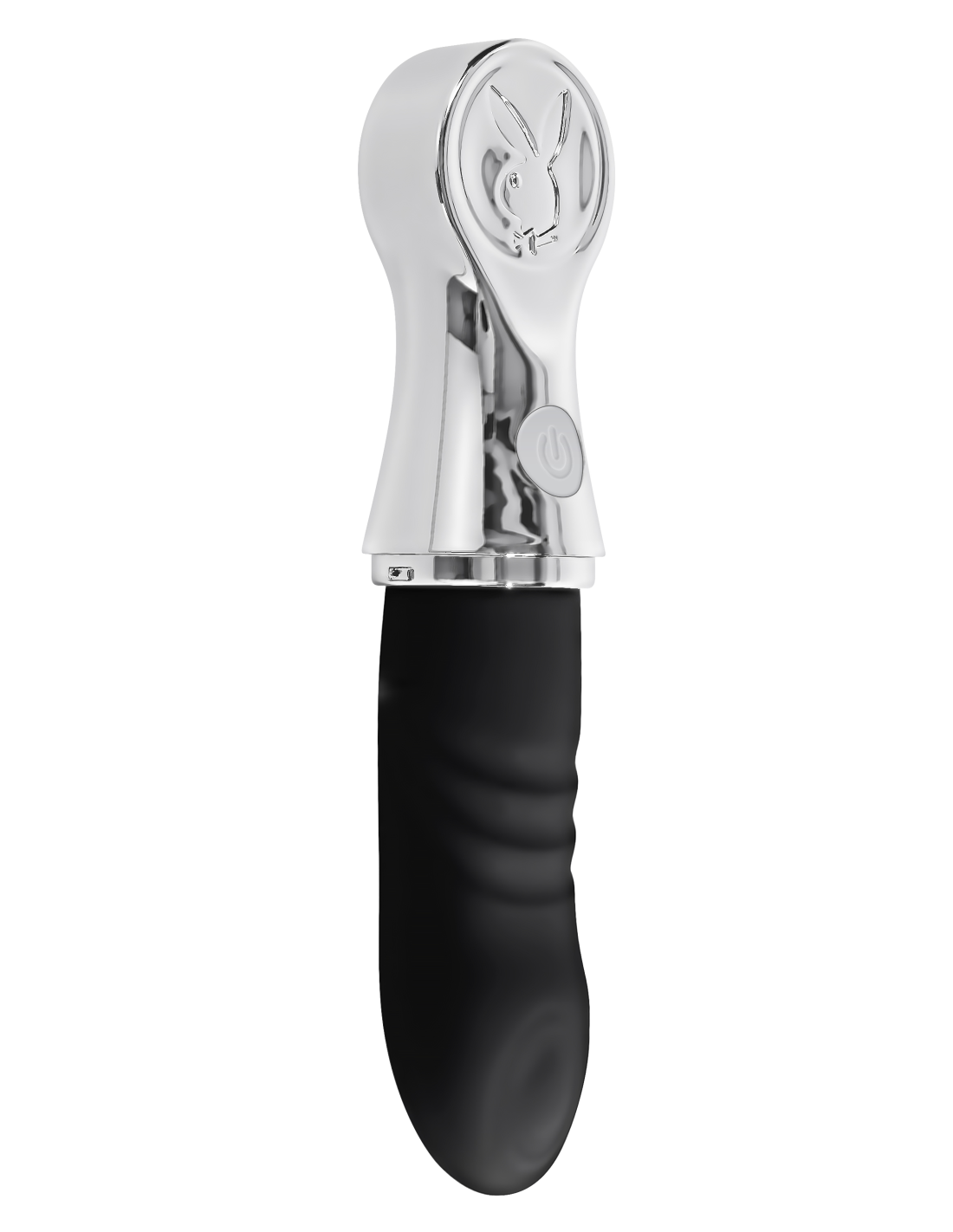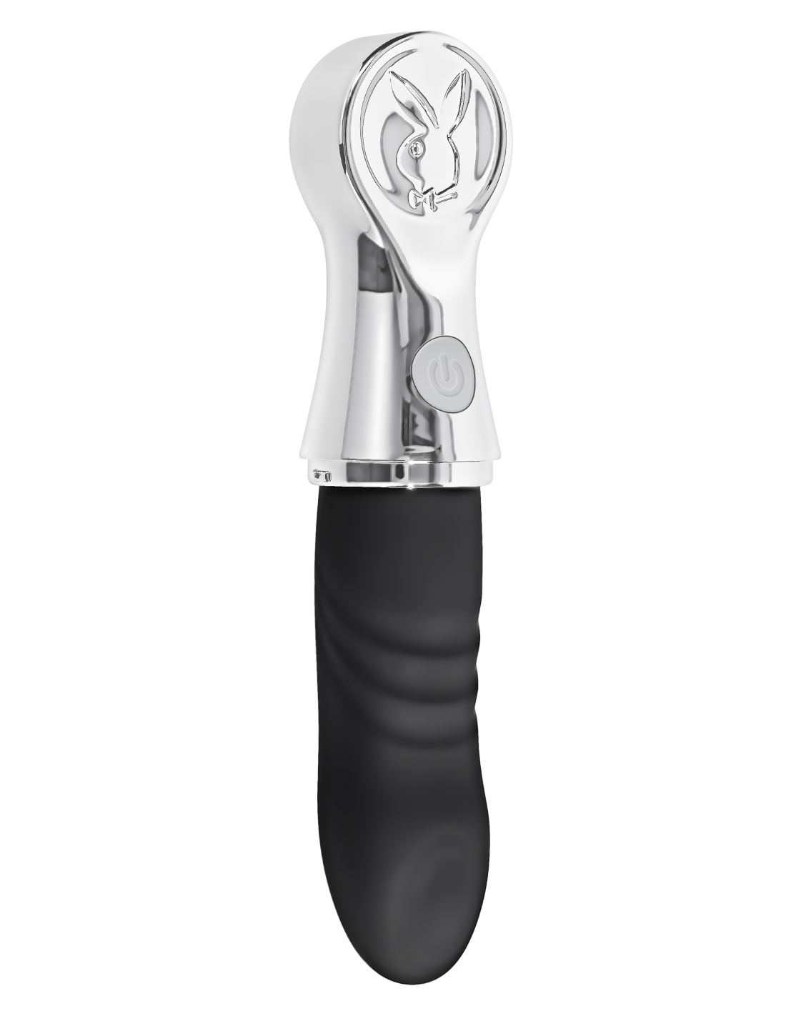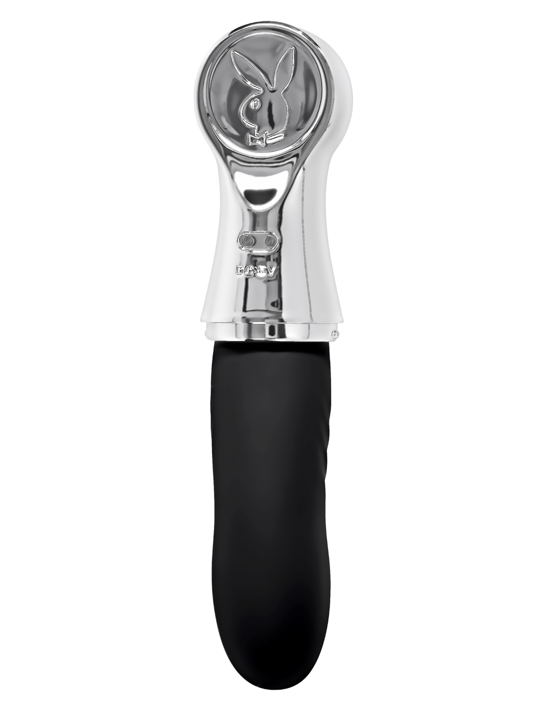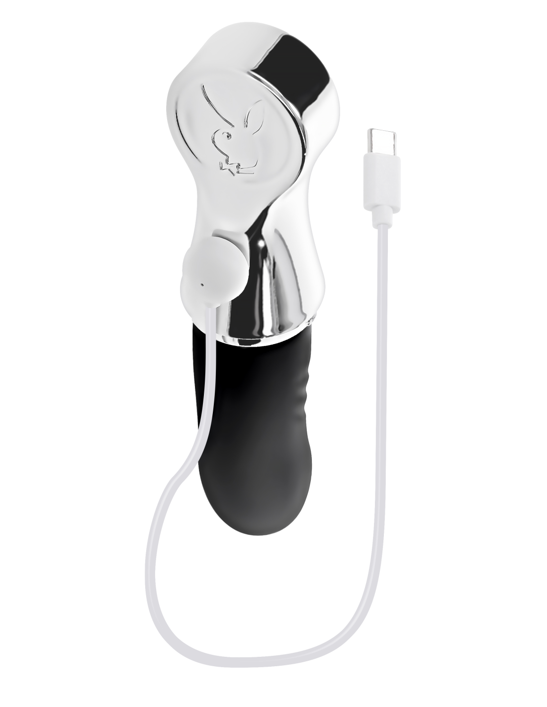 Bon Voyage! We’ve got your travel adventures covered with this powerful tapping toy you can pop into any purse, bag or carry-on luggage for pleasure on the go! The chunky shaft is ribbed for extra sensation and comes to a head with 7 speeds and rhythms of tapping in the beautifully angled tip. With its ombre chrome carrier that twists into place right underneath the ergonomic Playboy rabbit head, your toy is fully protected until you pull it out for play time whenever you like. Heading to the hot tub? Bon Voyage can join your water games as it’s completely submersible!