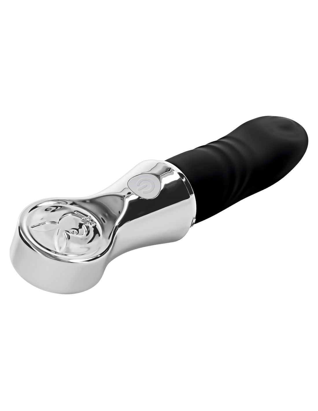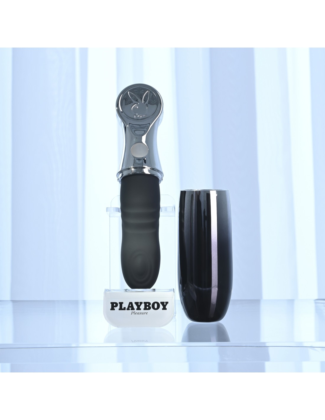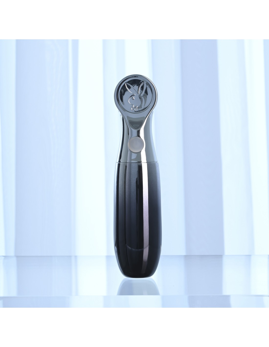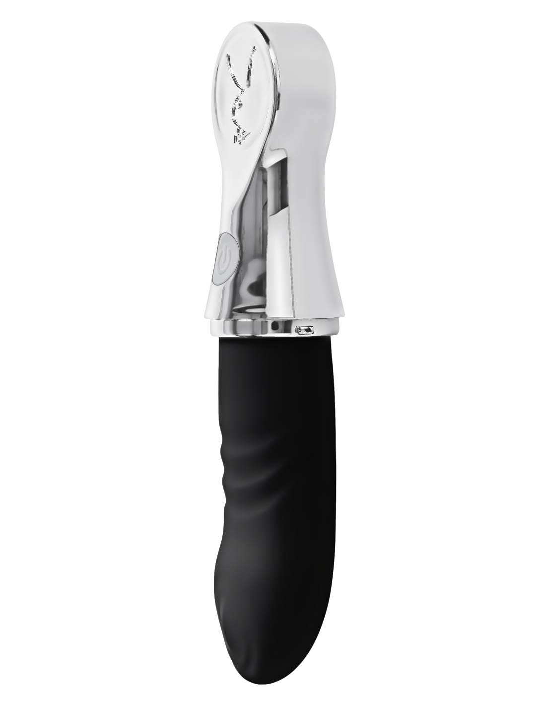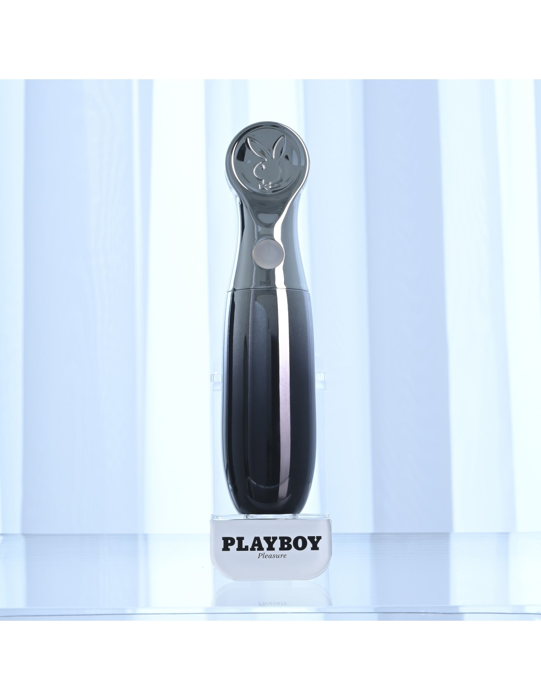 Bon Voyage! We’ve got your travel adventures covered with this powerful tapping toy you can pop into any purse, bag or carry-on luggage for pleasure on the go! The chunky shaft is ribbed for extra sensation and comes to a head with 7 speeds and rhythms of tapping in the beautifully angled tip. With its ombre chrome carrier that twists into place right underneath the ergonomic Playboy rabbit head, your toy is fully protected until you pull it out for play time whenever you like. Heading to the hot tub? Bon Voyage can join your water games as it’s completely submersible!