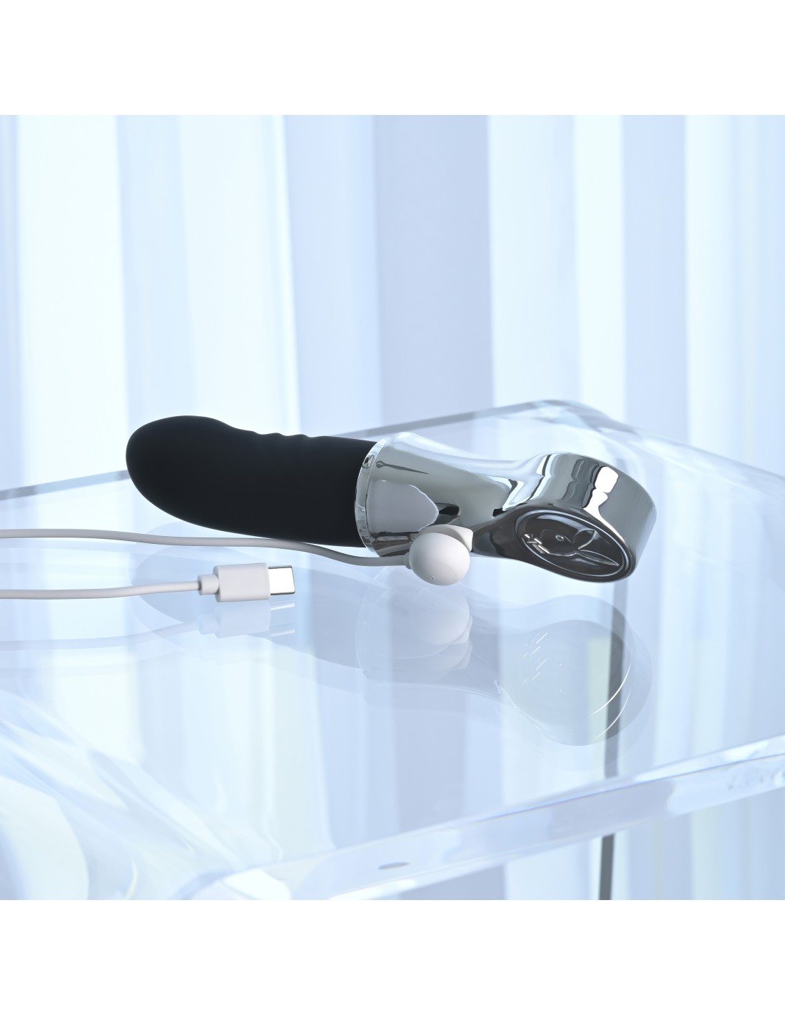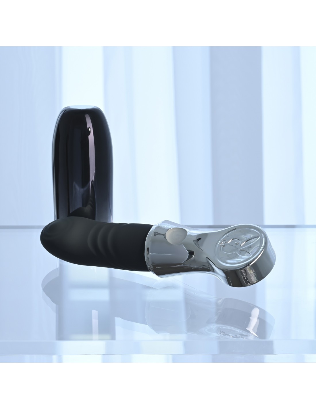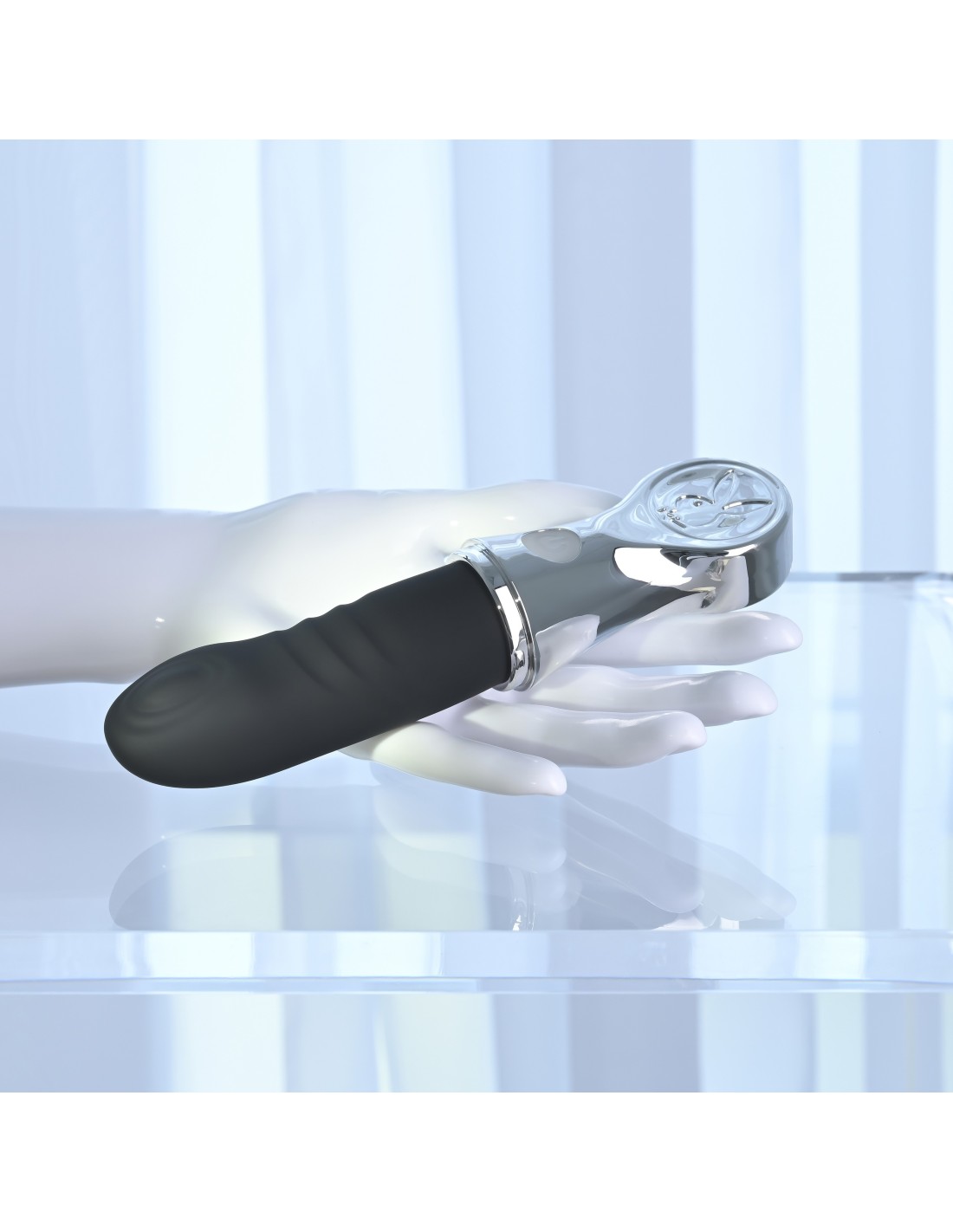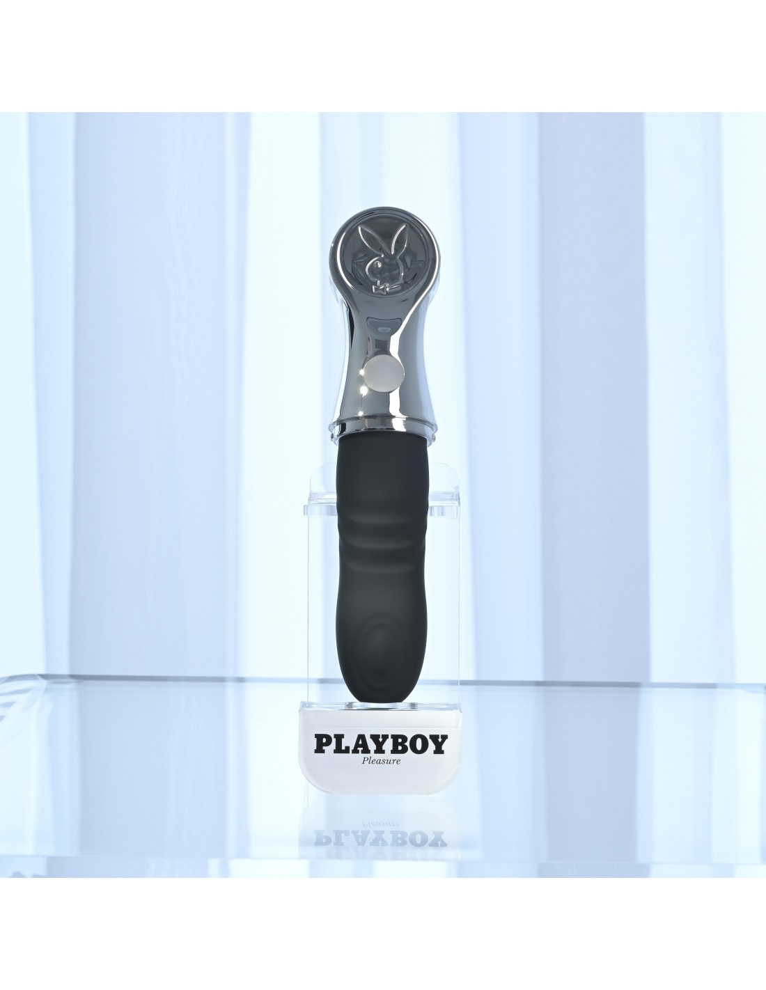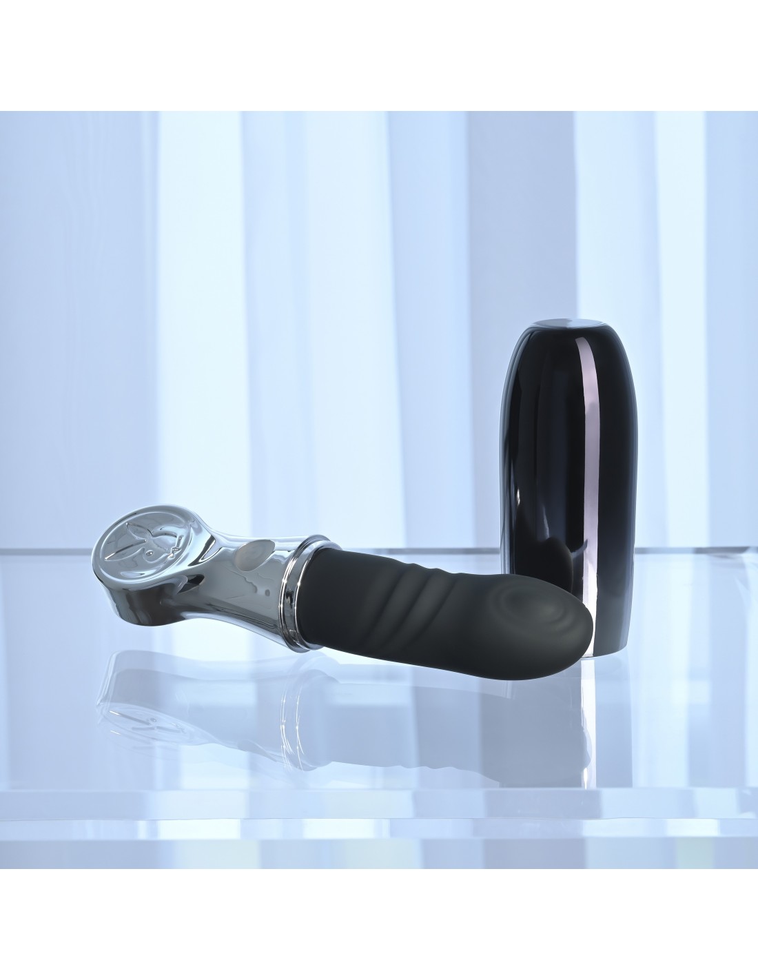 Bon Voyage! We’ve got your travel adventures covered with this powerful tapping toy you can pop into any purse, bag or carry-on luggage for pleasure on the go! The chunky shaft is ribbed for extra sensation and comes to a head with 7 speeds and rhythms of tapping in the beautifully angled tip. With its ombre chrome carrier that twists into place right underneath the ergonomic Playboy rabbit head, your toy is fully protected until you pull it out for play time whenever you like. Heading to the hot tub? Bon Voyage can join your water games as it’s completely submersible!