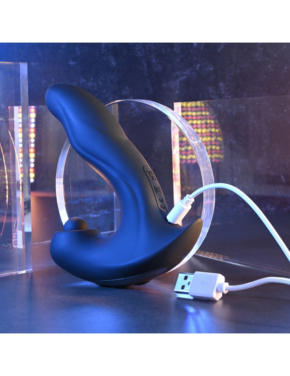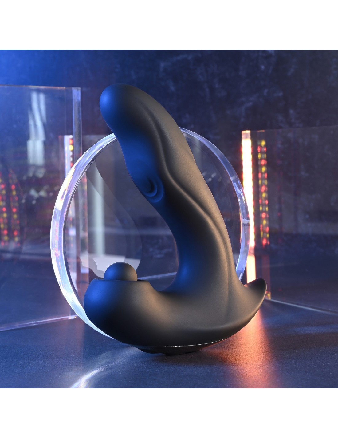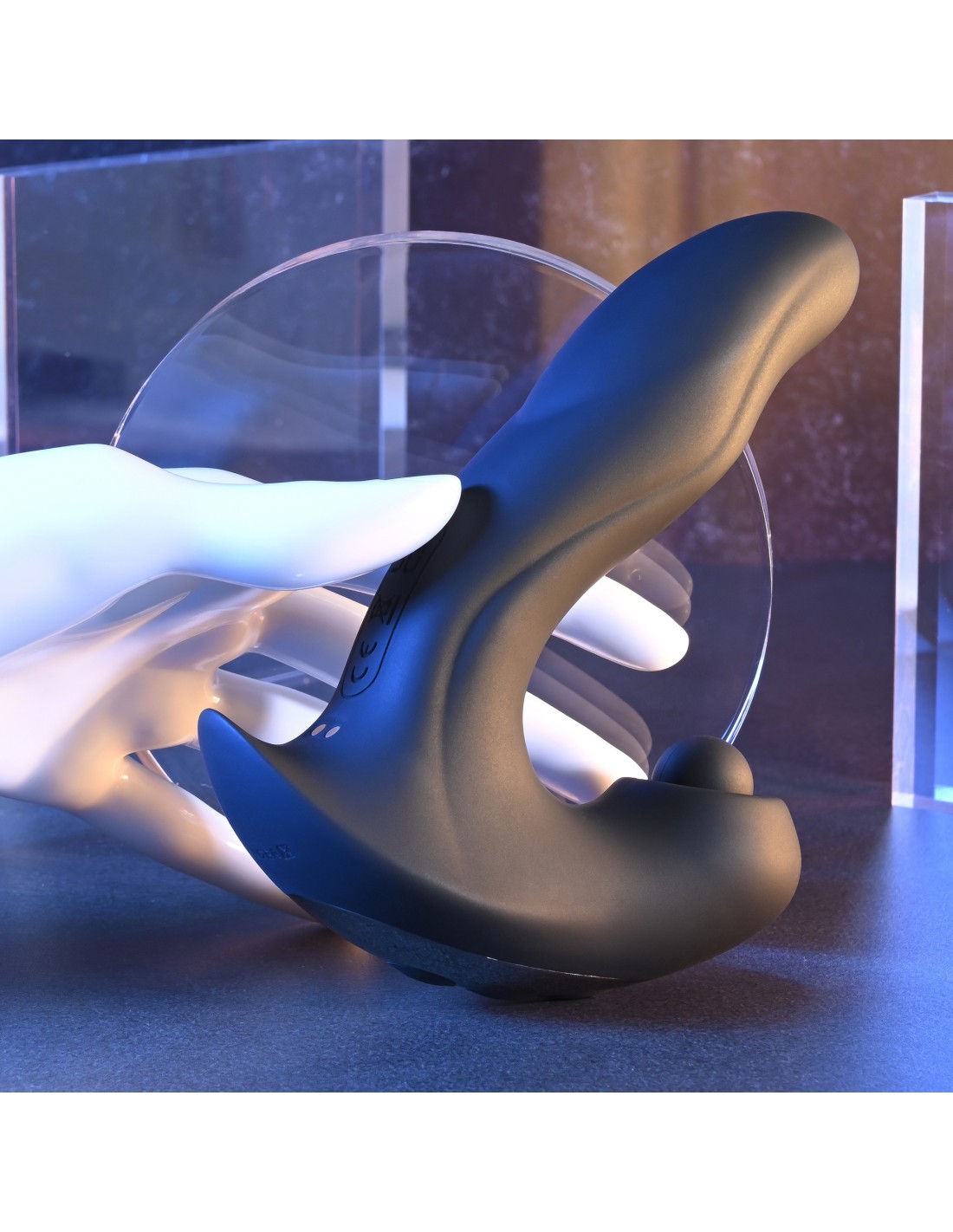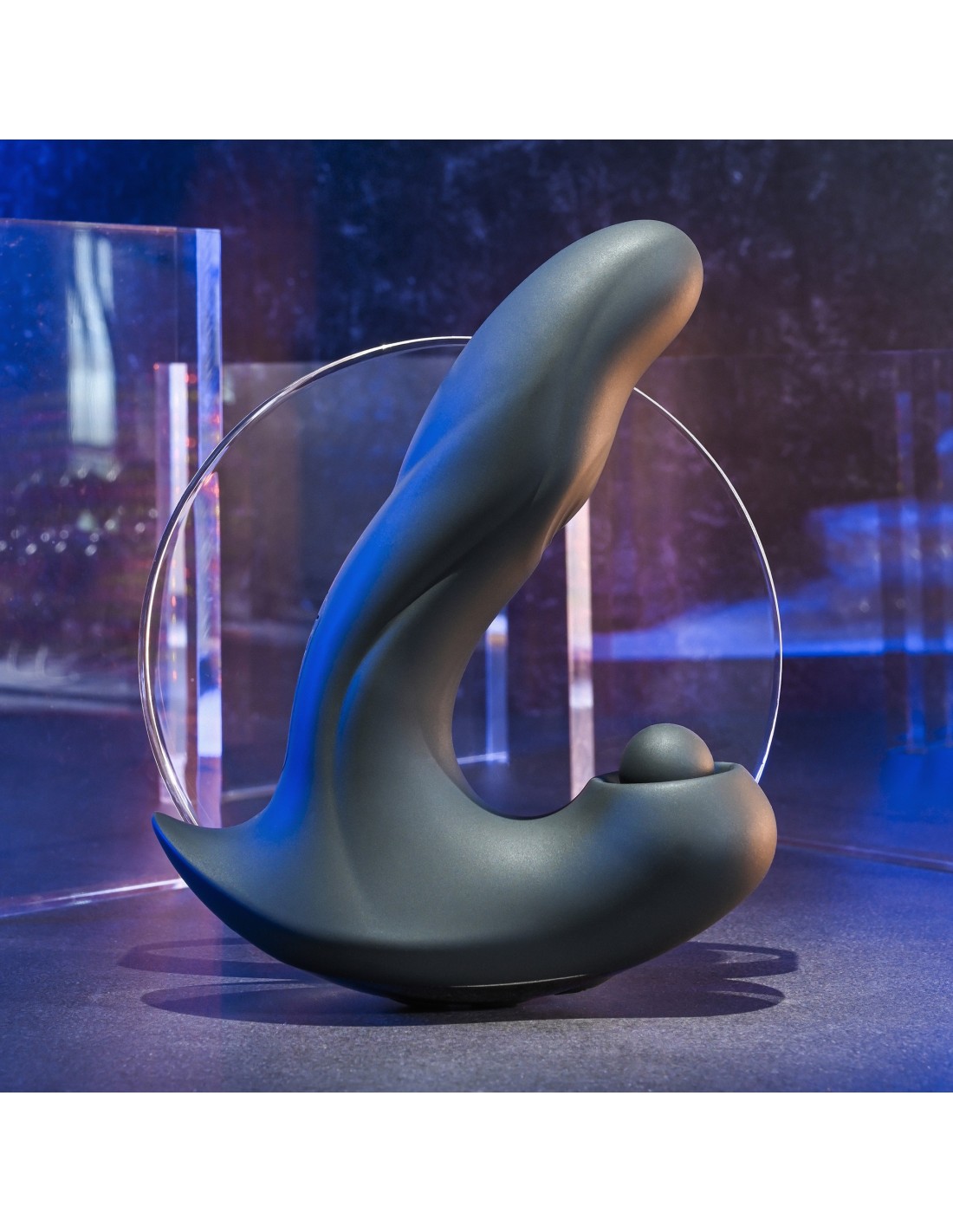 Esta forma robusta bien diseñada cuenta con 3 motores distintos que funcionan de forma independiente para una máxima flexibilidad de combinaciones y experiencia. El eje principal tiene textura y ángulo con vibración de 10 velocidades en el cabezal y una intensa función de golpeteo de 5 velocidades a mitad de camino. La base ergonómica, que tiene un panel de control de 3 botones debajo, sostiene una bola pulsante de 5 velocidades en el extremo de su punta robusta. Completamente sumergible en agua, fácil de limpiar y recargable por USB.