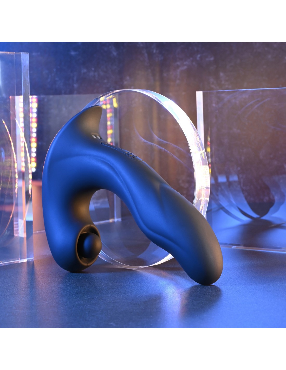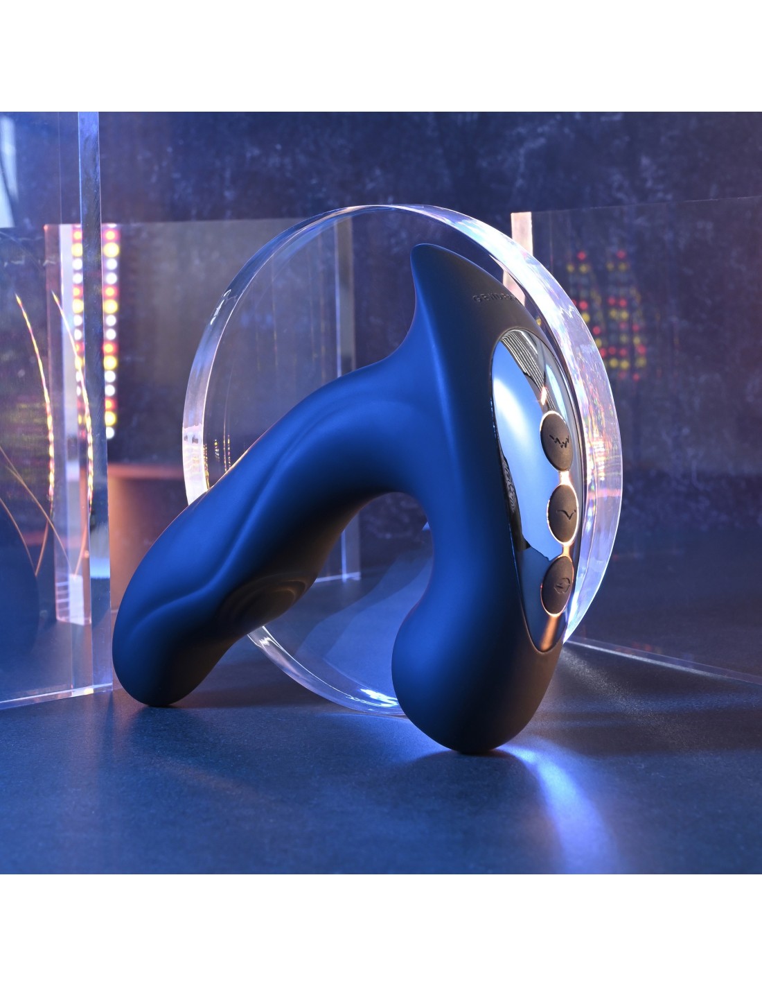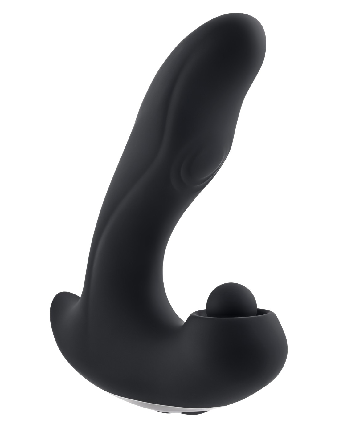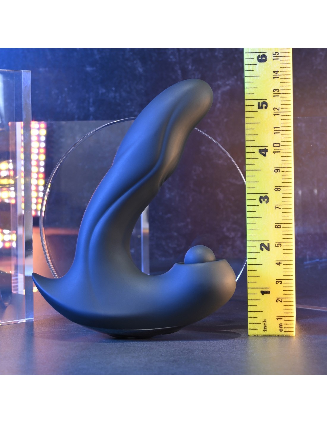 Esta forma robusta bien diseñada cuenta con 3 motores distintos que funcionan de forma independiente para una máxima flexibilidad de combinaciones y experiencia. El eje principal tiene textura y ángulo con vibración de 10 velocidades en el cabezal y una intensa función de golpeteo de 5 velocidades a mitad de camino. La base ergonómica, que tiene un panel de control de 3 botones debajo, sostiene una bola pulsante de 5 velocidades en el extremo de su punta robusta. Completamente sumergible en agua, fácil de limpiar y recargable por USB.