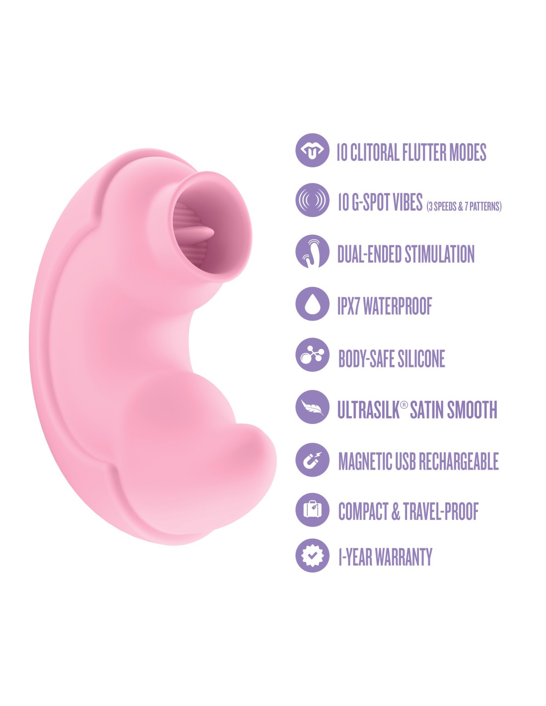 Revel in pleasure and style with Play With Me Pout & Play. Disguised as a sleek beauty case complete with a built-in mirror, this chic and flirty dual-ended vibrator is designed for moments of pure indulgence wherever you are. One end features a precision tip that’s perfect for G-spot stimulation, while the other offers tongue-inspired fluttering sensations for clitoral play, each with 10 customizable settings to suit your every desire. Crafted from premium body-safe silicone and finished with our signature UltraSilk® touch, Pout & Play glides effortlessly against the skin for a smooth, sensual experience. Its IPX7 waterproof design allows for playful possibilities beyond the bedroom, and the USB rechargeable feature ensures it’s always ready when you are. Discreet, portable, and irresistibly elegant, Pout & Play is essential for pleasure that fits seamlessly into your lifestyle.