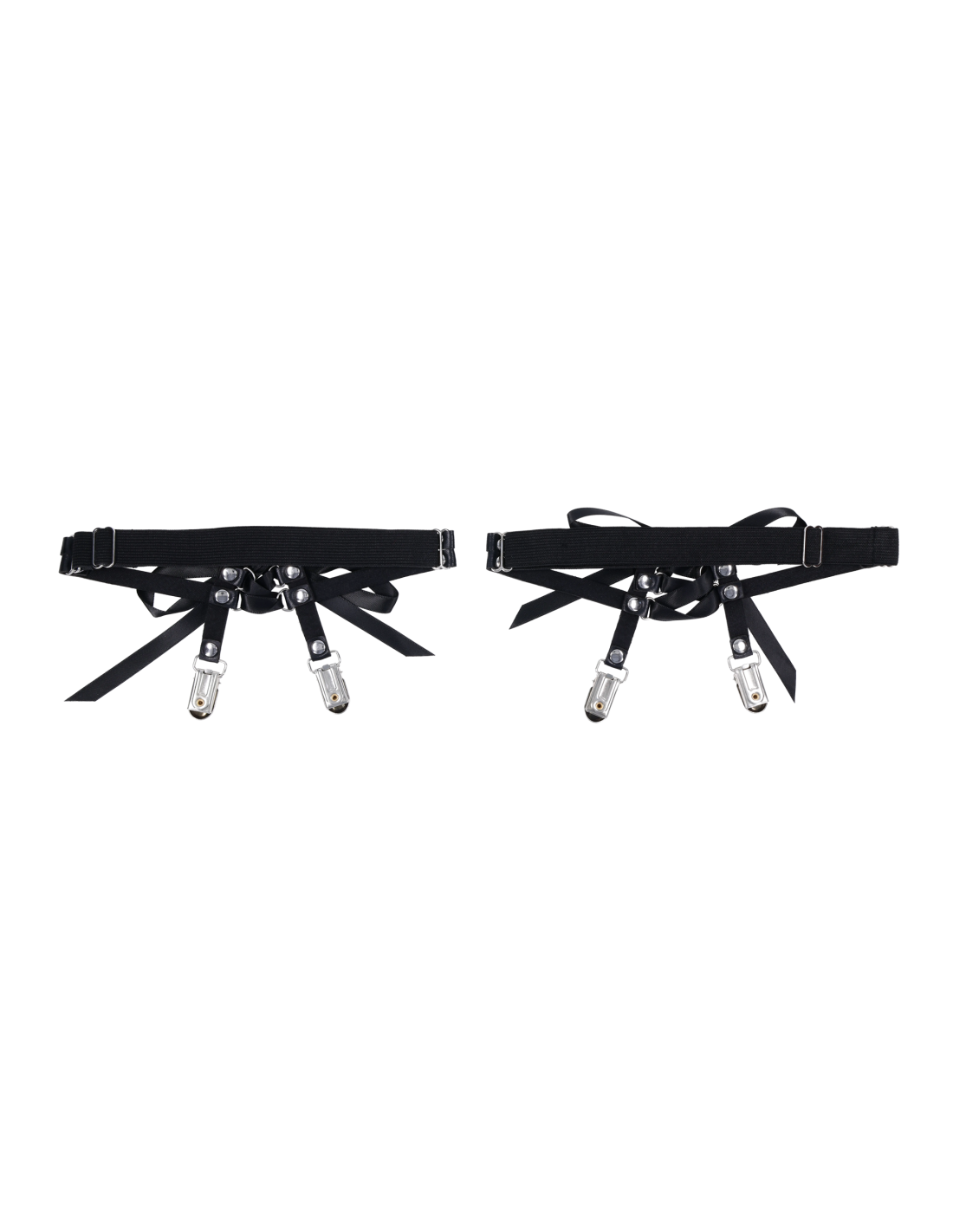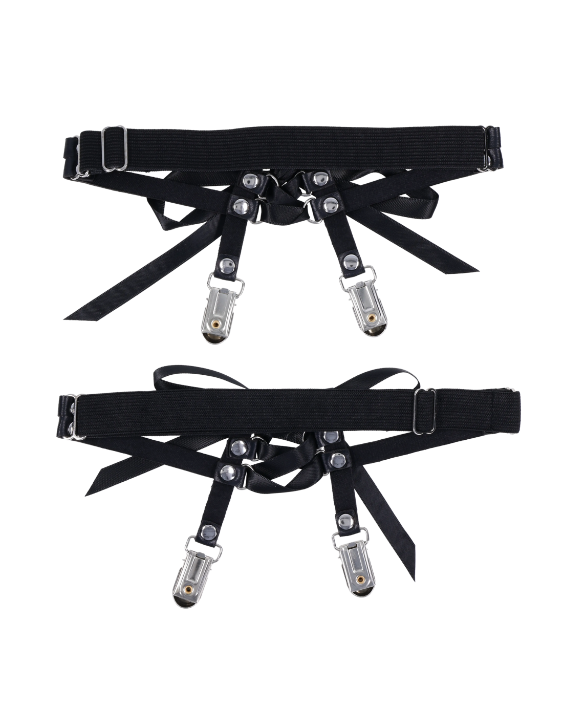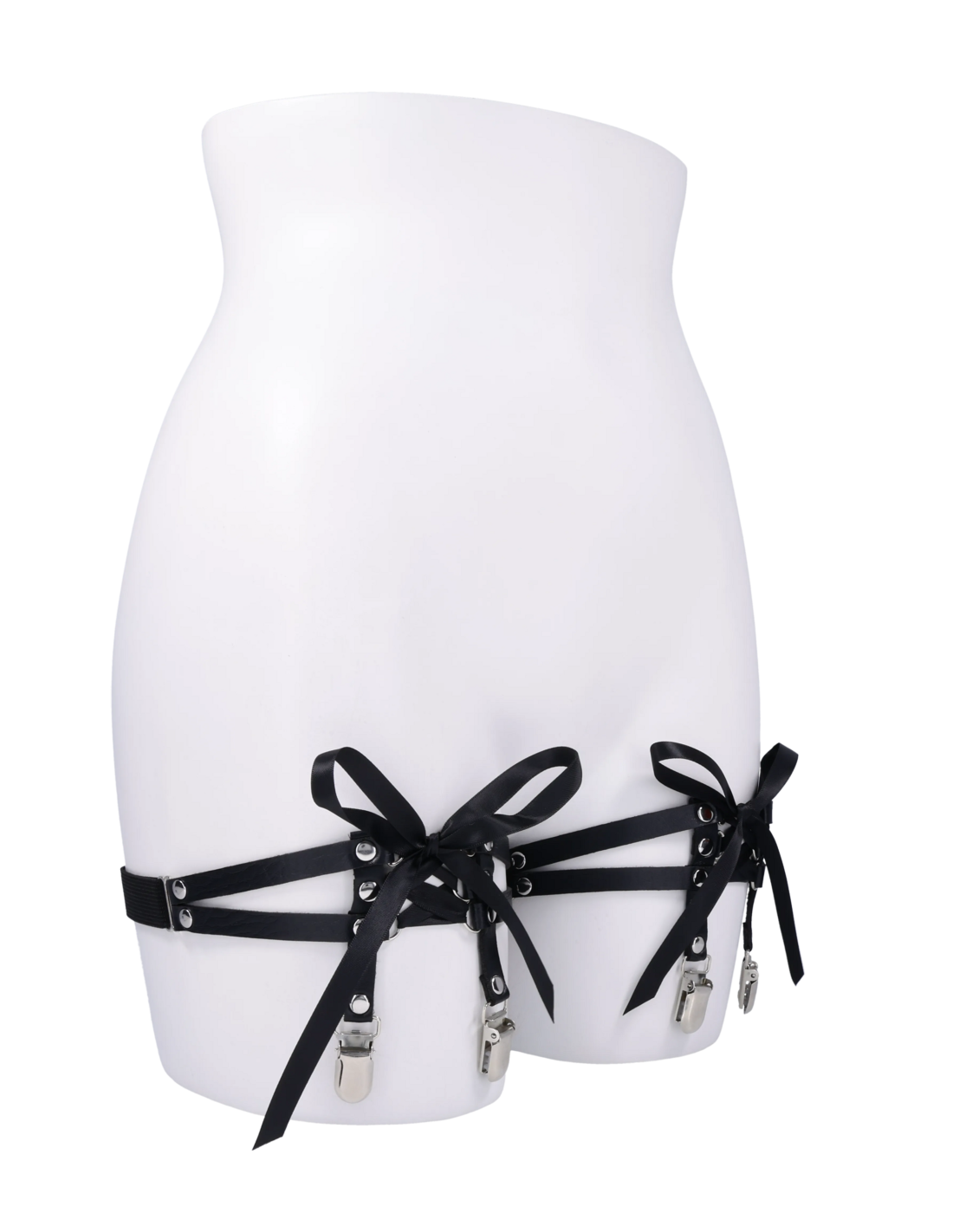 Add a touch of flirtatious elegance with these captivating garters, featuring a sultry lace-up corset design. Black satin ribbon weaves through the faux leather panels, creating an adjustable fit that hugs your thighs with seductive precision. A secure clip keeps thigh-high stockings perfectly in place, while the combination of bold structure and soft satin details strikes the perfect balance between edgy and romantic. Whether you're embracing your daring side or indulging in a moment of sensual confidence, these garters are designed to make a statement