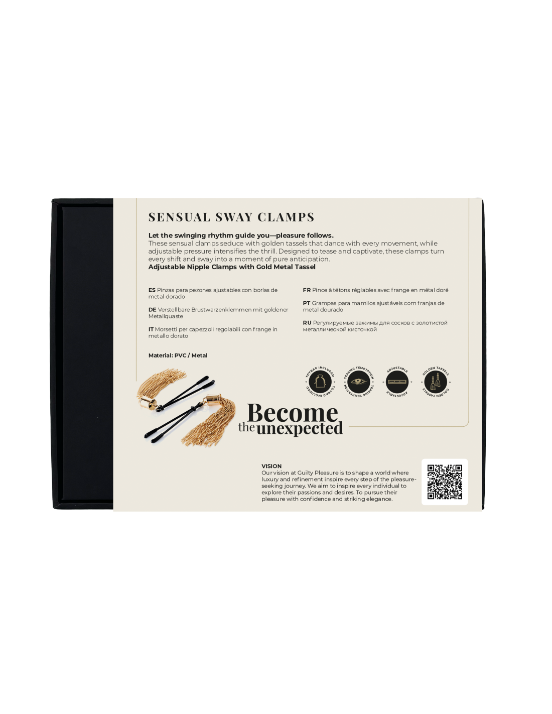 The Sensual Sway Clamps turn subtle restraint into an alluring performance. With elongated clamp arms and shimmering gold-toned tassels, this elegant duo offers a balance of tailored pressure and mesmerizing movement. Each sway is deliberate, drawing the eye and heightening every sensation — a visual and tactile invitation to indulge in slow, rhythmic play.