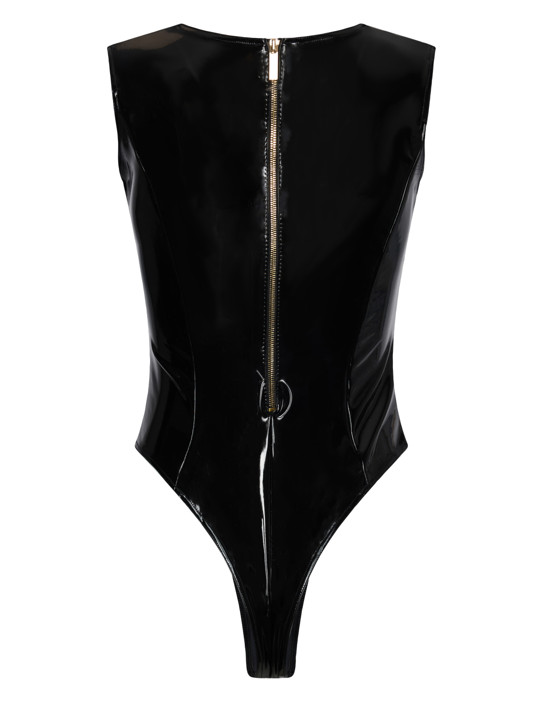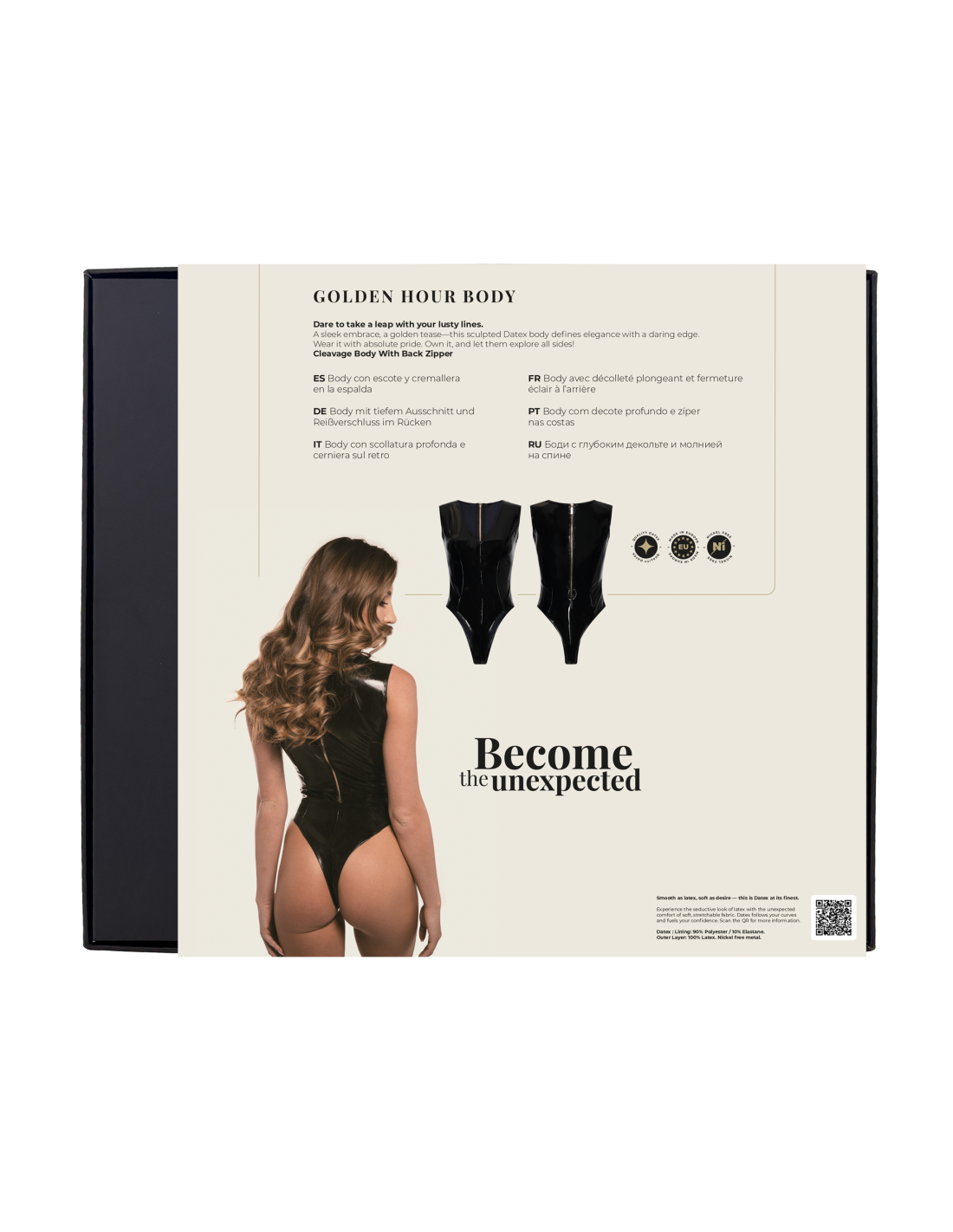 The gold-toned back zipper adds a sleek finishing touch — part closure, part statement — while the soft inner fabric ensures a comfortable fit that feels like a second skin. Whether worn as an eye-catching outfit centerpiece or as an intimate expression behind closed doors, the Golden Hour Body is made to be seen, remembered, and desired.