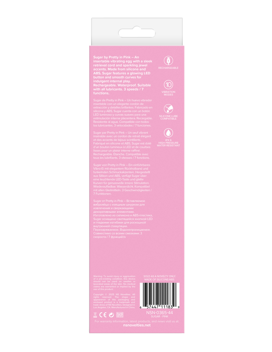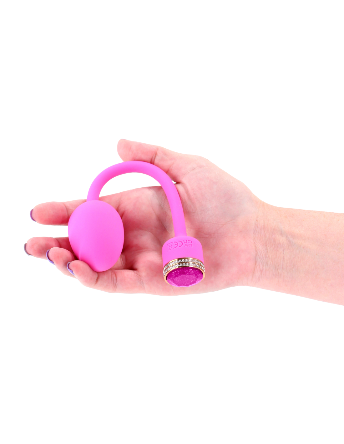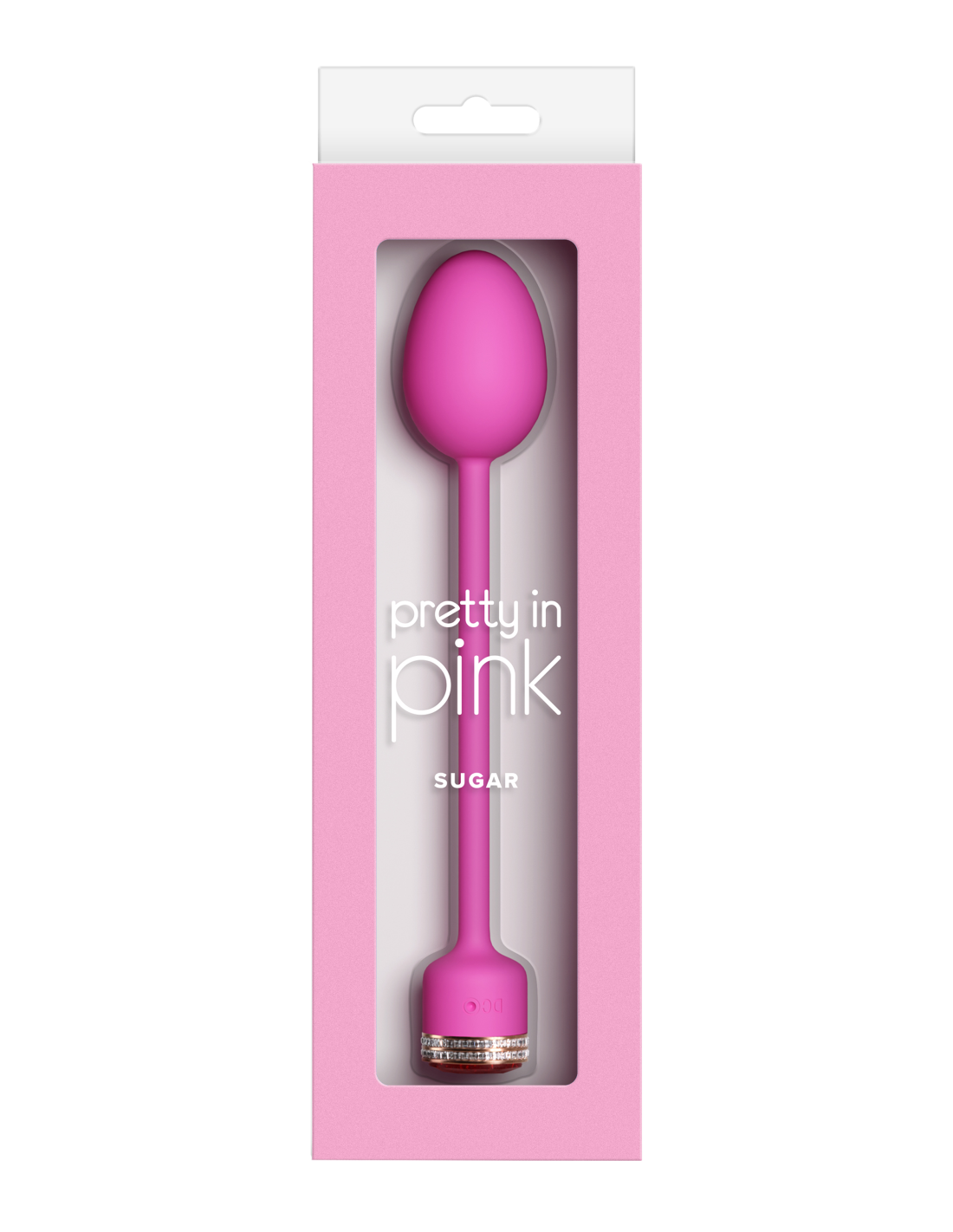 Sugar by Pretty in Pink – An insertable vibrating egg with a sleek retrieval cord and sparkling jewel accents. Made from silicone and ABS, Sugar features a glowing LED button and smooth curves for indulgent internal play. Rechargeable. Waterproof. Suitable with all lubricants. 3 speeds / 7 functions.